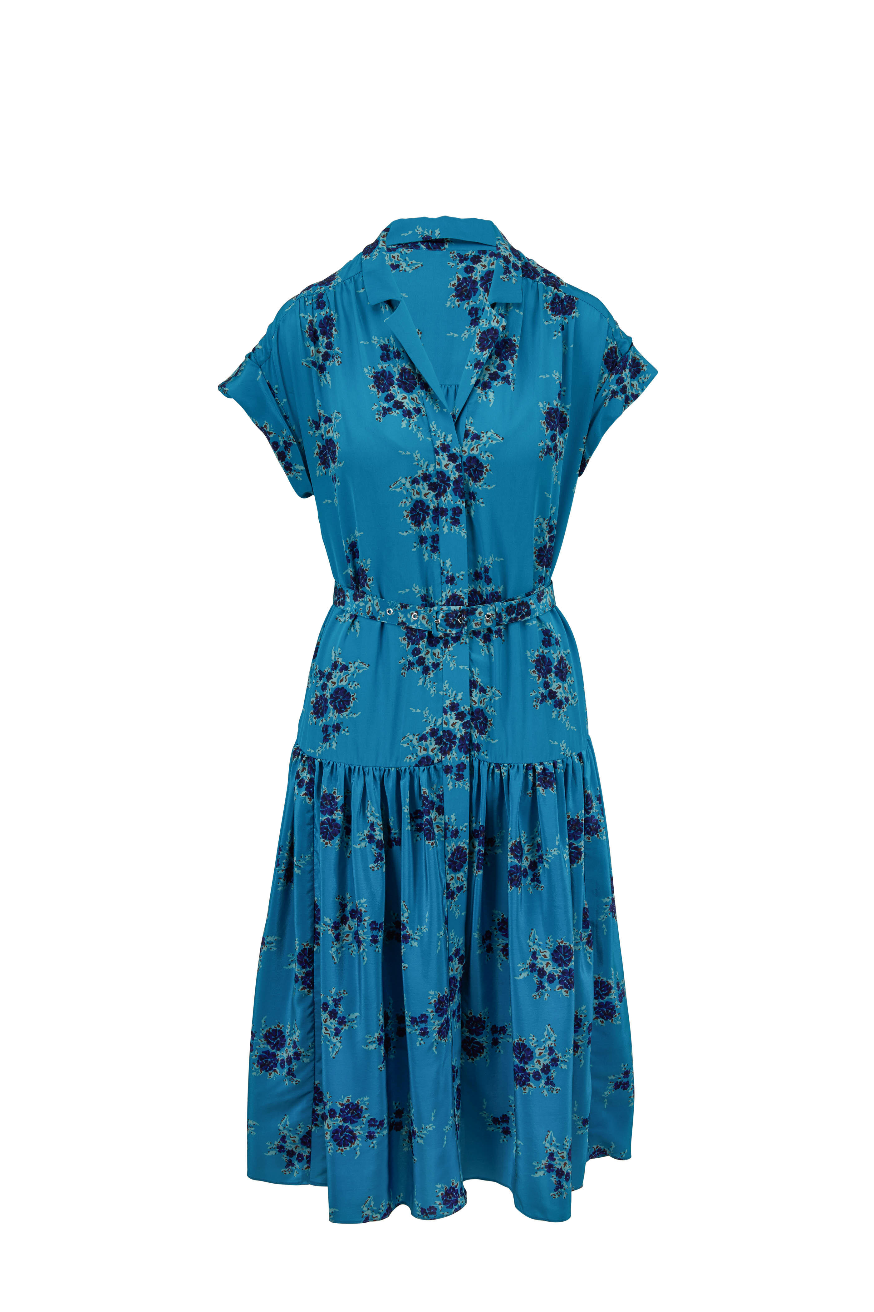 Notched lapel. Concealed button front placket. Cap sleeves; fold-over cuffs. Pleated drop waist; self belt. Imported. 44" shoulder to hem. 100% silk; partially lined. Dry clean.