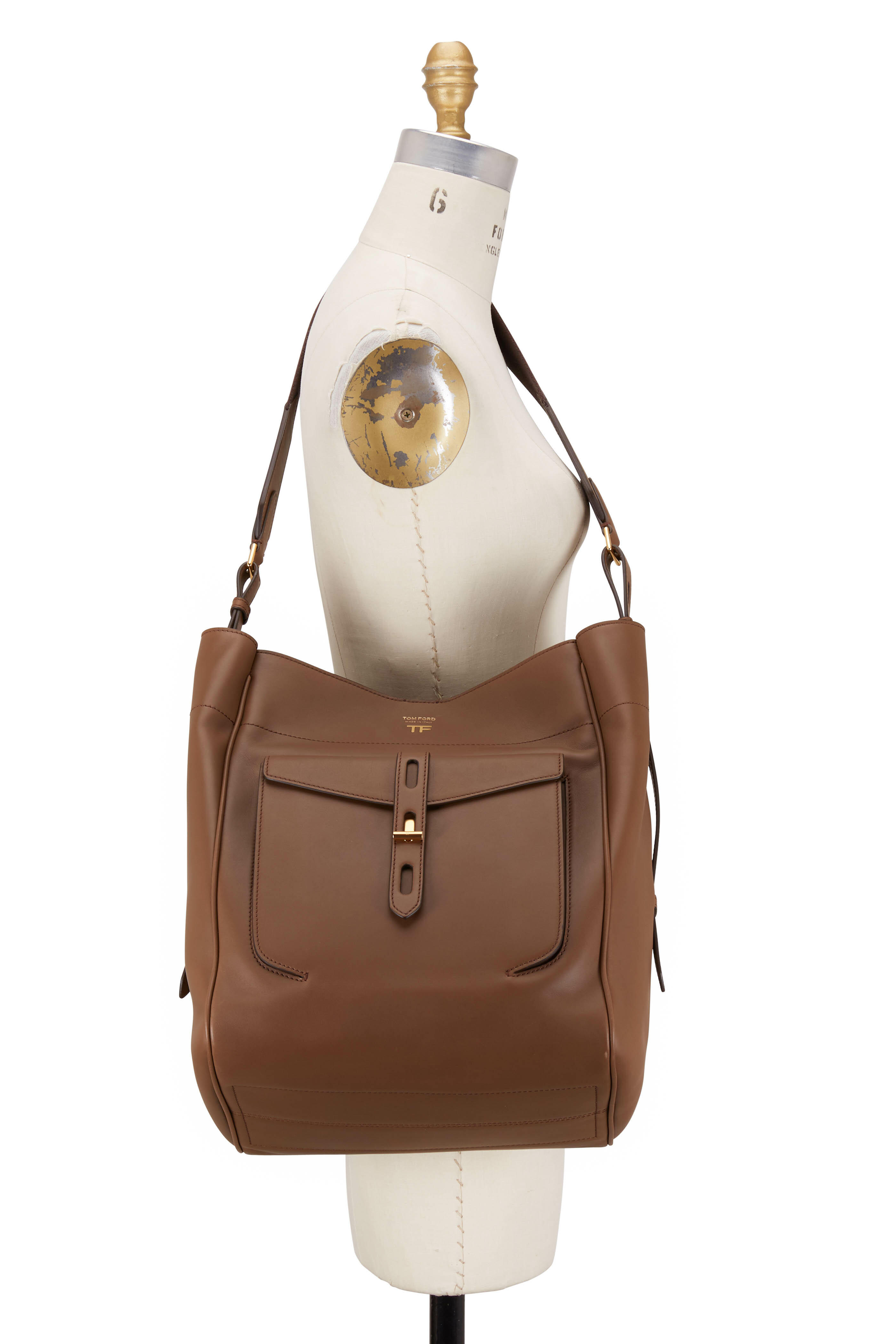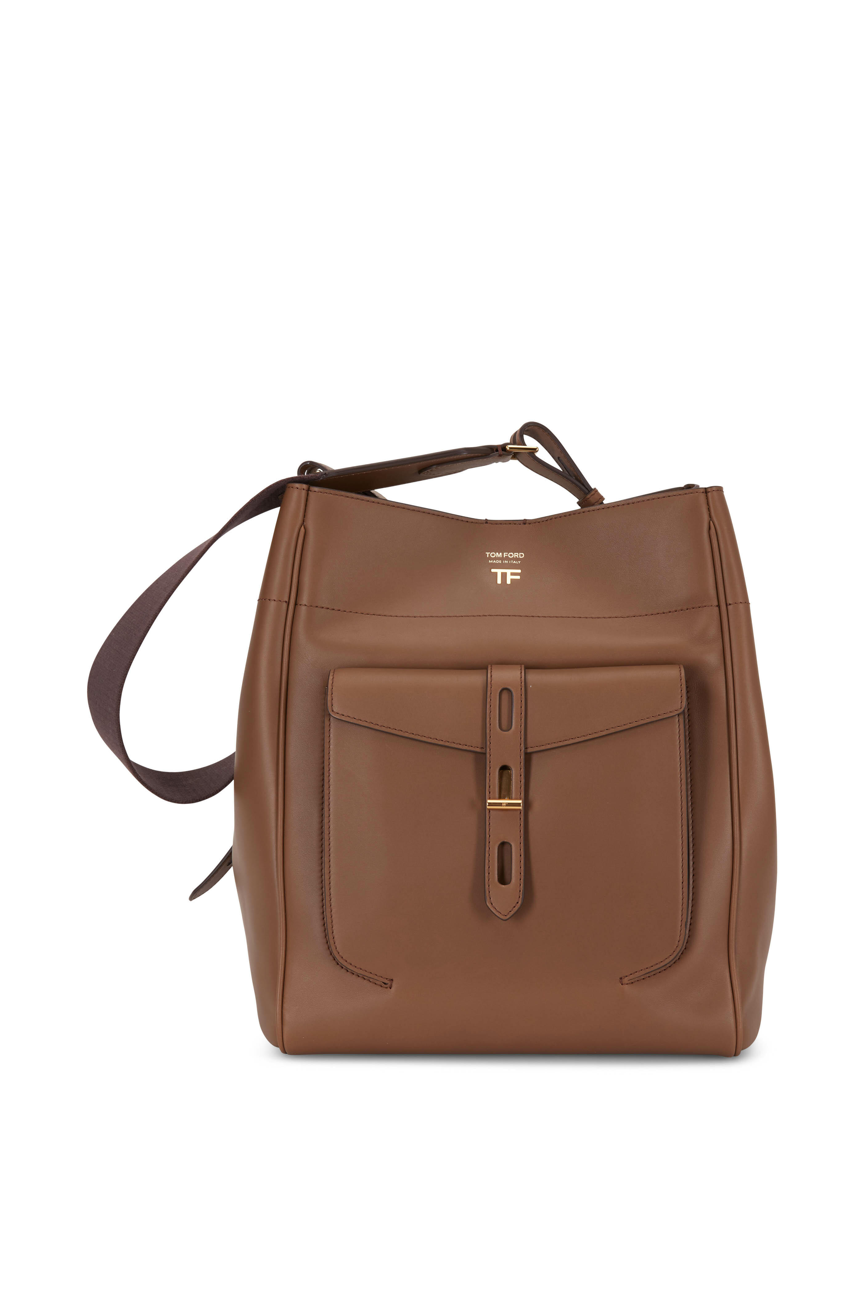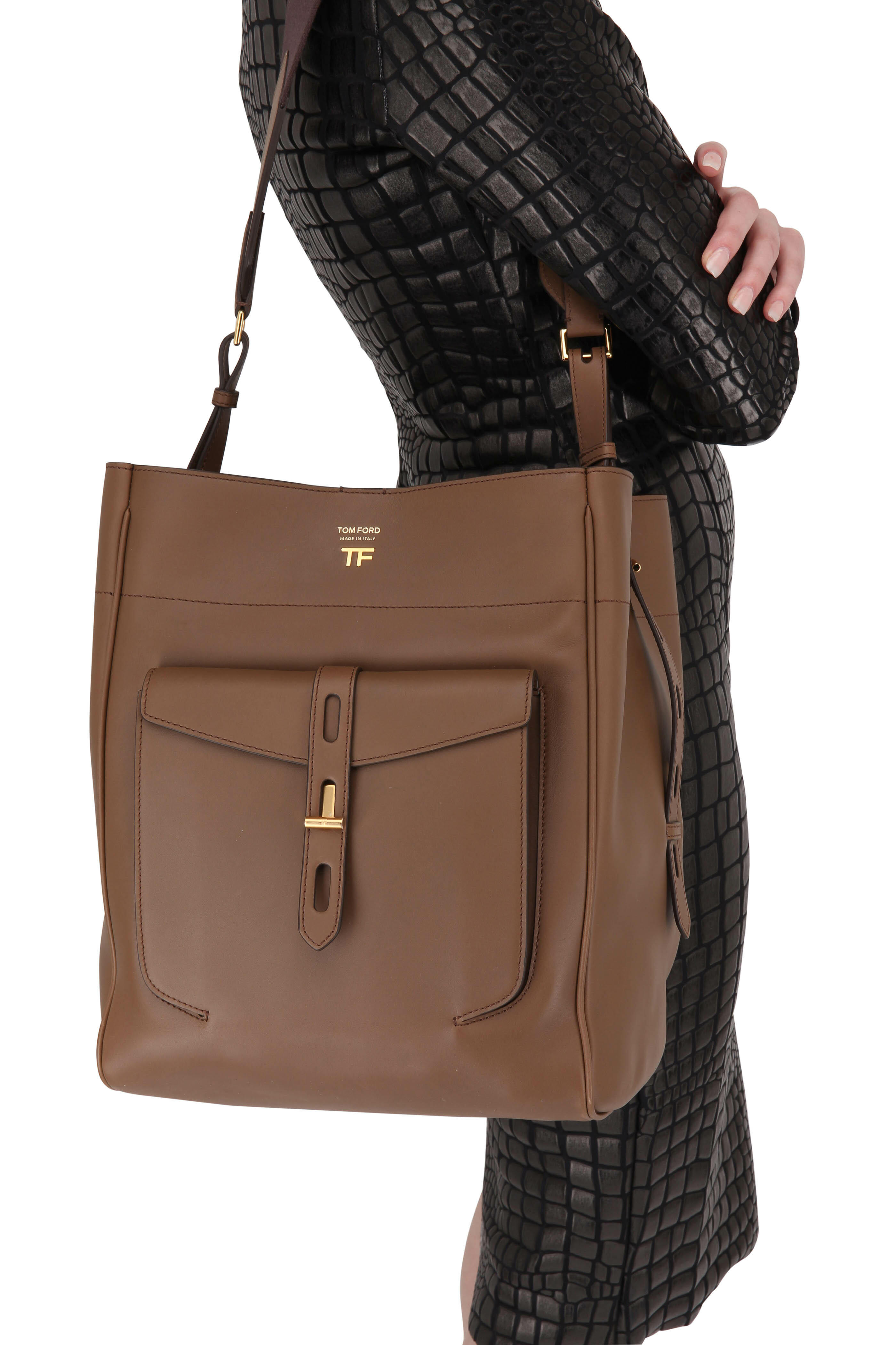 Hollywood leather. Adjustable cotton webbing shoulder strap; straps with die cutted sides. Center snap-tab closure. Front pocket with new signature T hardware closure. Front engraved TF logo. Two interior open pockets, one internal zip pocket. Unlined. Made in Italy. Width: 14". Height: 17". Depth: 4". Adjustable strap drop: 10".