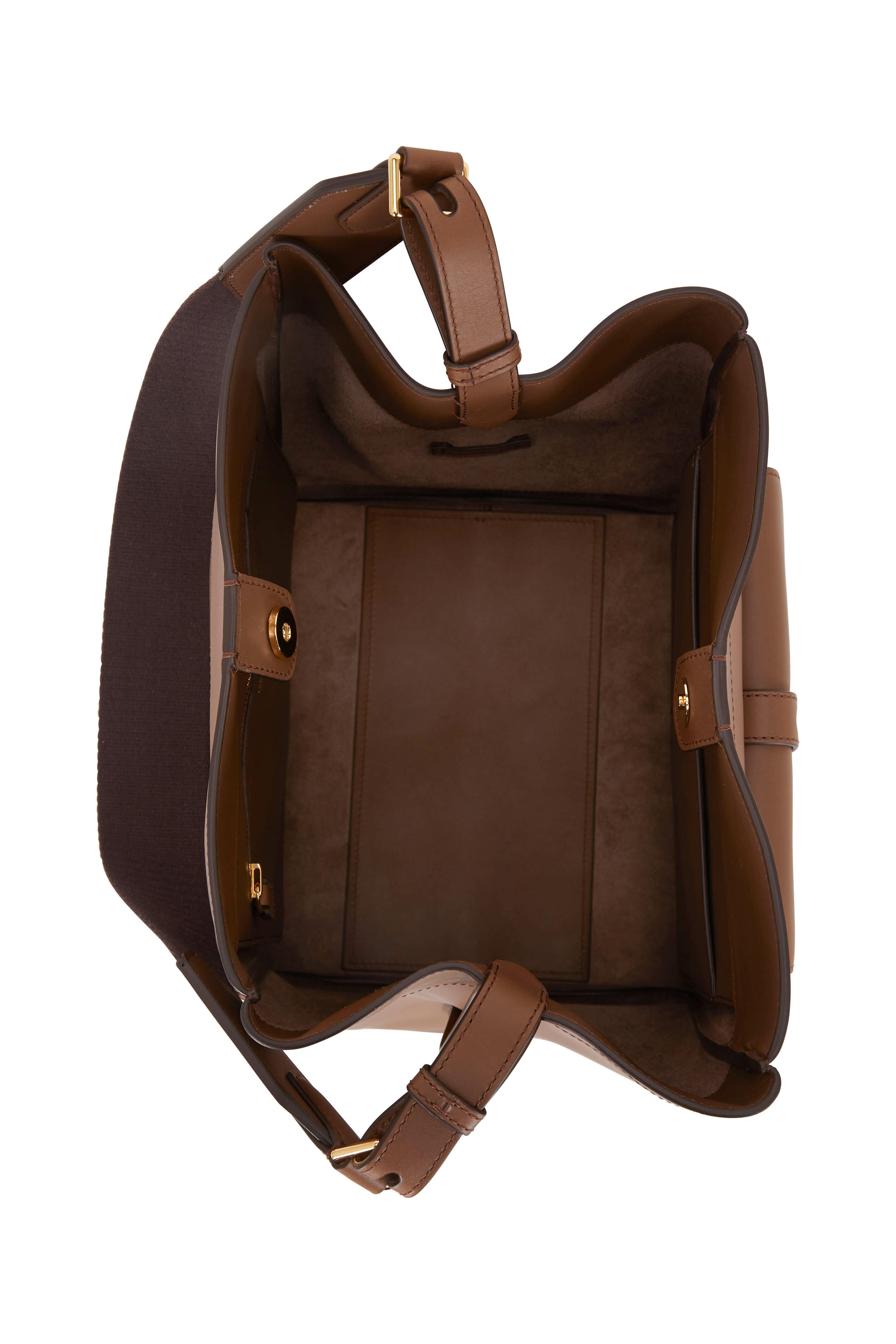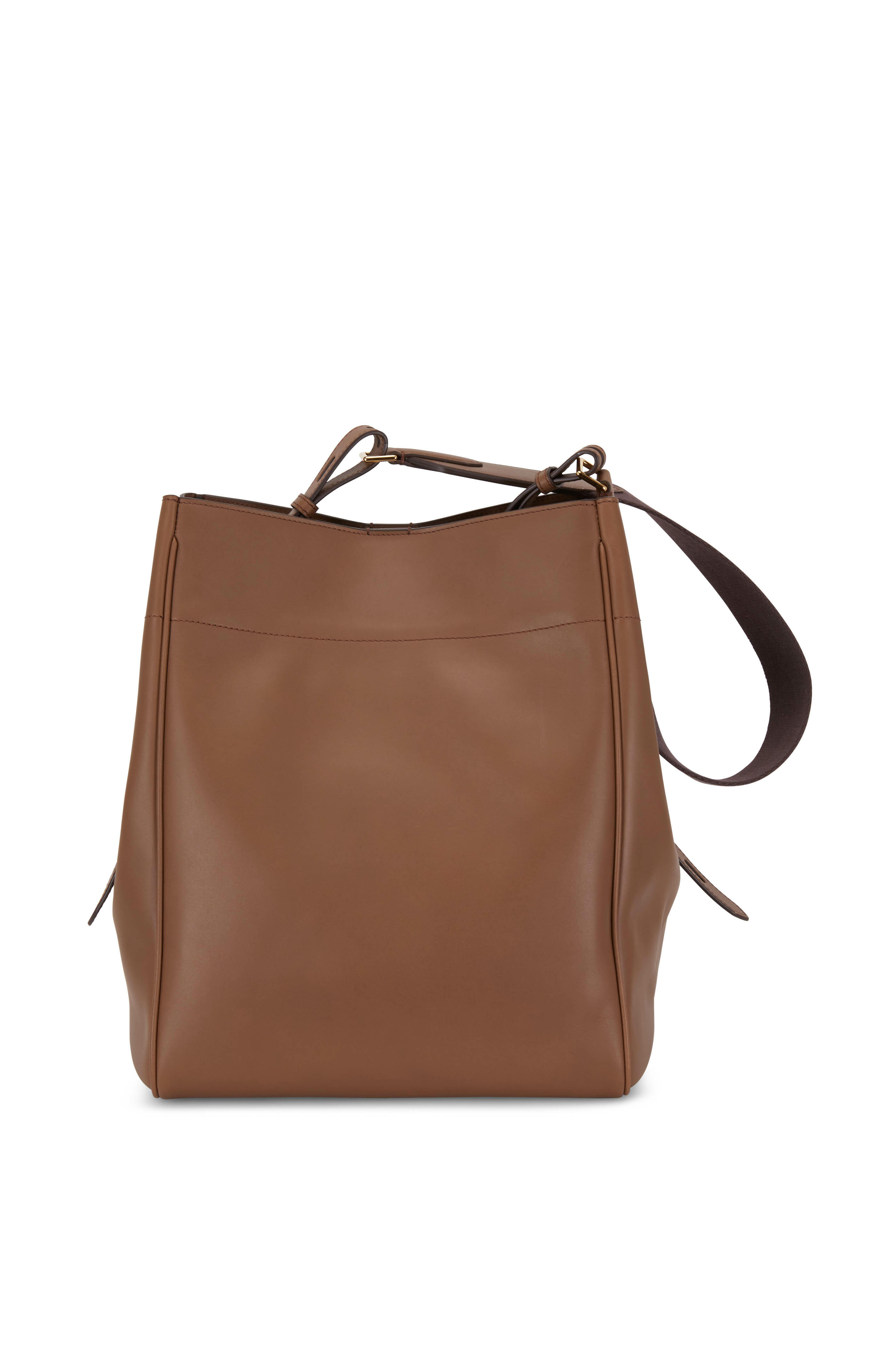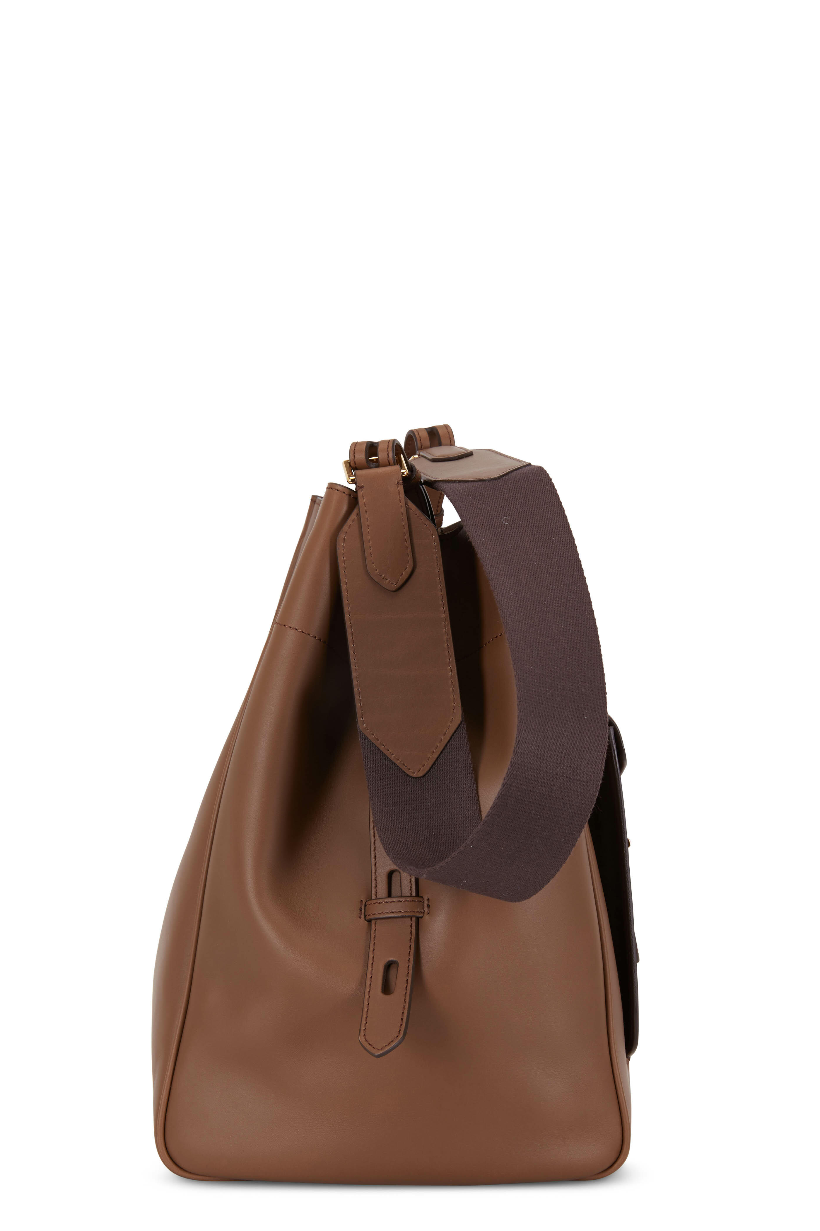 Hollywood leather. Adjustable cotton webbing shoulder strap; straps with die cutted sides. Center snap-tab closure. Front pocket with new signature T hardware closure. Front engraved TF logo. Two interior open pockets, one internal zip pocket. Unlined. Made in Italy. Width: 14". Height: 17". Depth: 4". Adjustable strap drop: 10".