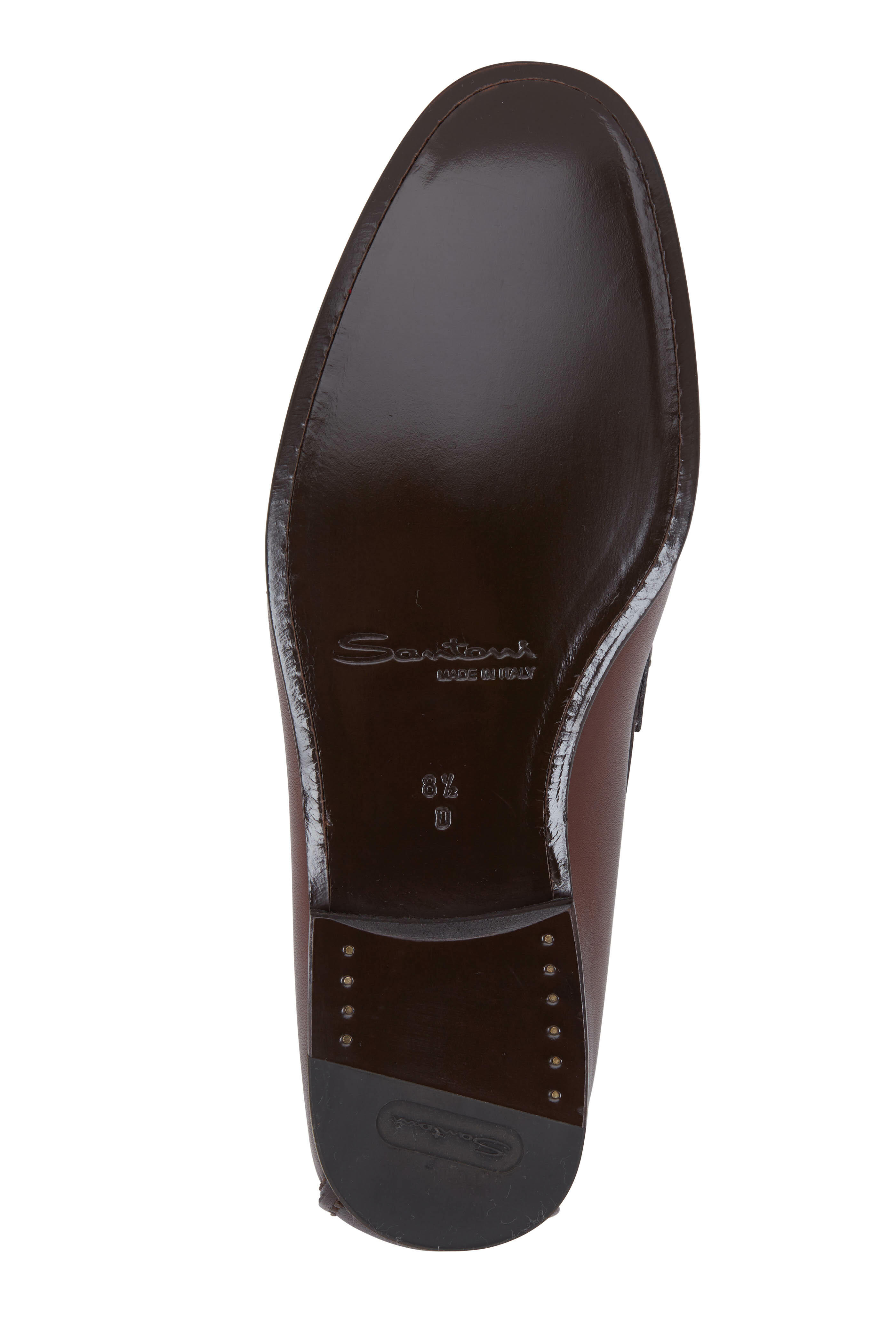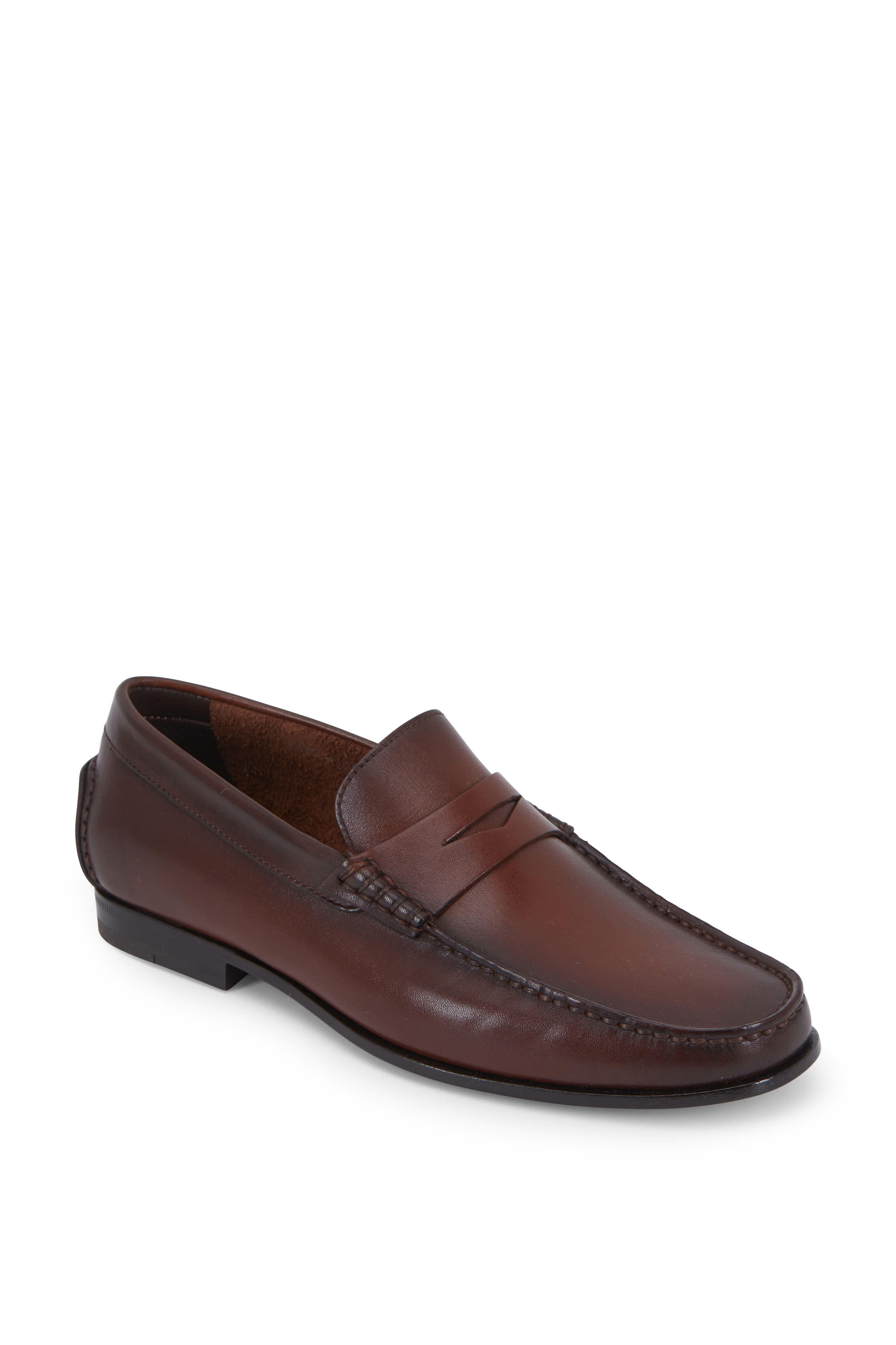 Burnished calfskin leather upper. Moc toe. Penny strap across vamp. Tonal top-stitching detail. Unlined, cushioned insole. Stacked heel. Leather sole. Made in Italy.