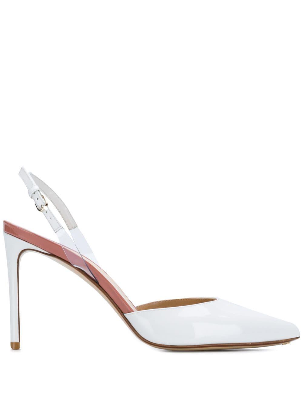 Patent leather and pvc upper. Pointed toe. Slingback with adjustable buckle. Leather insole. Self-covered heel. Leather sole. Made in Italy. Heel measurement: 90mm (3 ½").