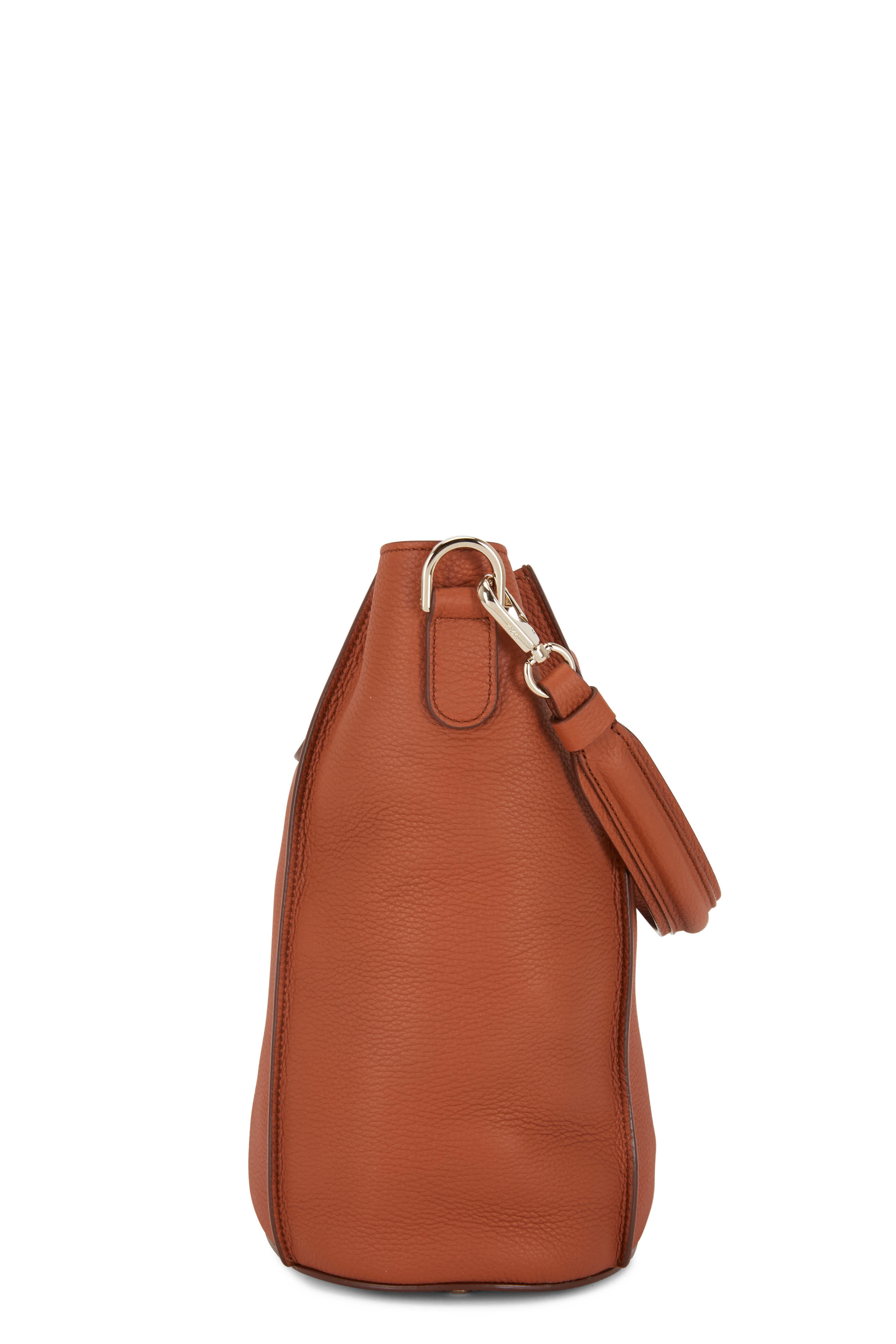 Grained calfskin leather. Detachable top handle. Detachable and adjustable strap. Top center strap with leather and leather pull. Detachable zip pouch pocket. Lined in suede. Protective metal feet. Made in Italy. Width: 8 ½". Height: 10". Depth: 6". Detachable handle drop: 8". Detachable and adjustable strap drop: 18".