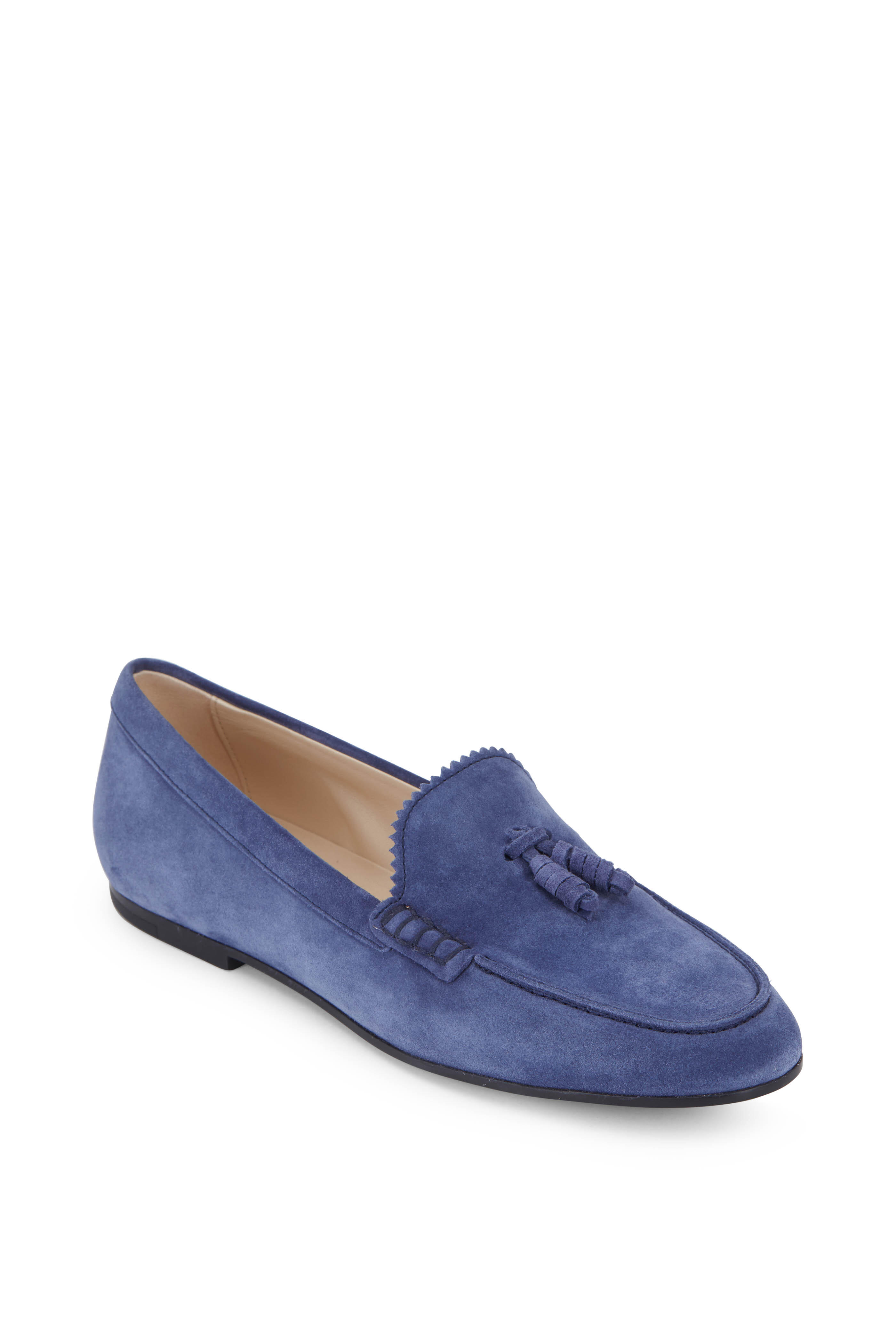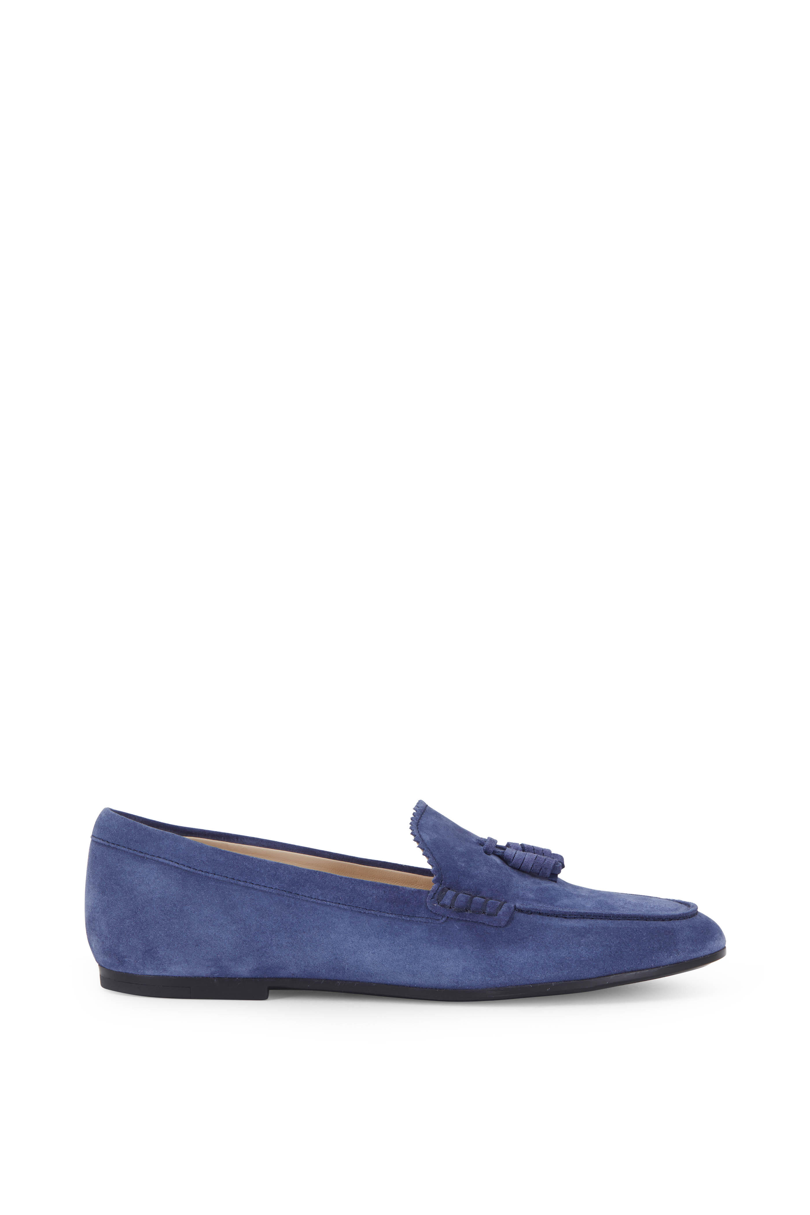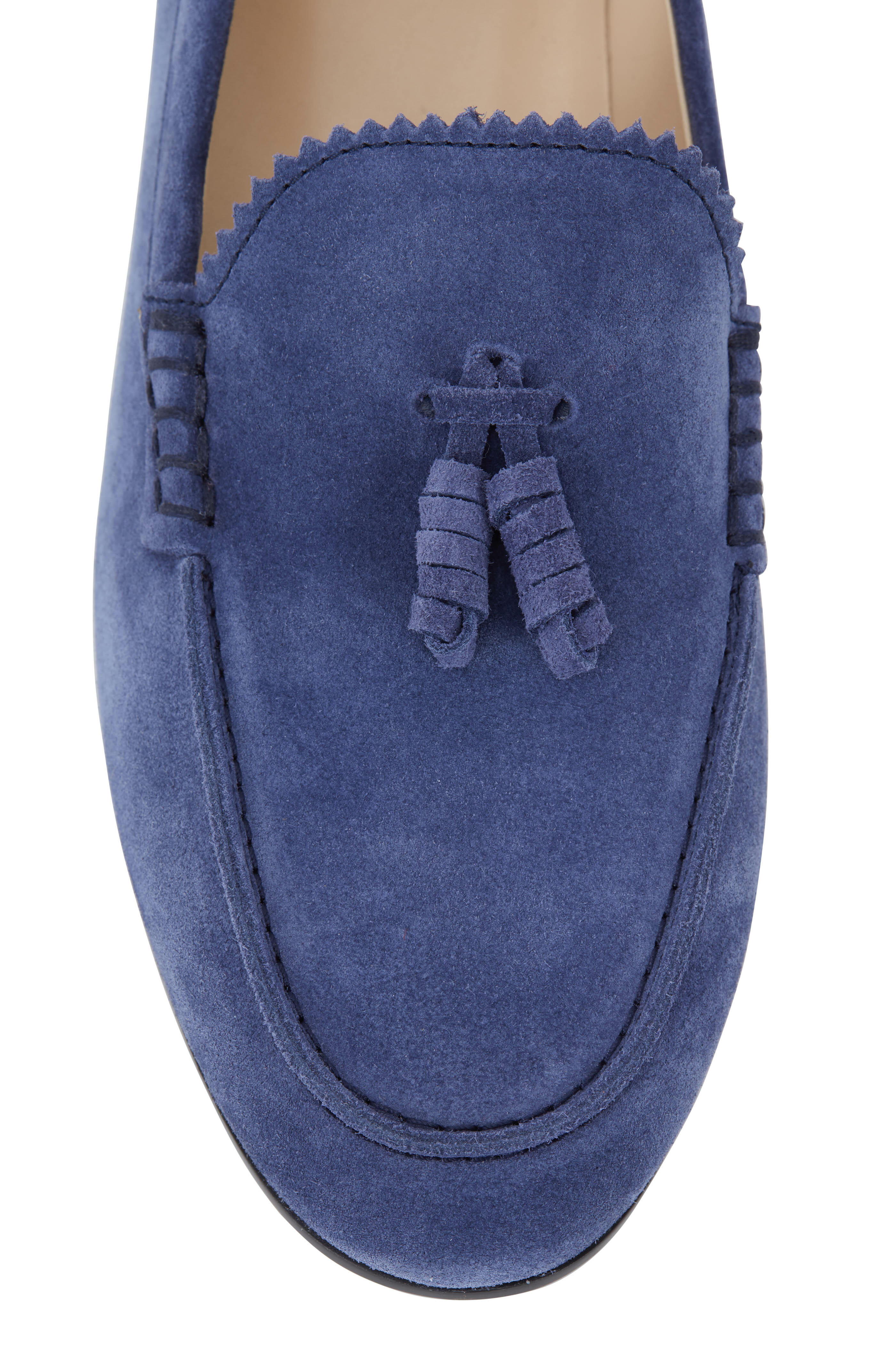 Calfskin suede upper. Moc toe. Tonal top-stitching. Tassel detail. Notched vamp with scallop edges. Leather lining, cushioned insole. Stacked heel. Leather sole. Made in Italy.