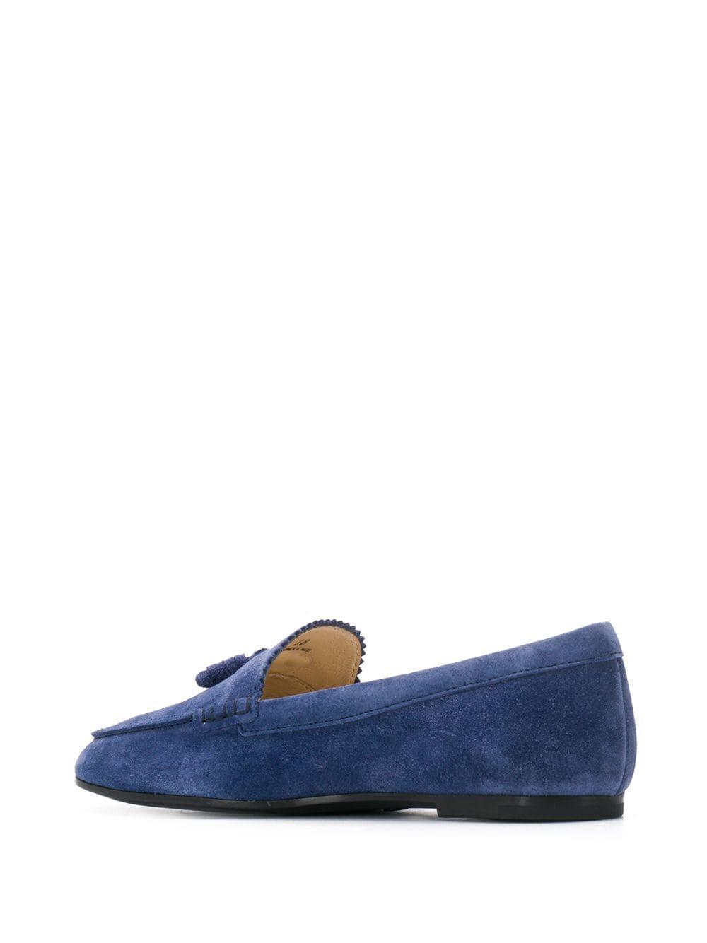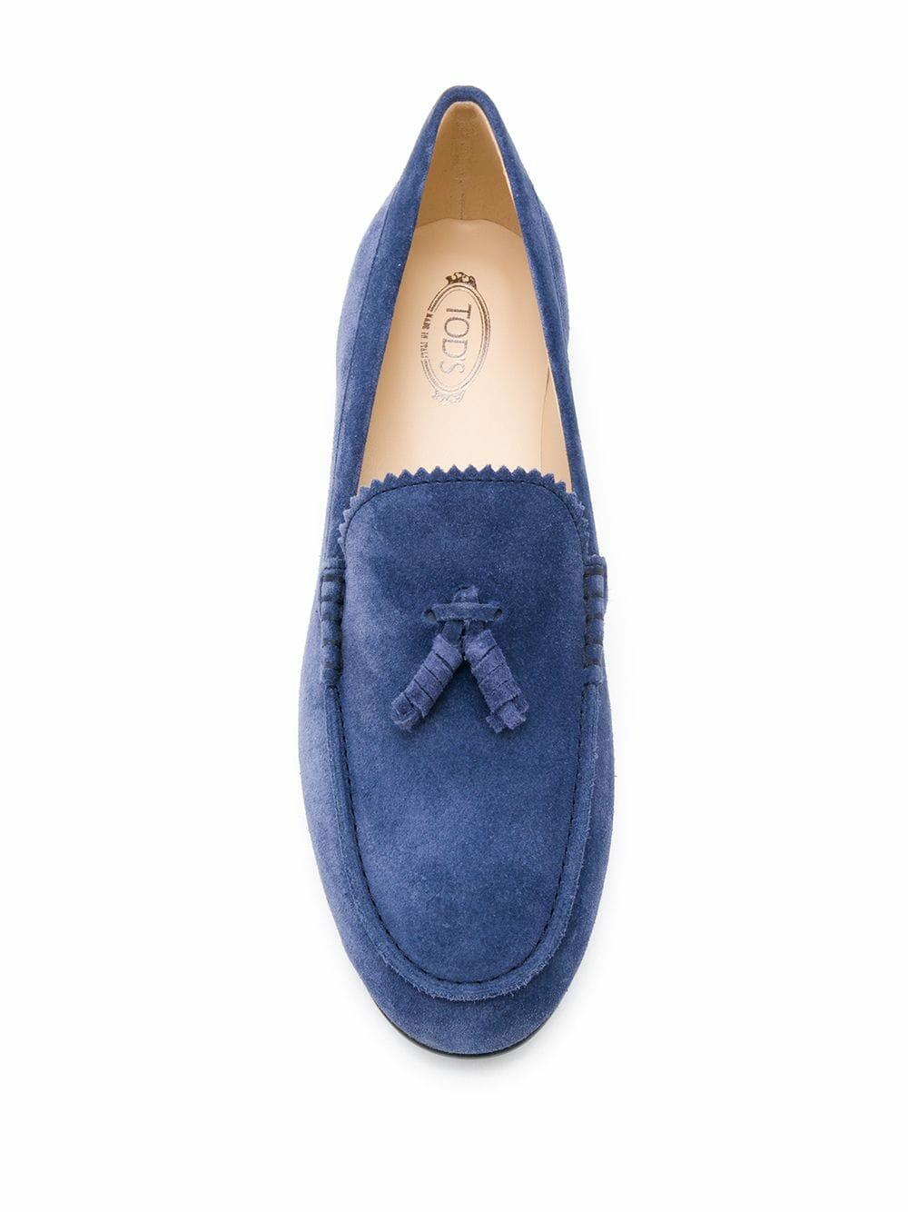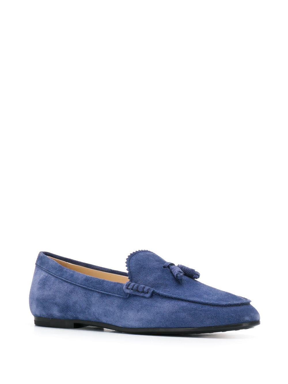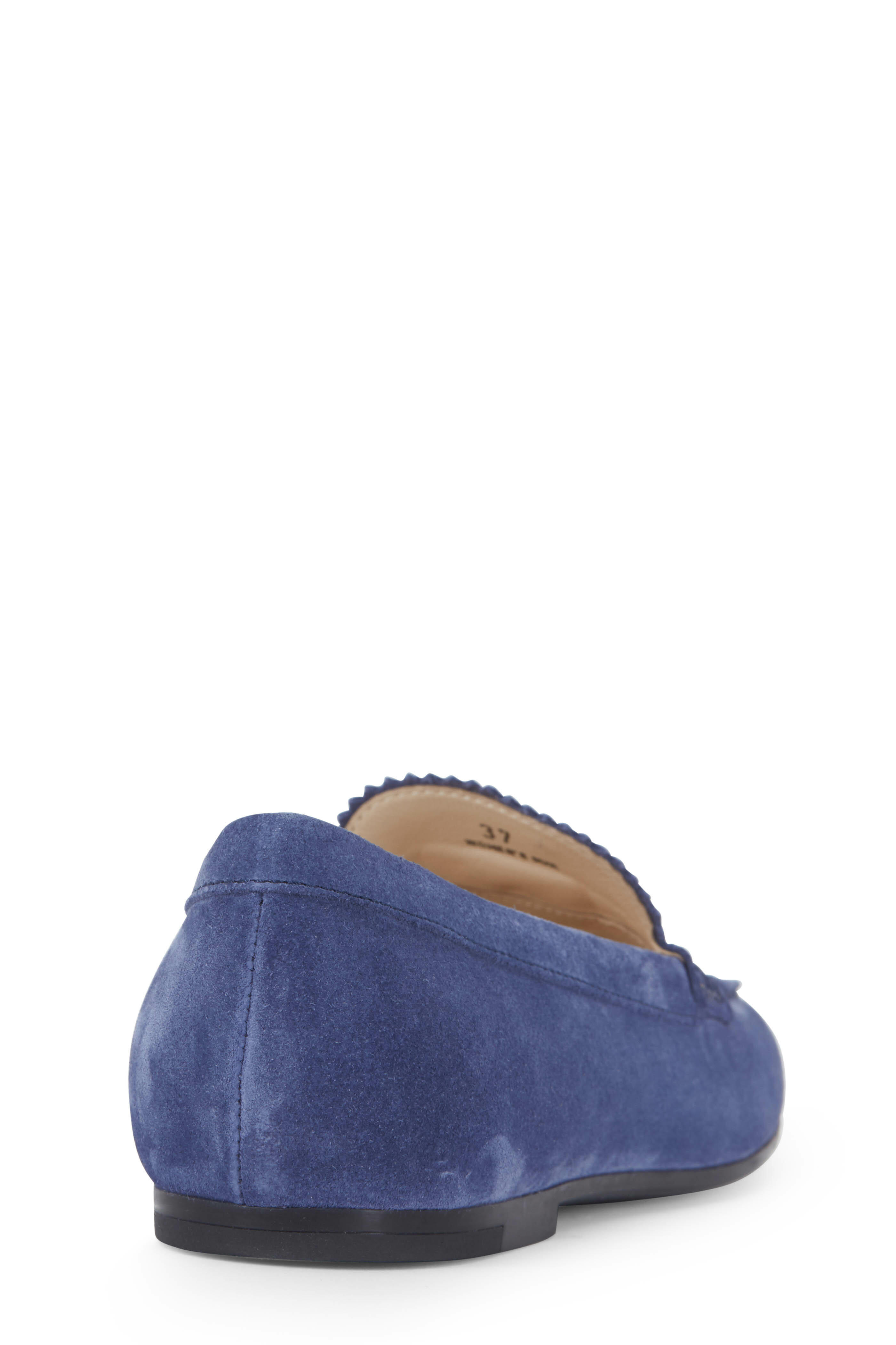 Calfskin suede upper. Moc toe. Tonal top-stitching. Tassel detail. Notched vamp with scallop edges. Leather lining, cushioned insole. Stacked heel. Leather sole. Made in Italy.