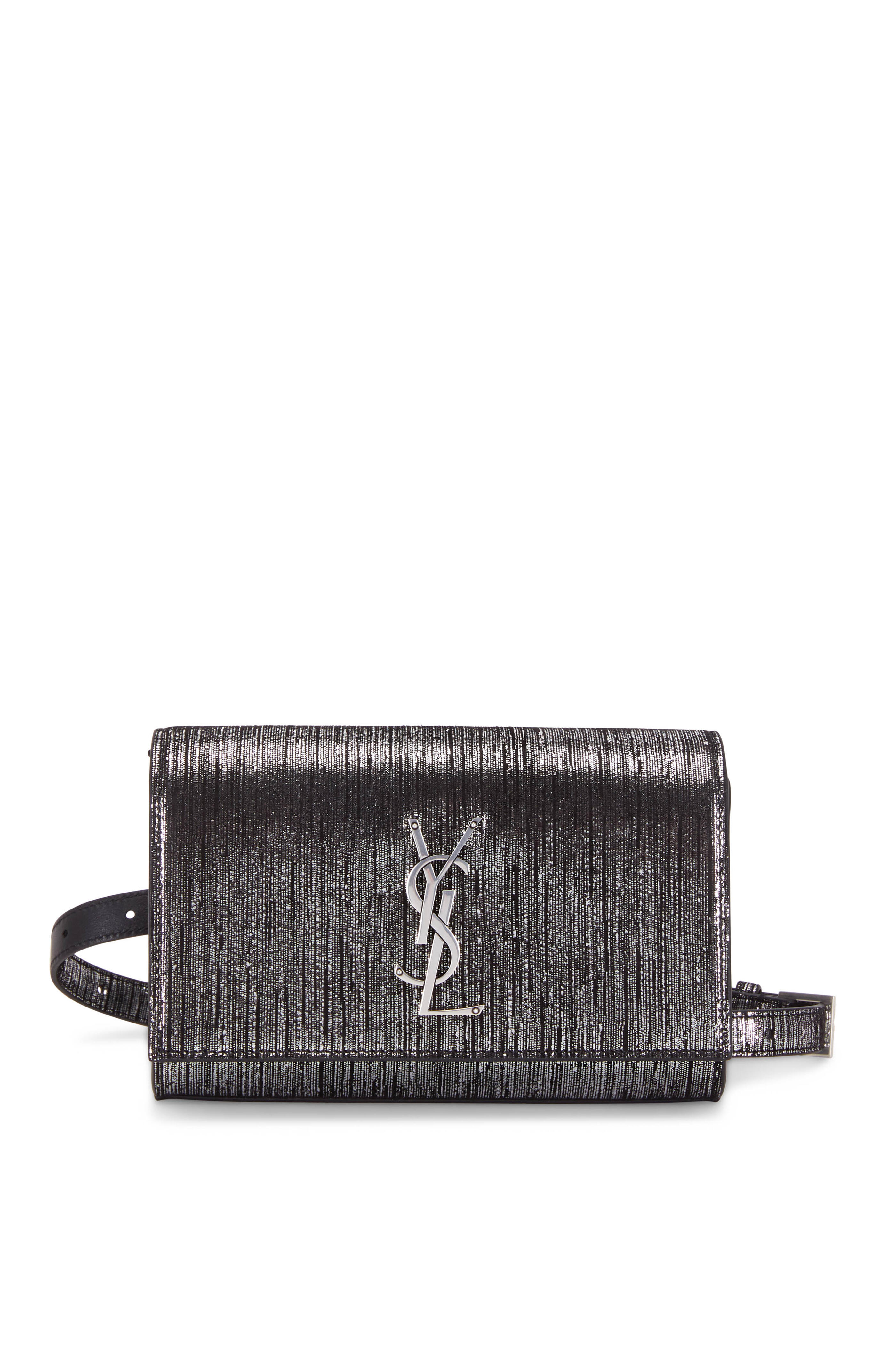 Textured metallic calfskin leather. Detachable and adjustable belt. Flap front; magnetic snap closure. Silver signature detail. One interior zip pocket, open compartment and four card slots. Lined in leather. Made in Italy. Width: 7". Height: 5". Depth: 2".