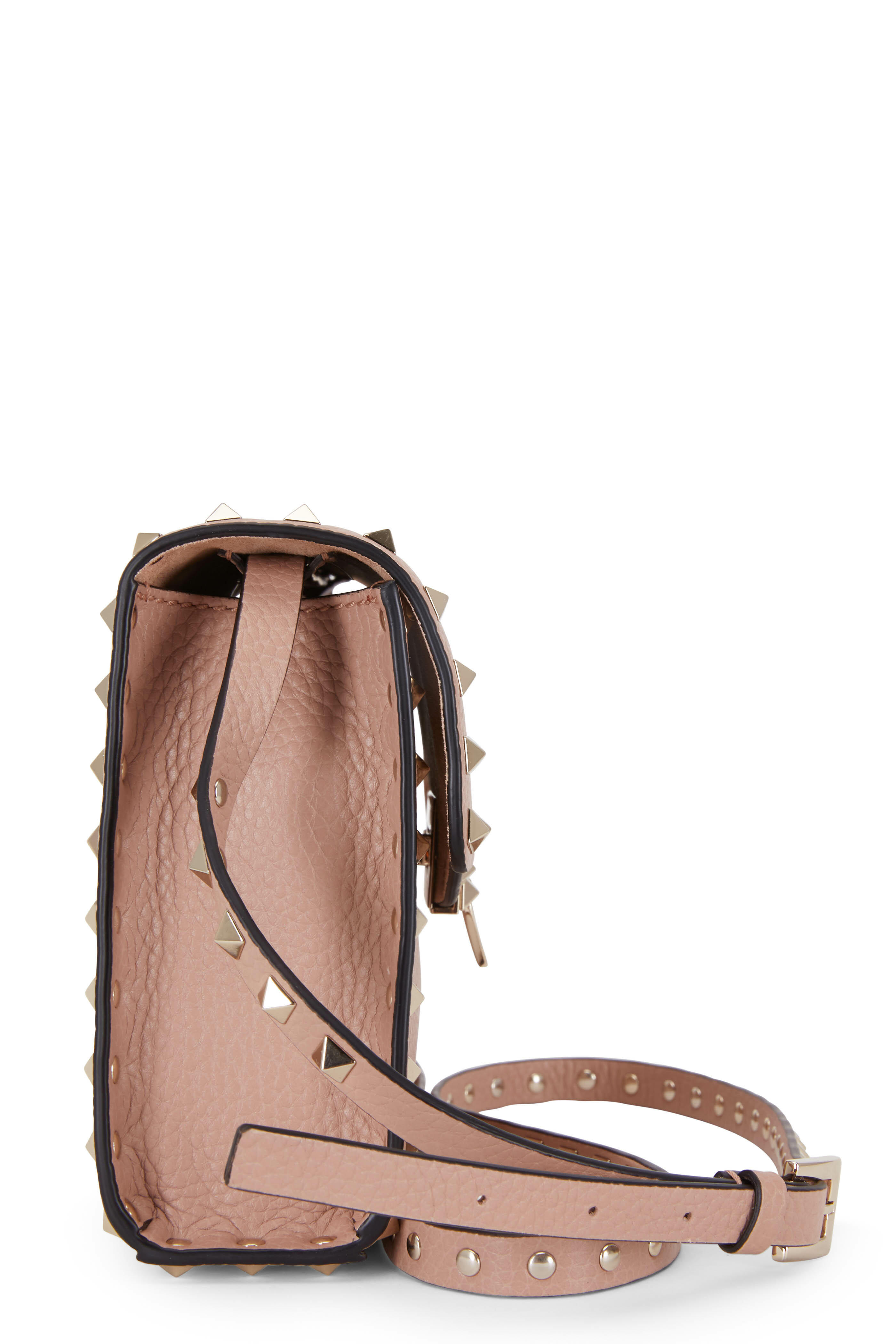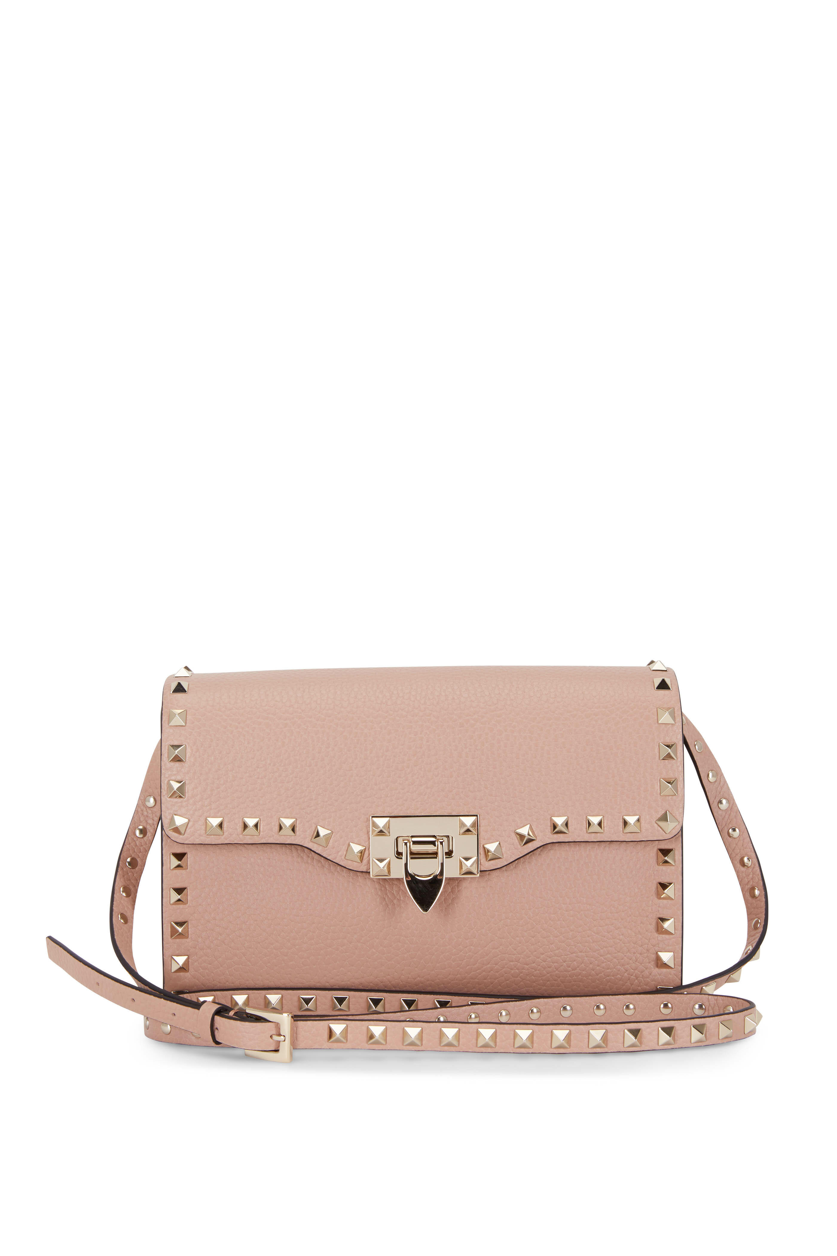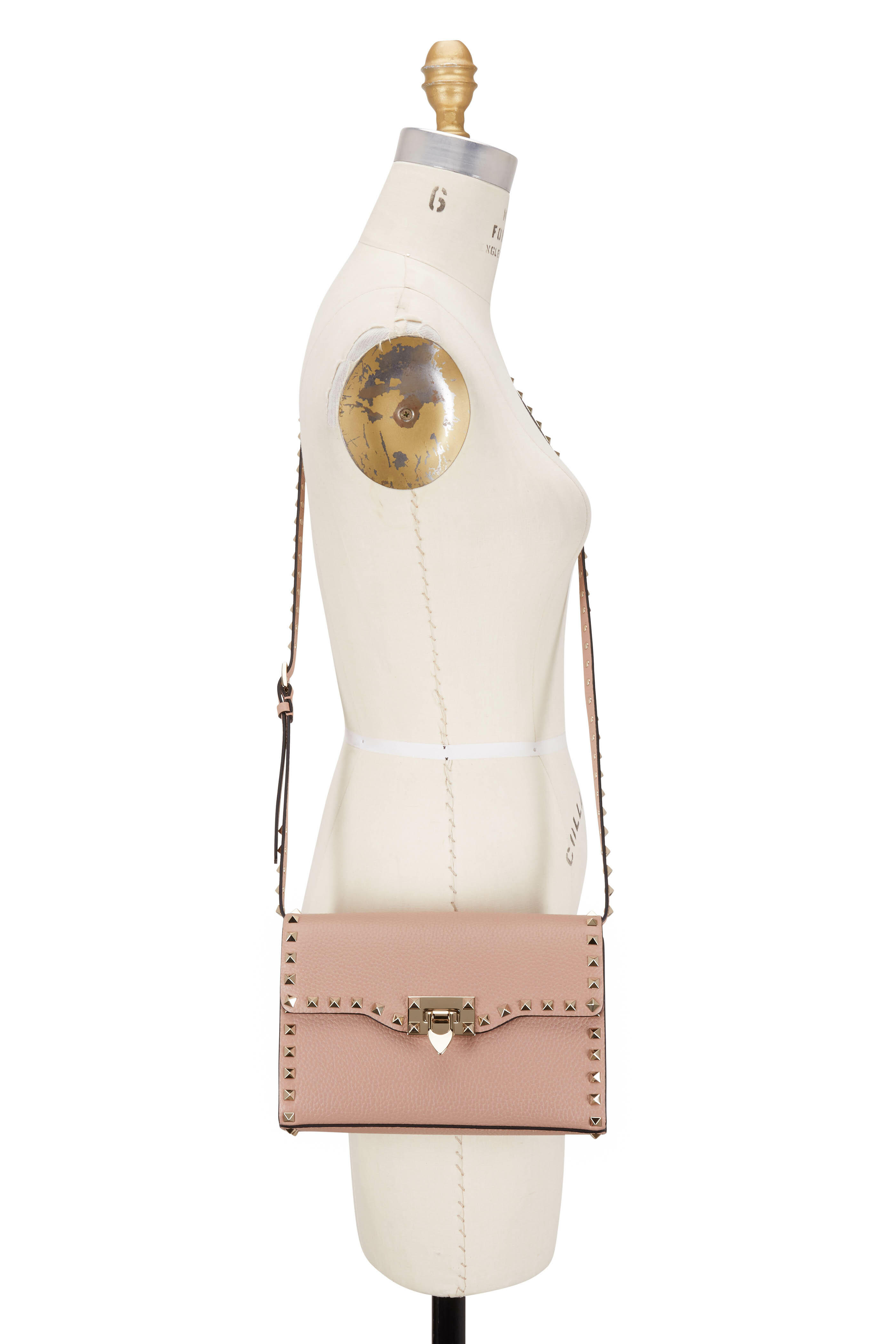 Pebbled calfskin leather. Detachable and adjustable shoulder strap. Flap front with flip lock closure. Signature gold-tone rockstud embellishment. Interior slip pocket. Lined in suede. Made in Italy. Width: 9". Height: 6". Depth: 2 ½". Strap drop: 22".