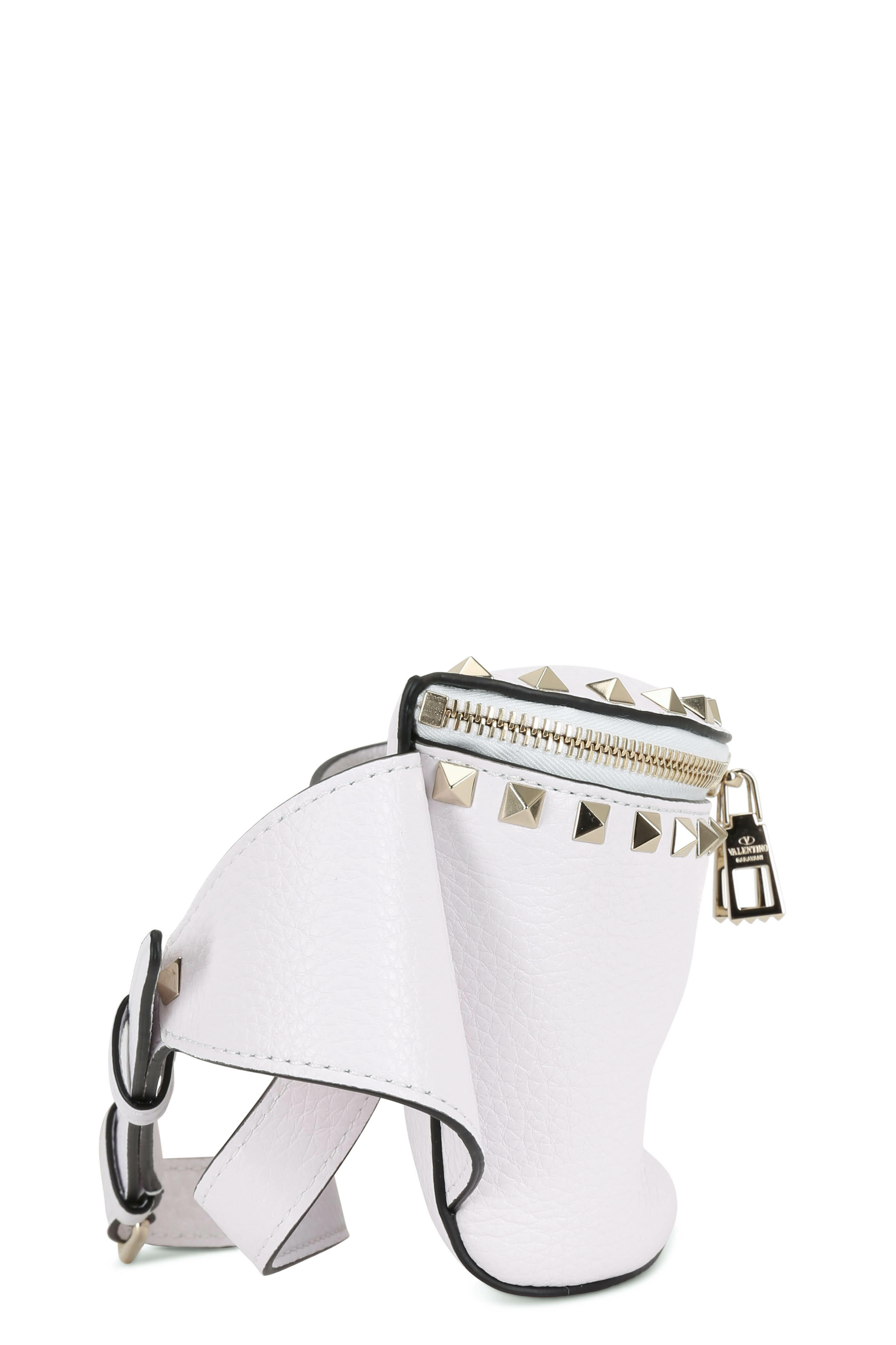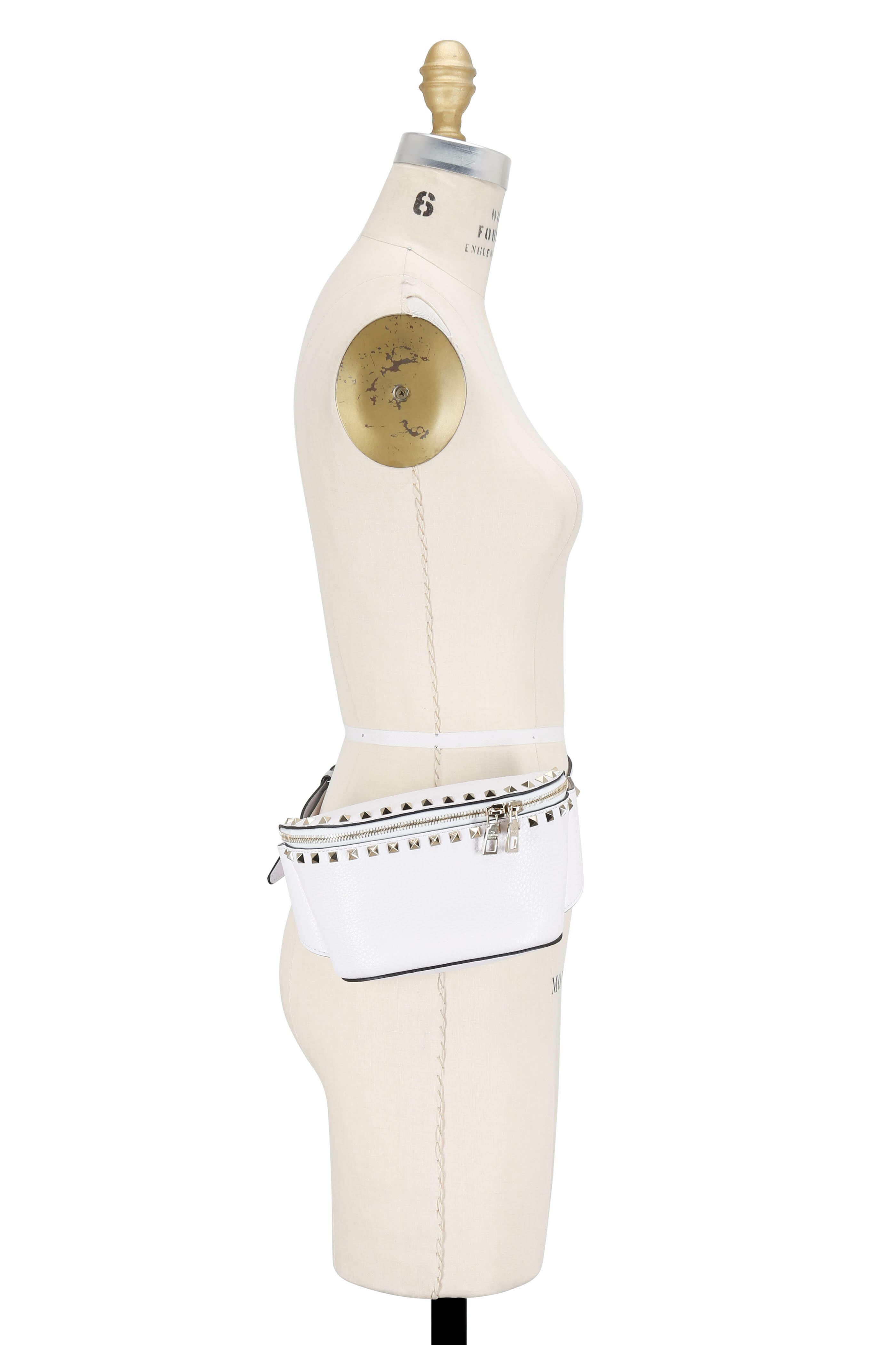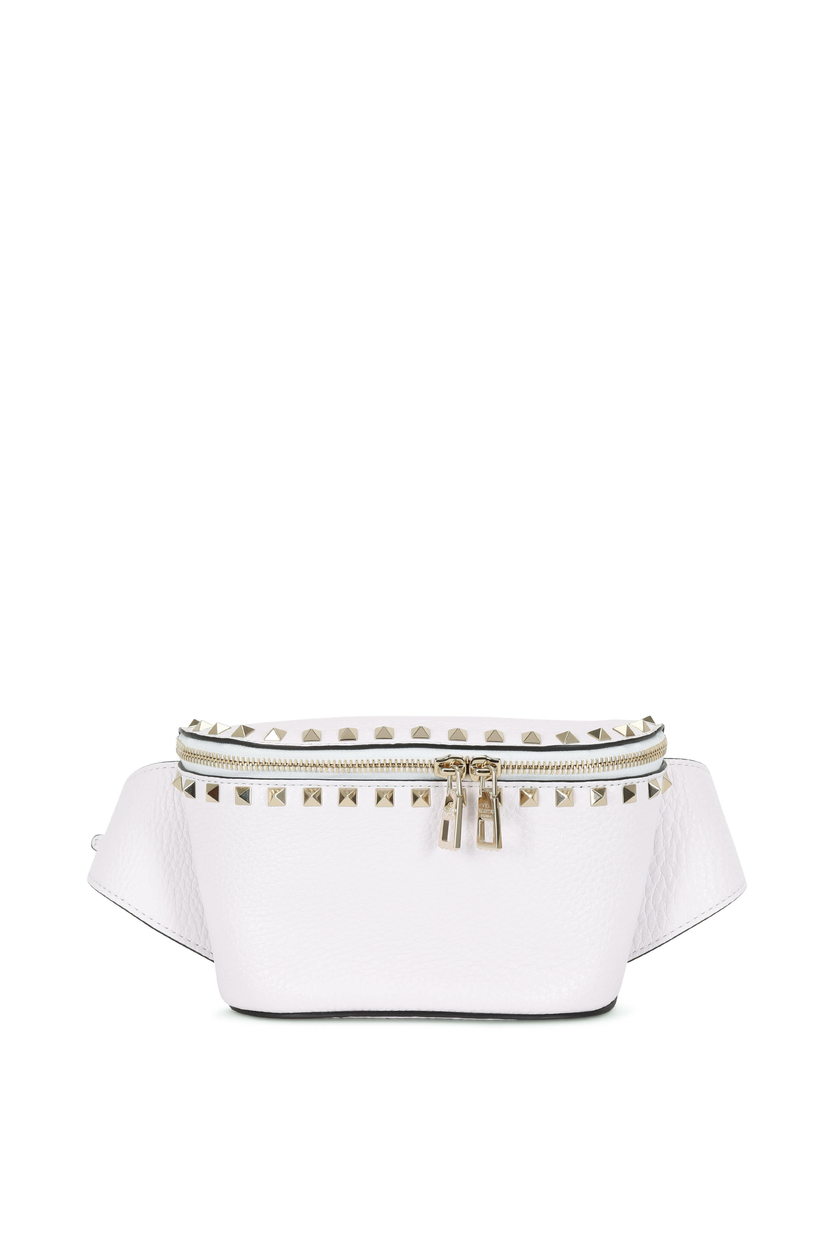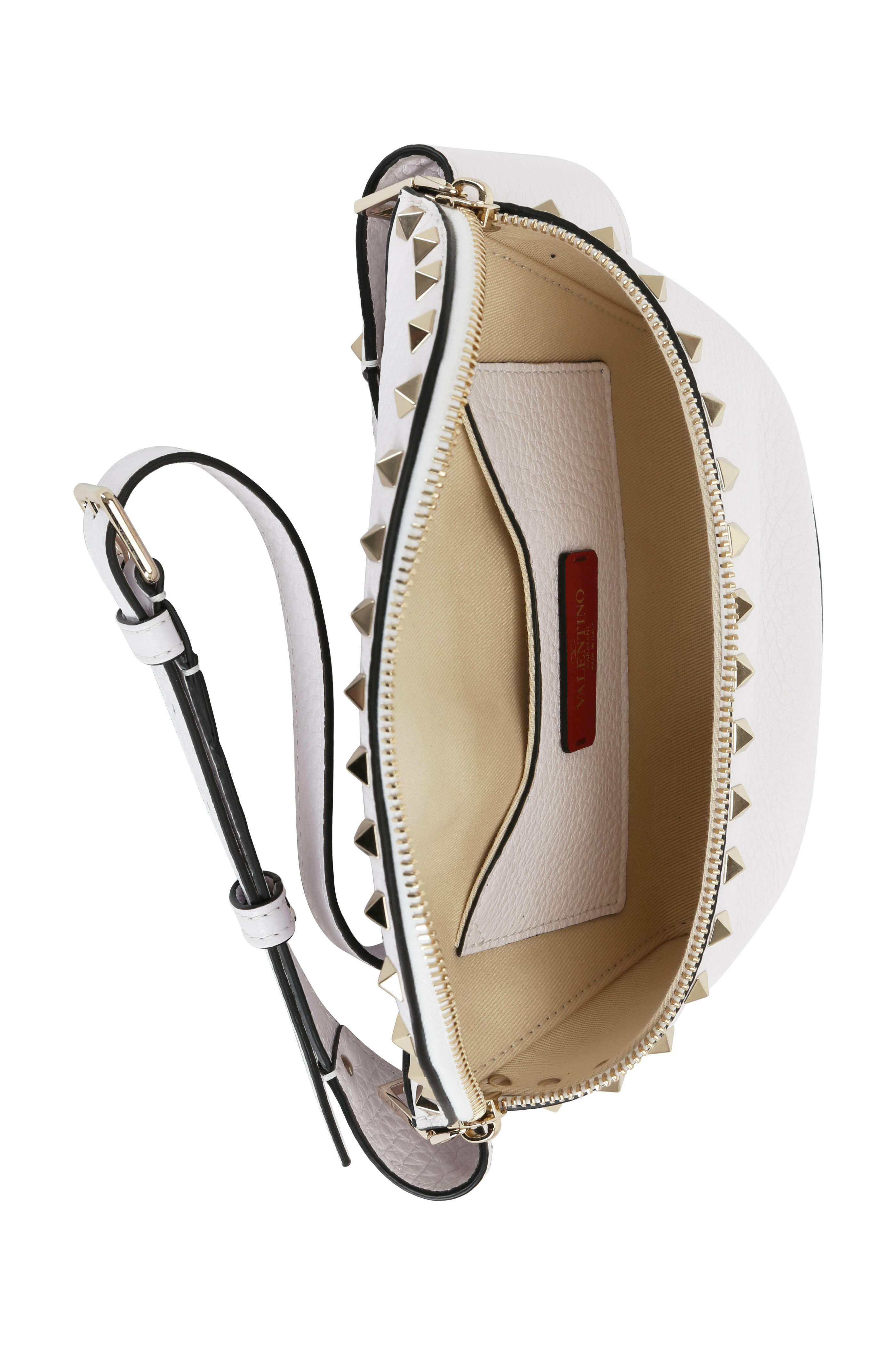 Pebbled calfskin leather. Adjustable strap. Top zip closure. Signature gold-tone rockstud detail. Exterior back zip pocket. One interior slip pocket. Lined in canvas. Made in Italy. Width: 9". Height: 5". Depth: 2".