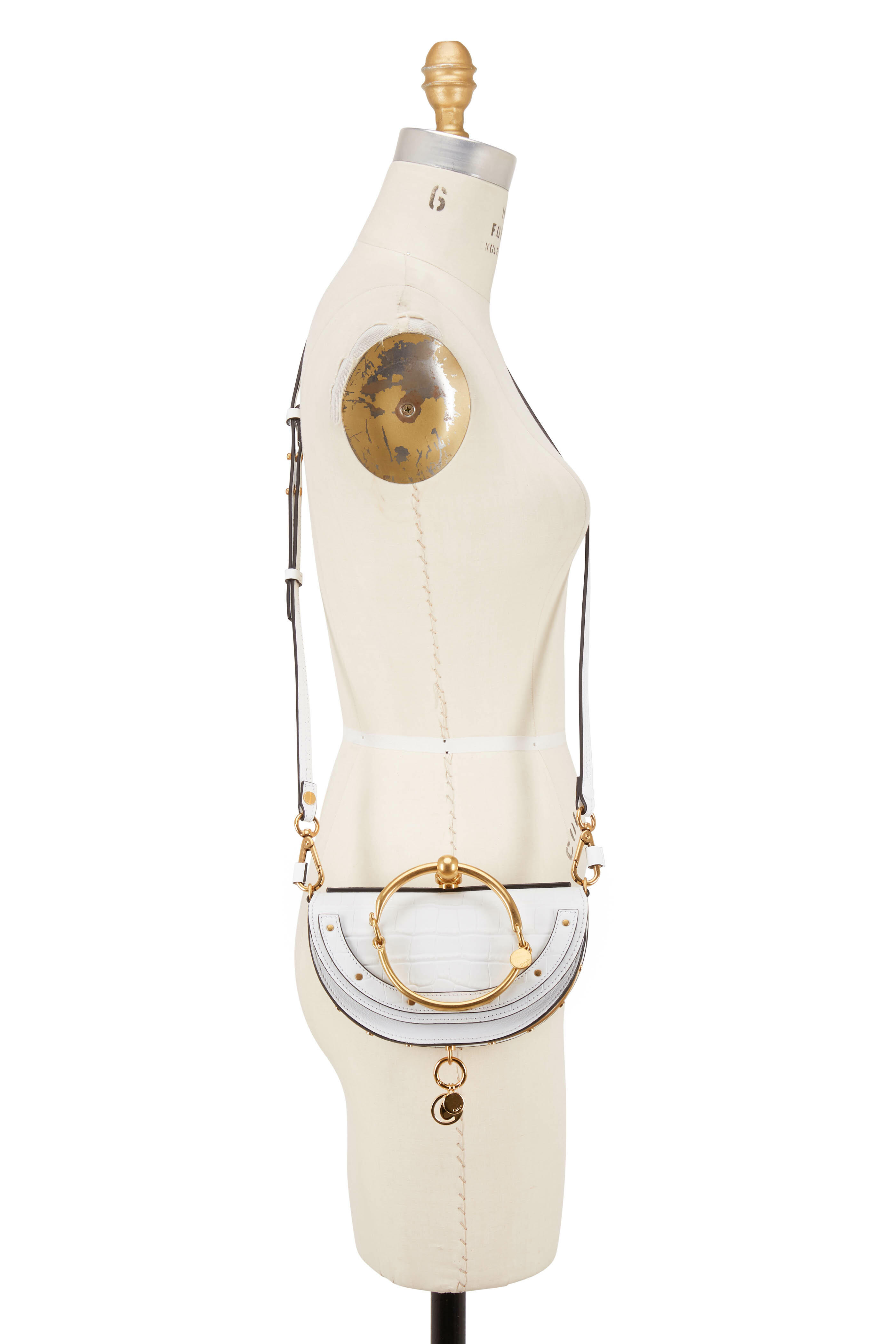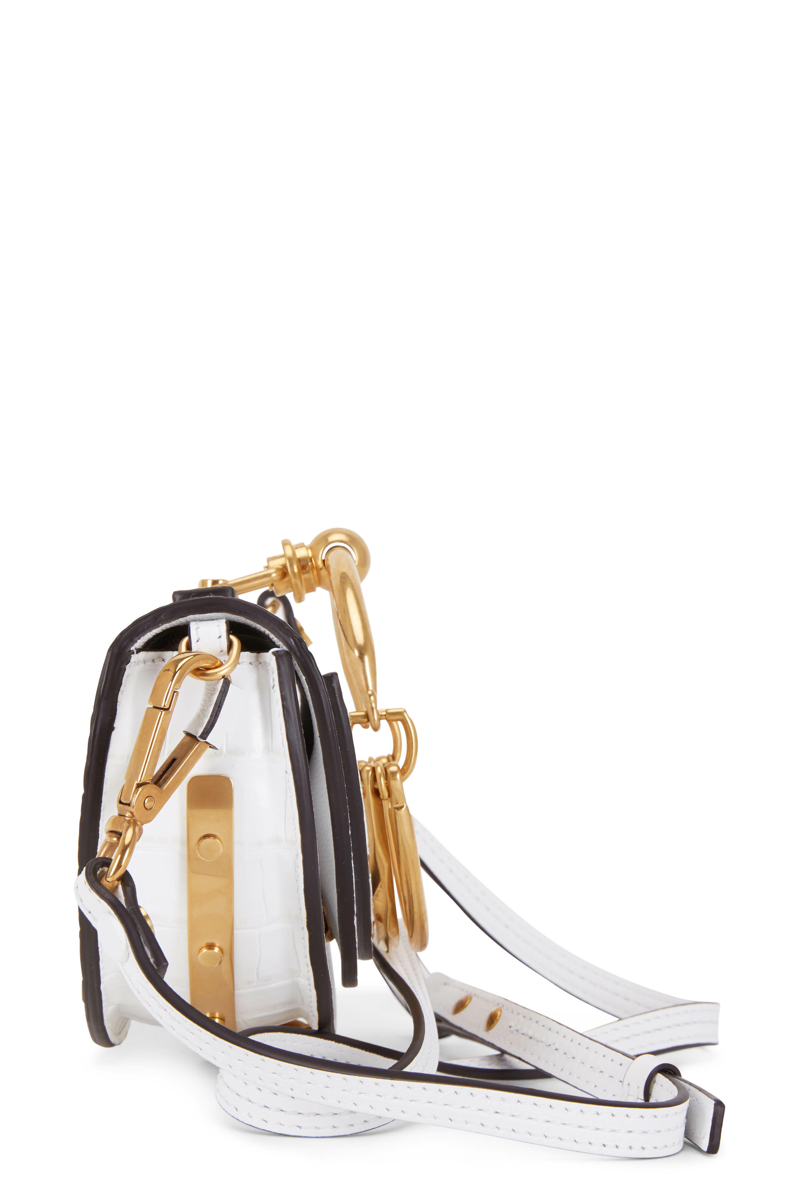 Croc embossed calfskin leather. Gold-tone bracelet handle. Detachable and adjustable crossbody strap. Flap front; magnetic snap closure. Decorative gold charms. Exterior back slip pocket. One interior slip pocket. Lined in suede. Made in Spain. Width: 8". Height: 4 ½". Depth: 2 ½". Detachable and adjustable strap drop: 21".