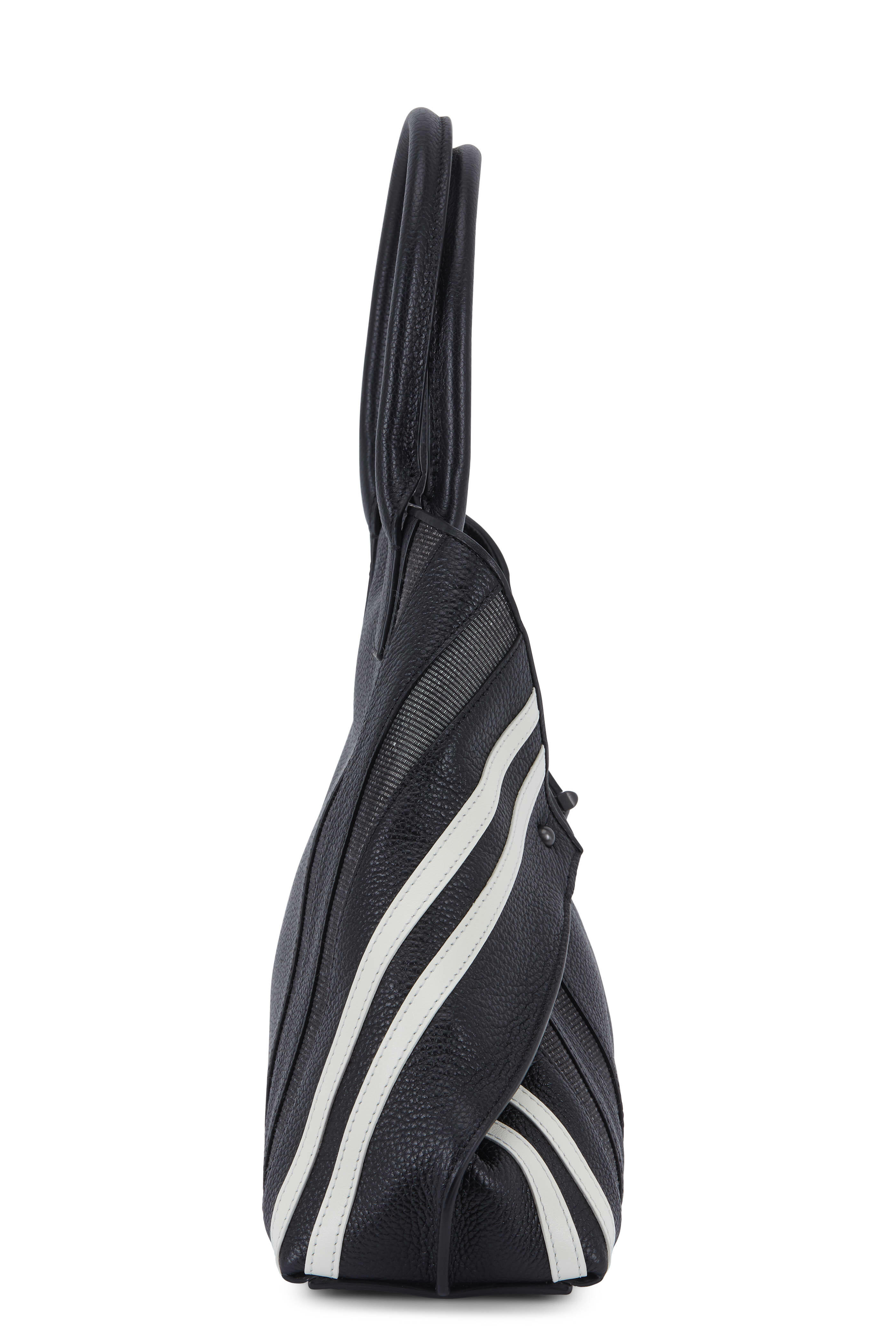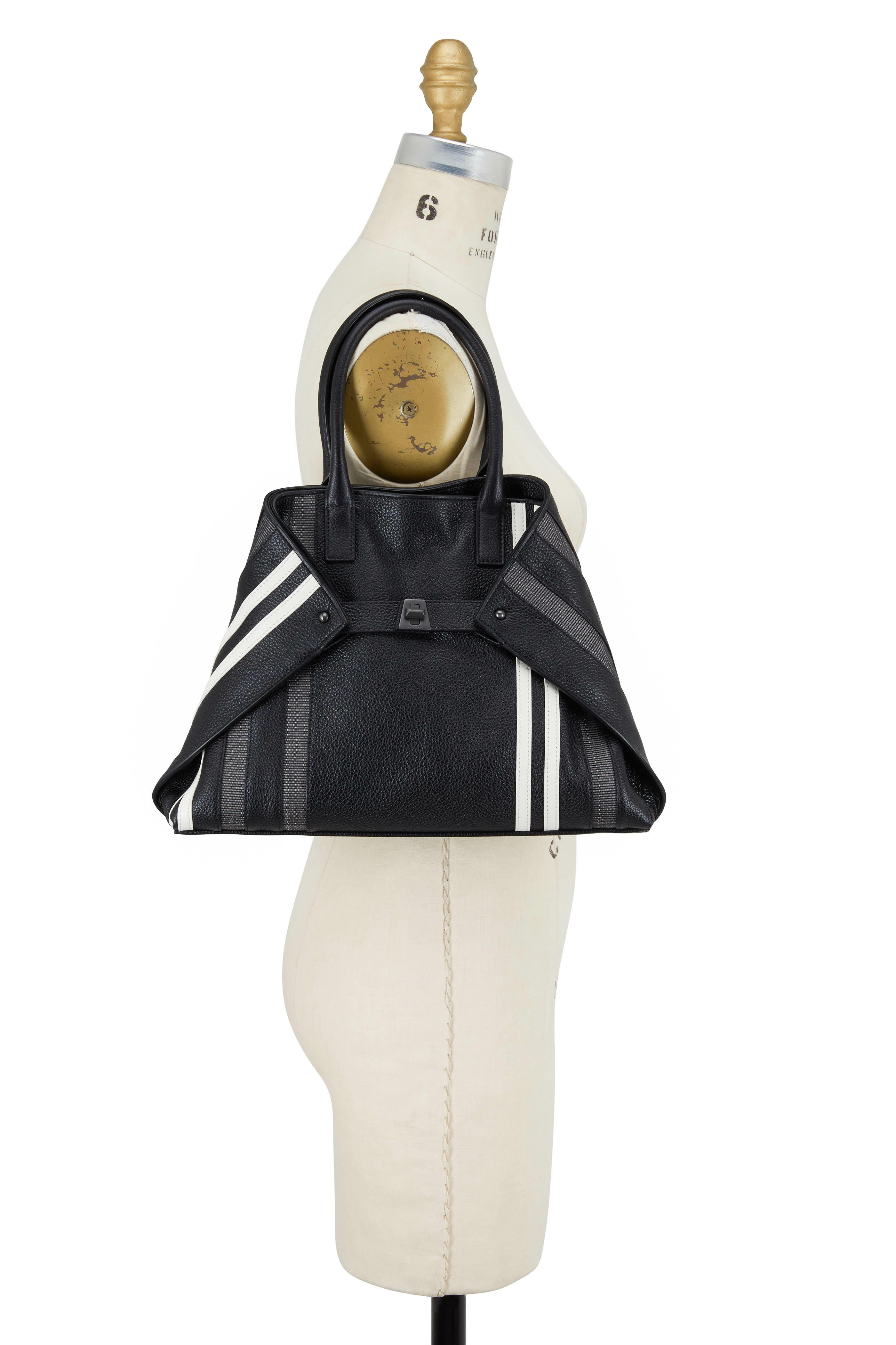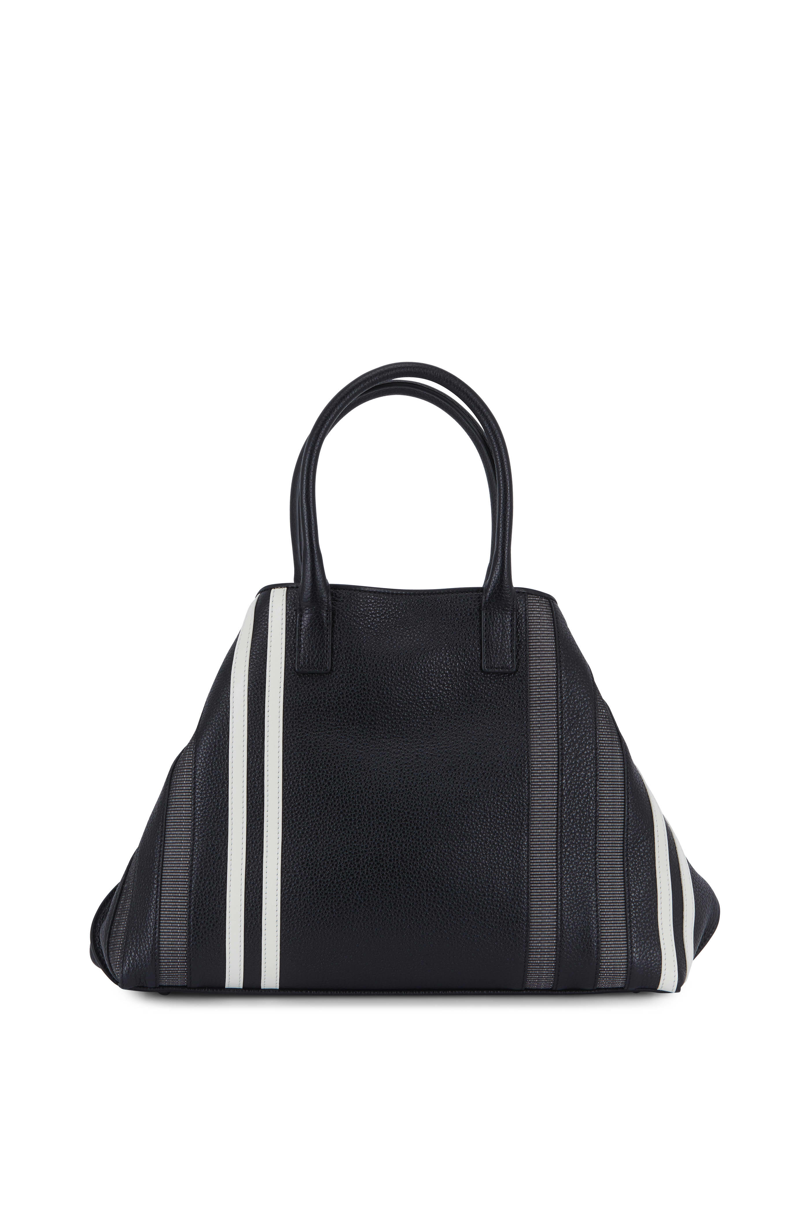 Calfskin leather. Dual rolled top handles. Detachable shoulder strap. Turnlock straps gather in to form signature silhouette. White leather and horsehair stripe detail. One interior zip and two open pockets. Fully lined. Protective metal feet. Imported. Width: 14". Height: 10". Depth: 3". Strap drop: 6". Detachable strap drop: 18".