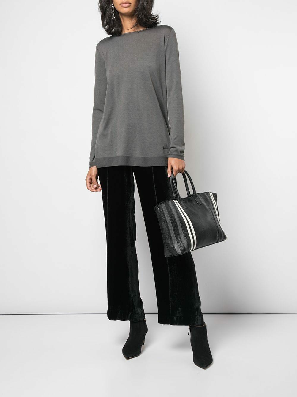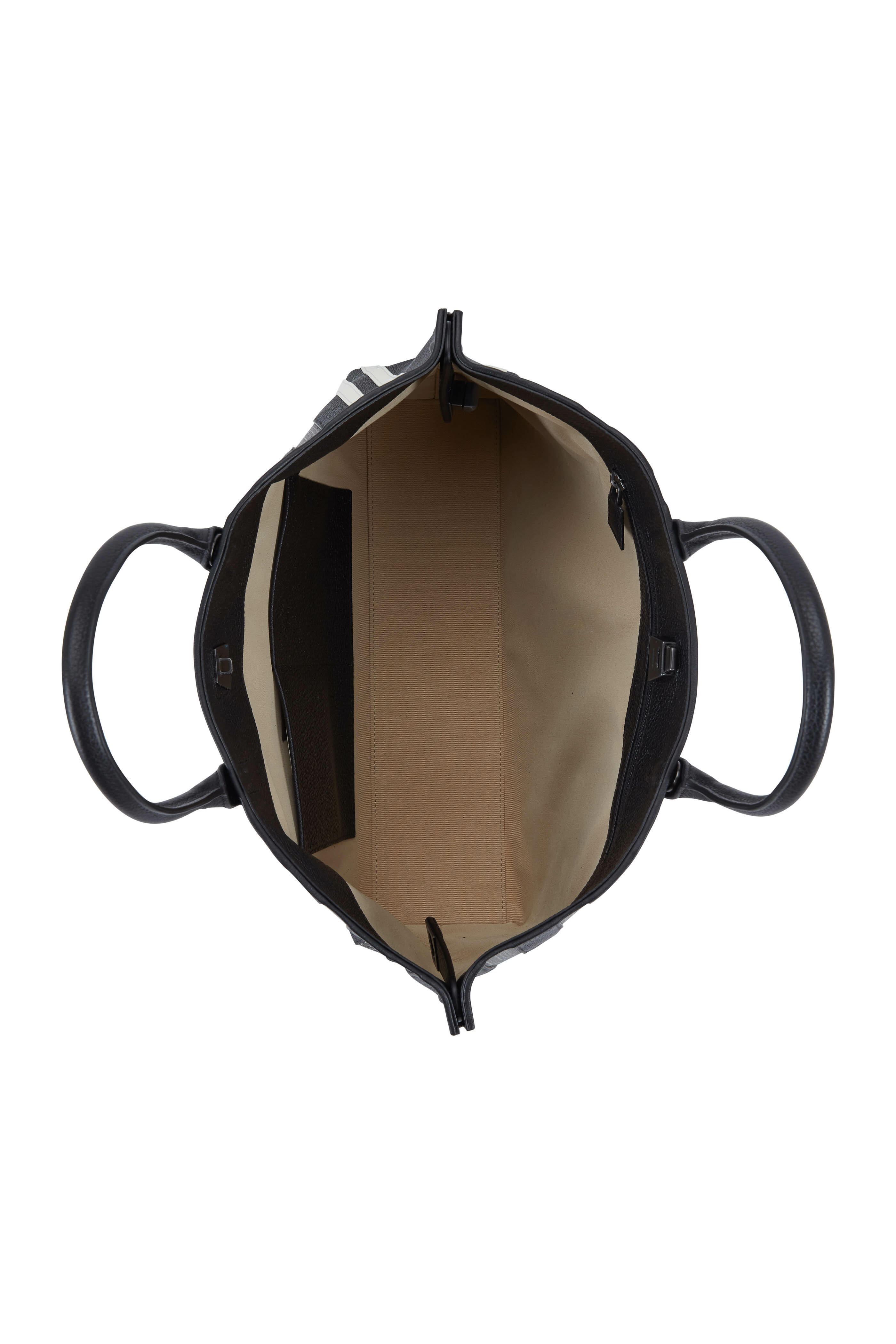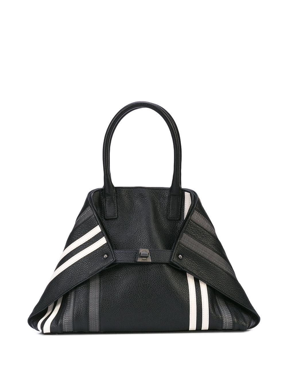 Calfskin leather. Dual rolled top handles. Detachable shoulder strap. Turnlock straps gather in to form signature silhouette. White leather and horsehair stripe detail. One interior zip and two open pockets. Fully lined. Protective metal feet. Imported. Width: 14". Height: 10". Depth: 3". Strap drop: 6". Detachable strap drop: 18".