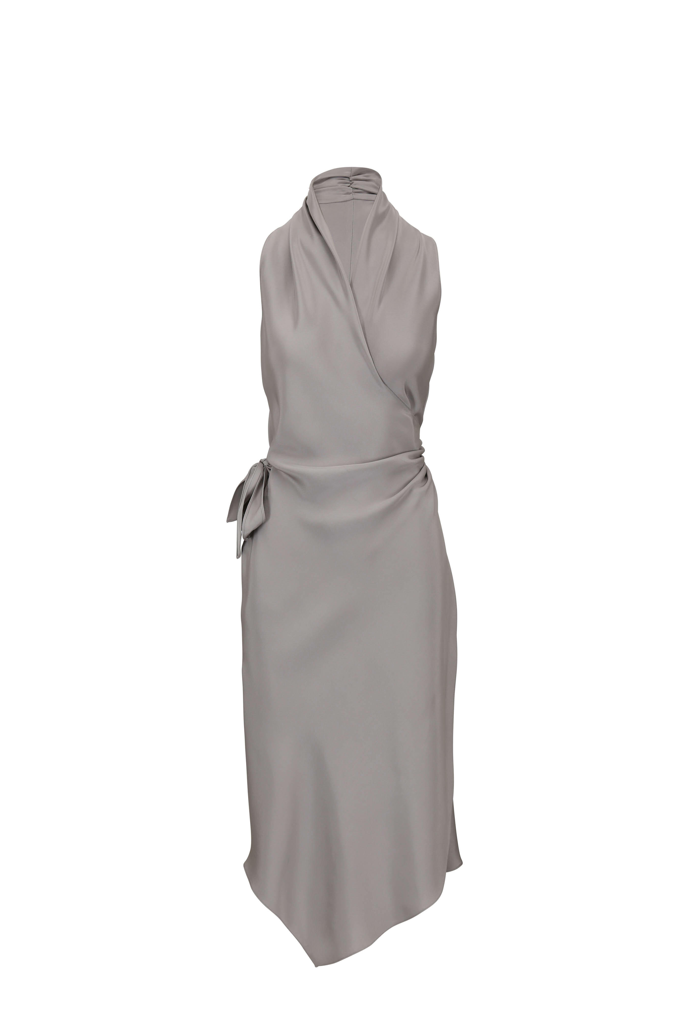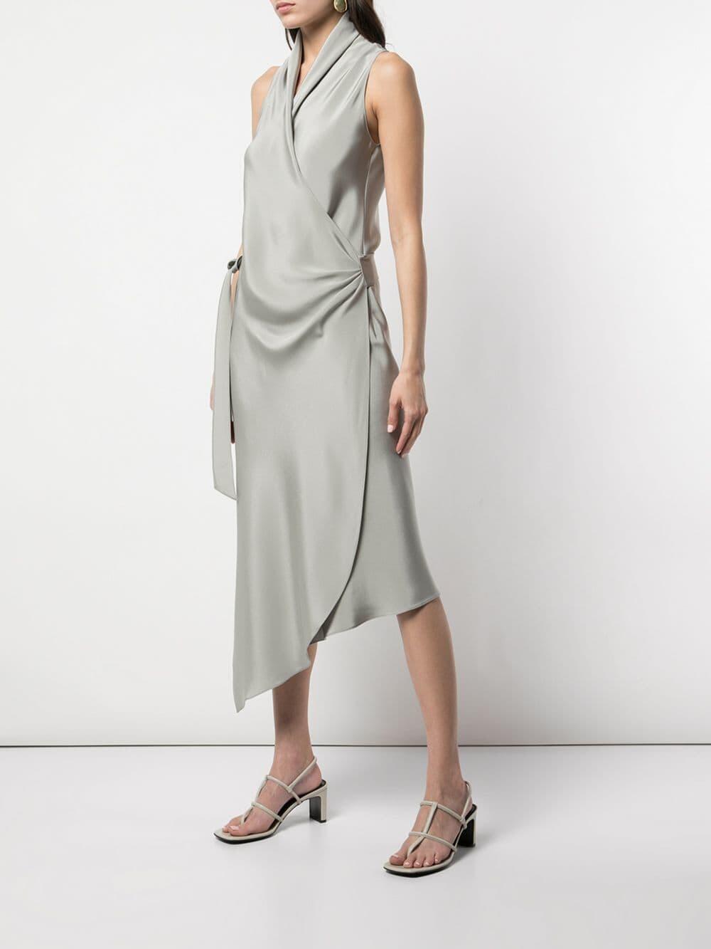 Surplice neckline. Wrap around tie at waist. Asymmetric hem. Made in the USA. 100% silk. Dry clean.
