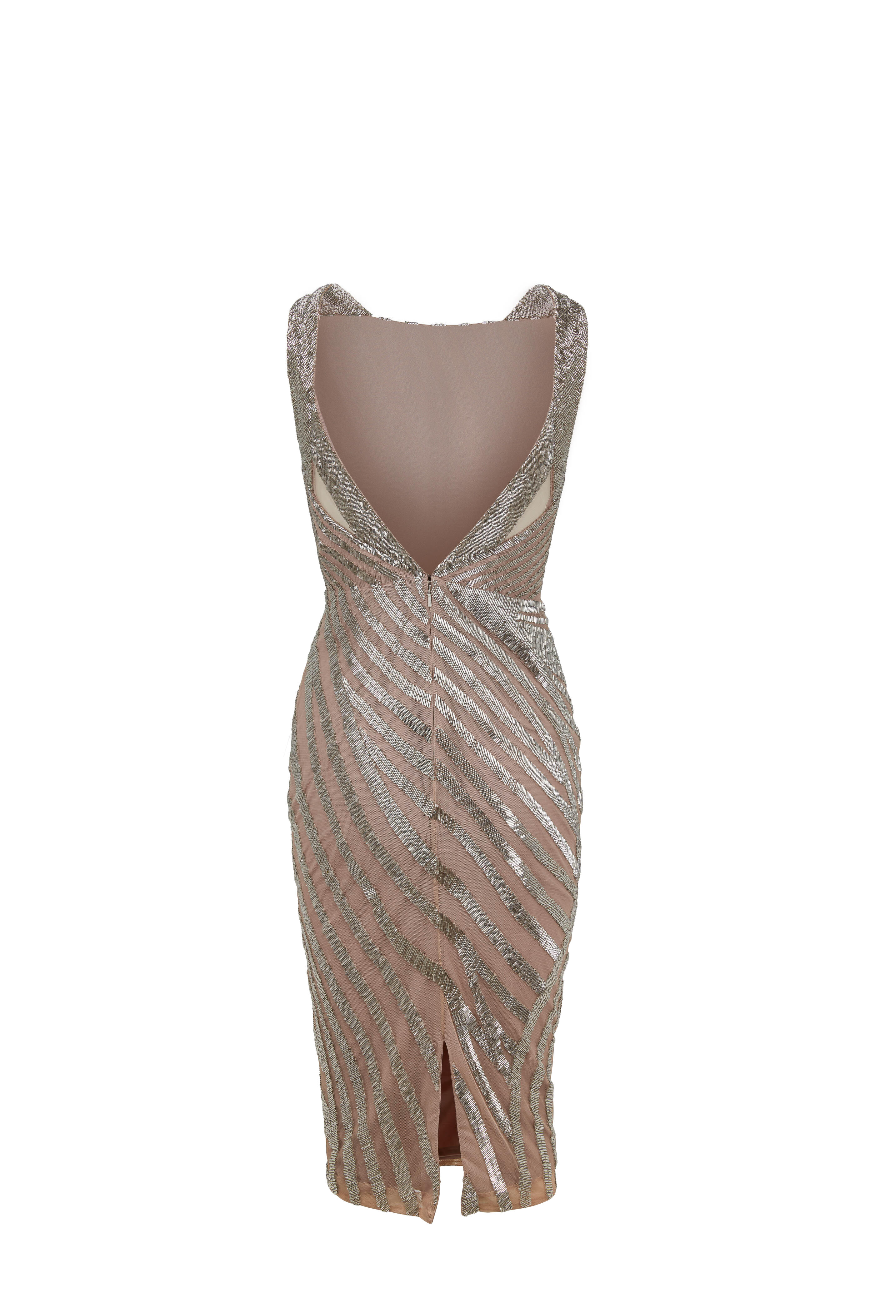 Specialist clean. Square neckline, deep v back. Concealed back zip closure. Molded cups with detachable pads. Nipped in at natural waist. Slim skirt. Center back slit. Imported. 45" shoulder to hem. 100% polyester, fully lined.
