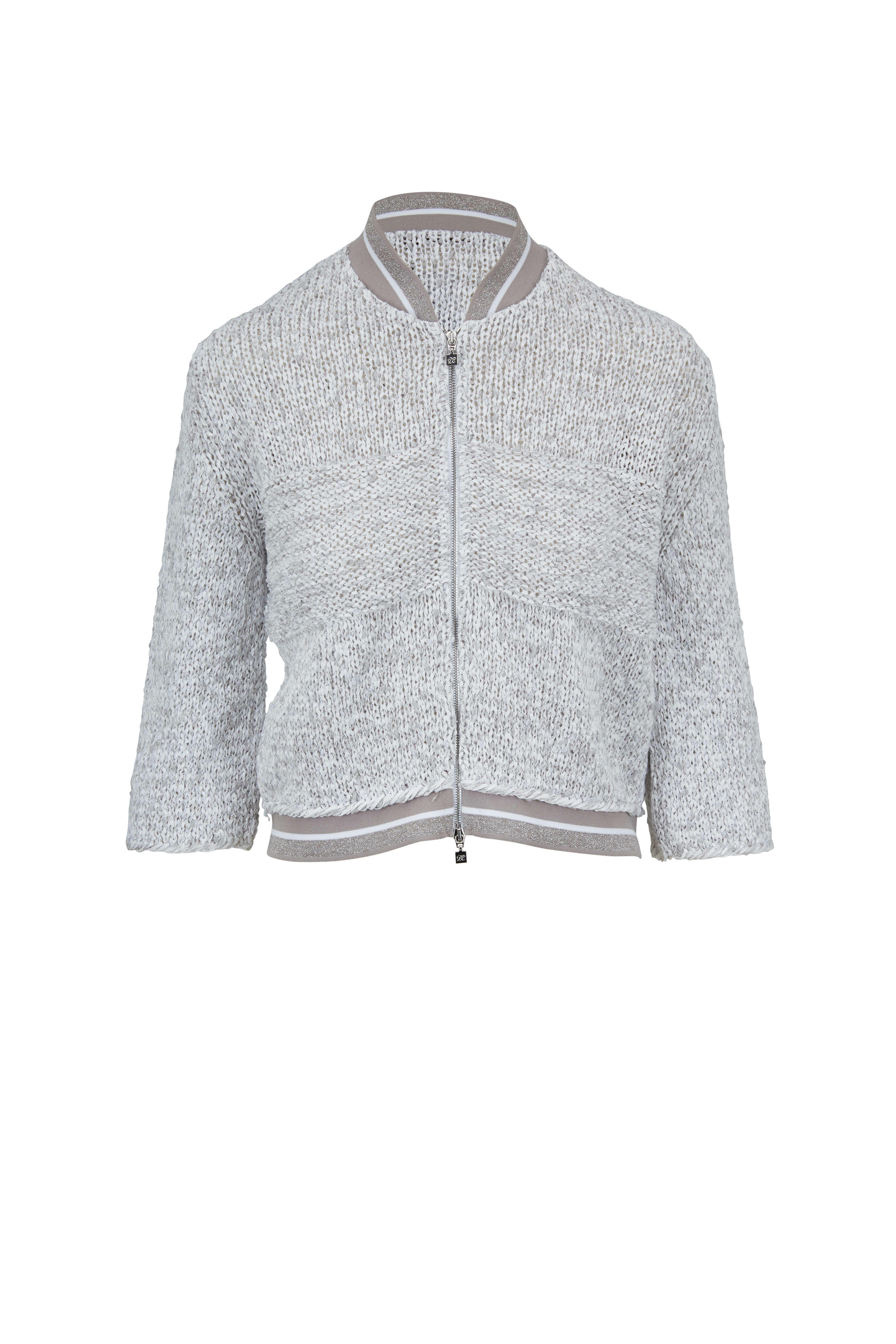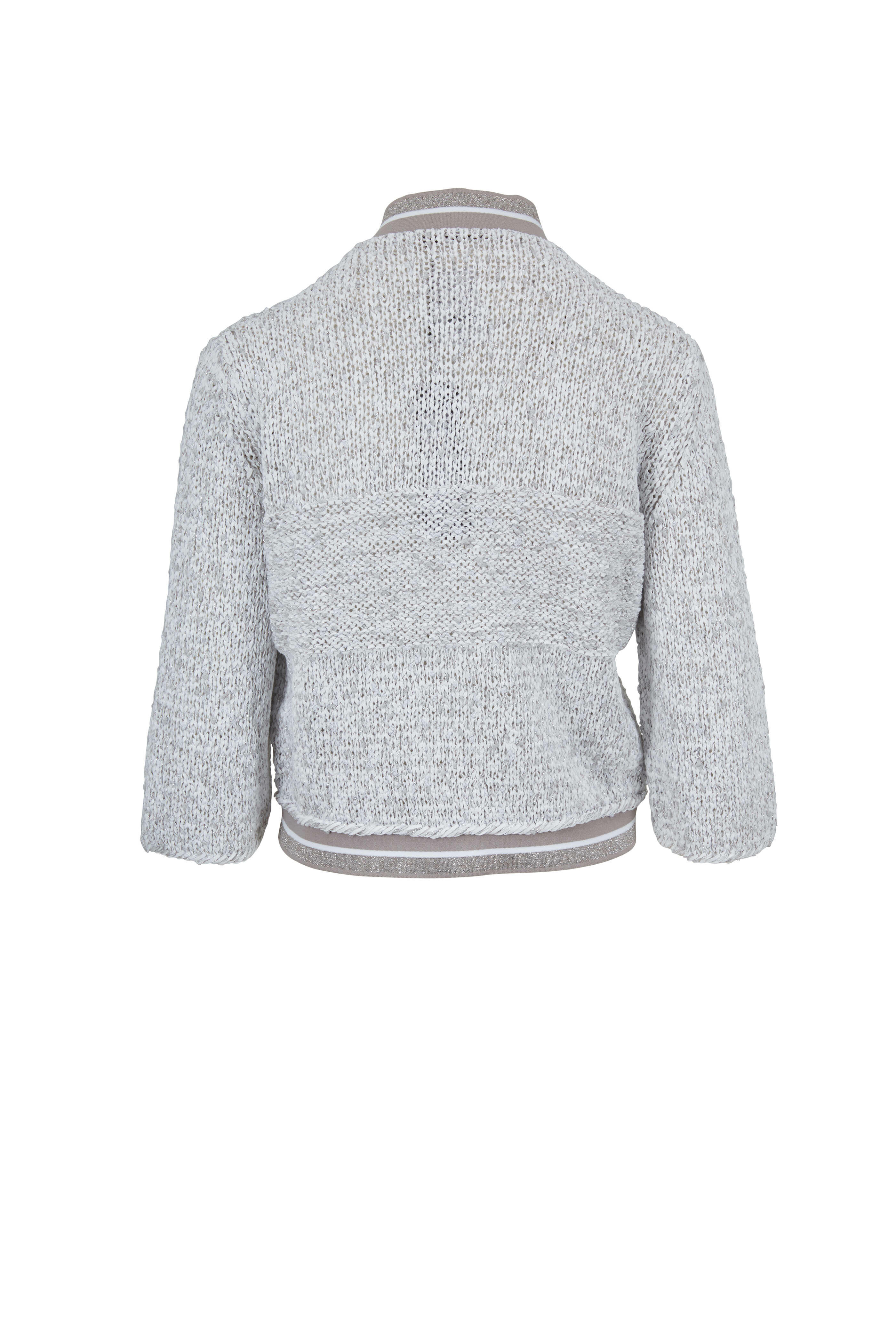 Baseball collar. Front zip closure. Drop[ shoulders. Three-quarter sleeves. Contrast ribbed knit trim at collar and hem. Made in Italy. 36% polyester, 25% polyamide, 18% viscose, 10% cotton, 1% polyester. Dry clean.