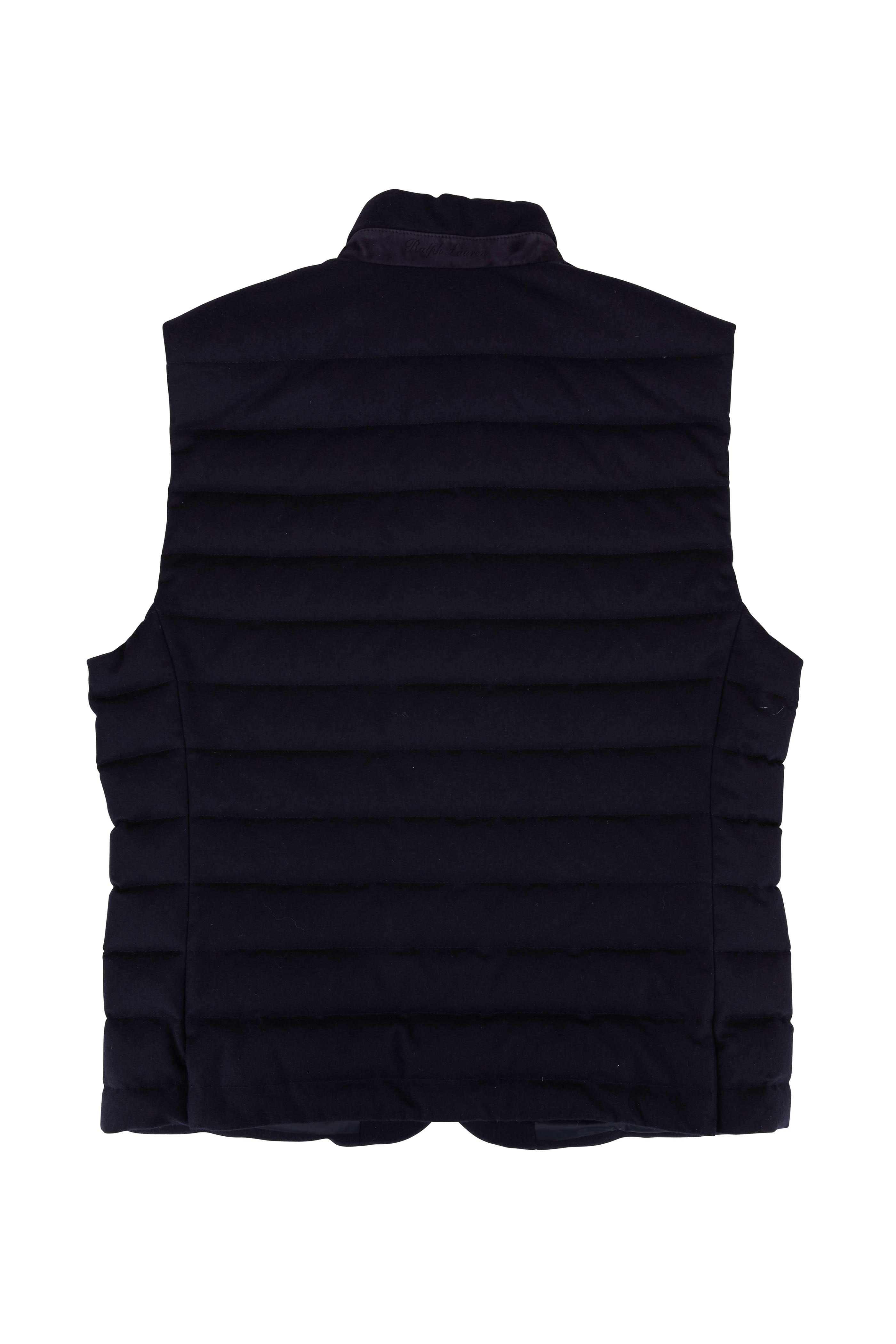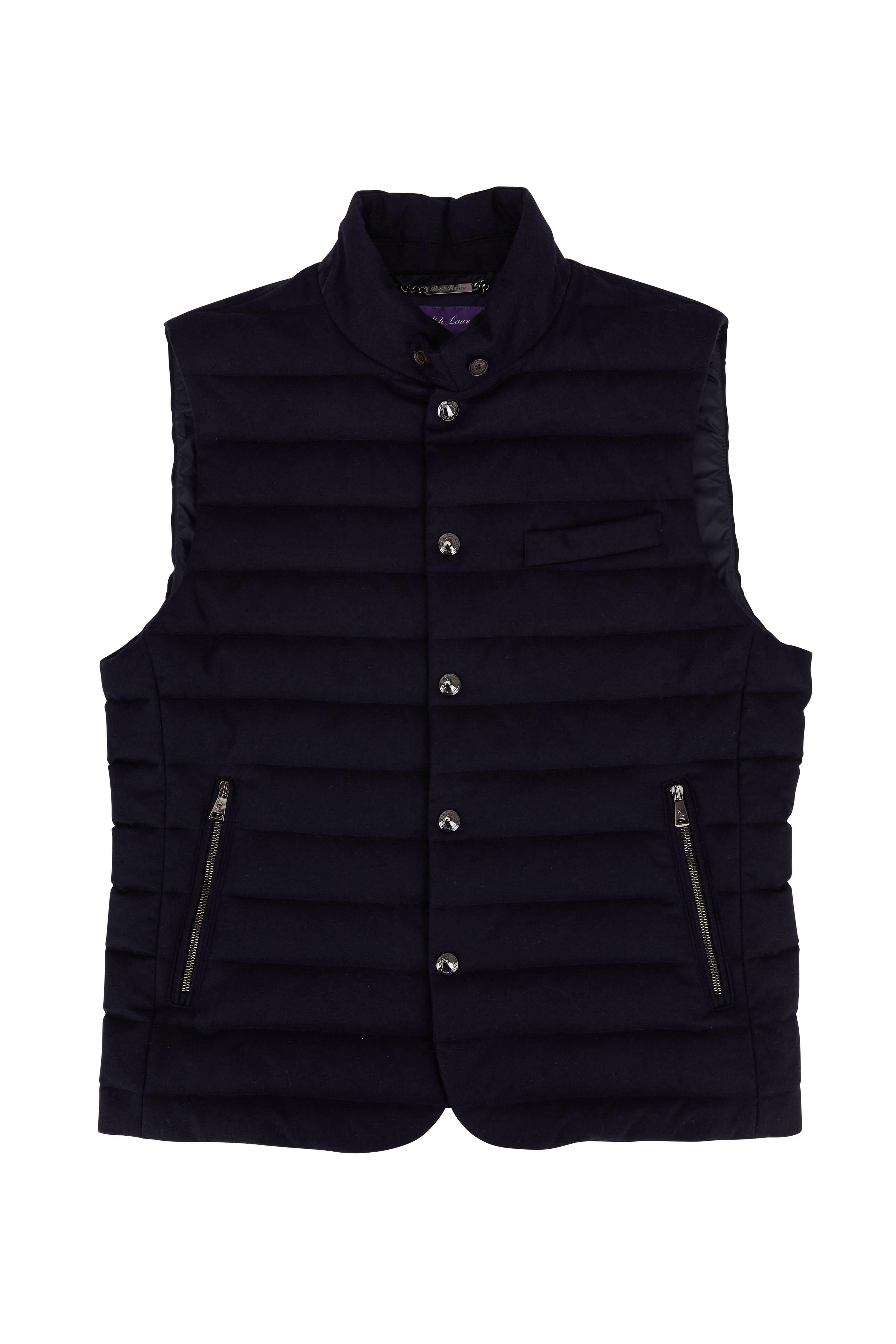 Stand collar. Front snap placket. Lower zip pockets; chest welt pocket. Imported. 80% wool, 20% nylon; fill: 80% duck down, 20% duck feathers. Dry clean.