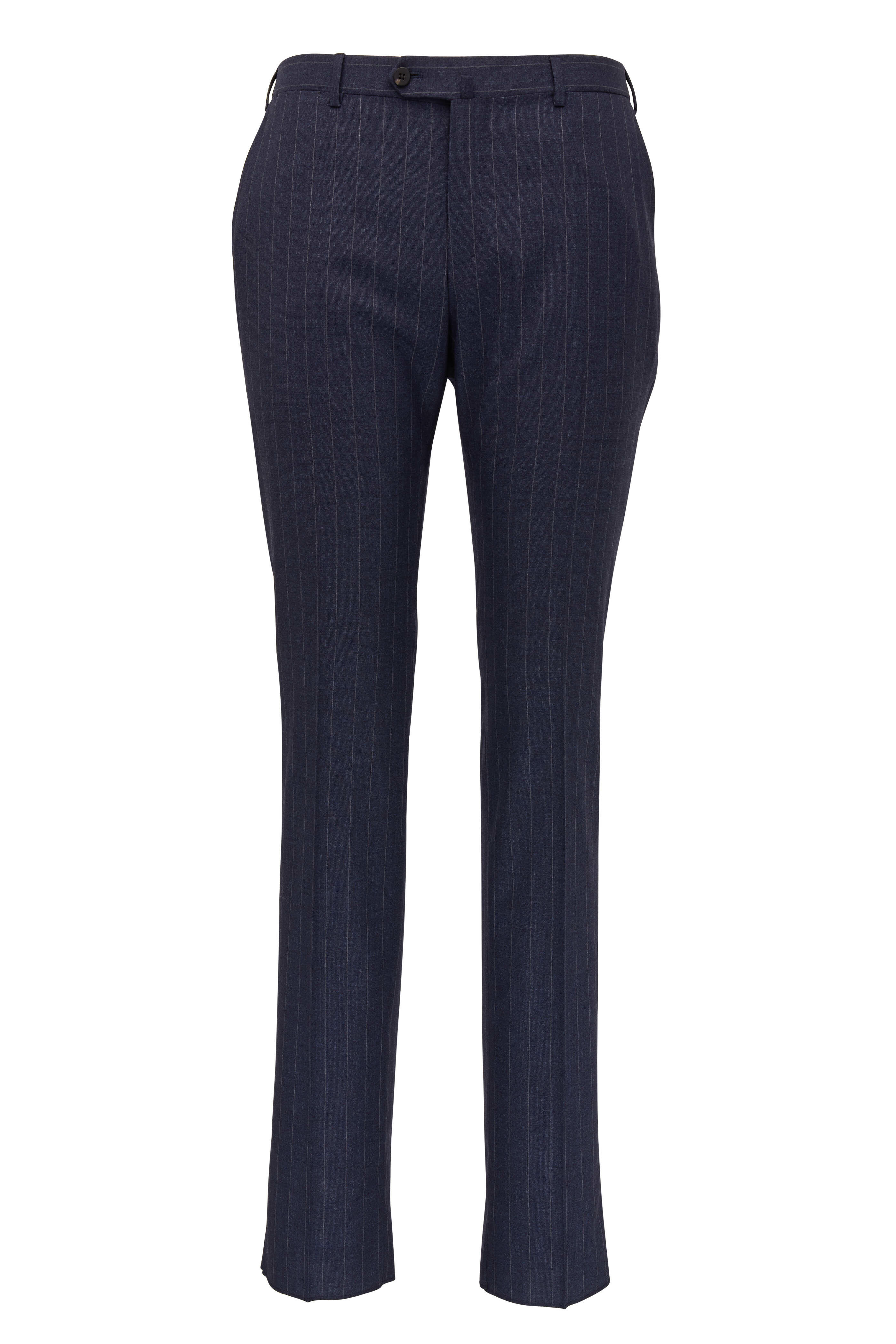Made in Italy. Jacket: Notched lapels. Two button closure. Lower flap pockets; chest welt pocket. Double vent. Pants: Banded waist; belt loops. Front slip pockets; coin pocket; back besom pockets. Unfinished hem. 99% wool, 1% elastane. Dry clean.