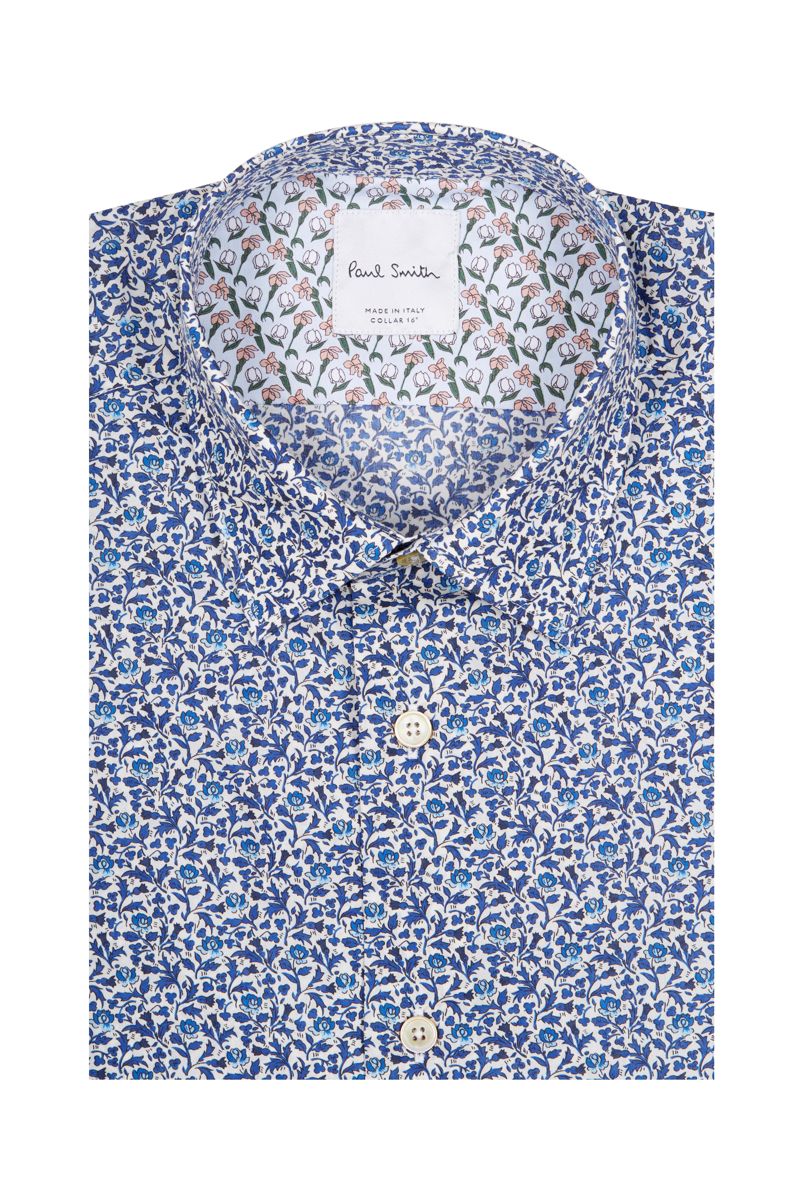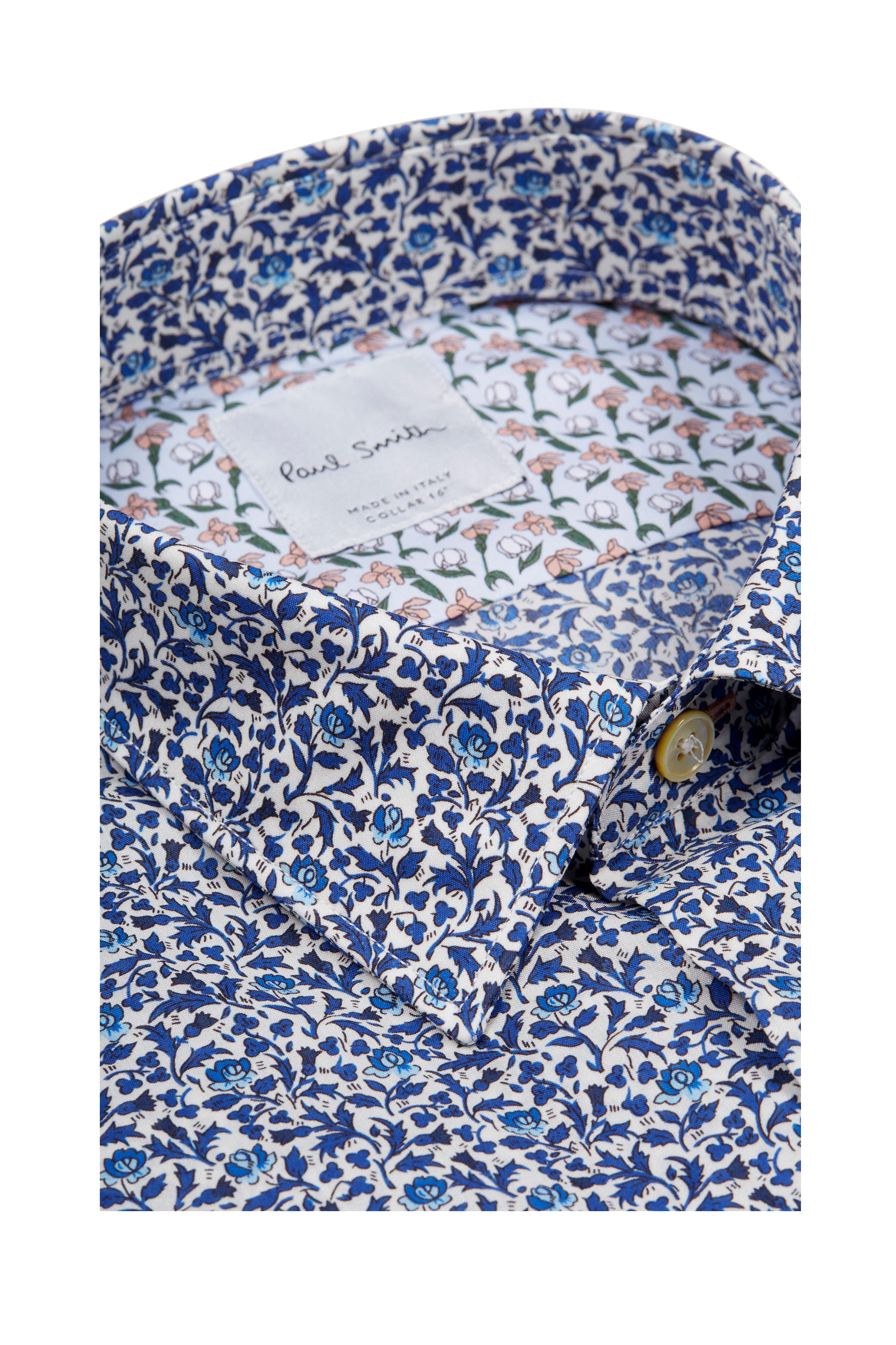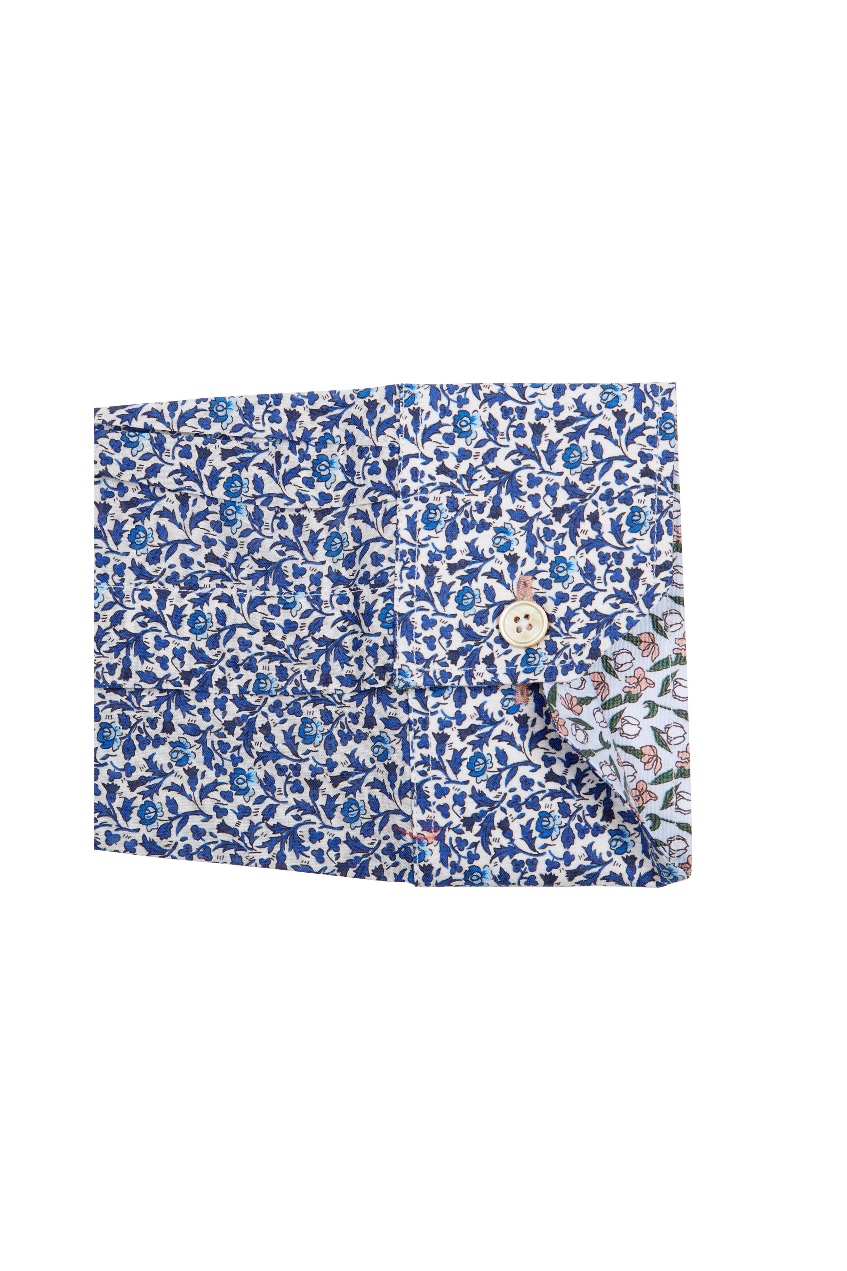 Spread collar. Single button mitered cuffs with contrast pattern inside. Made in Italy. 100% cotton. Machine wash.