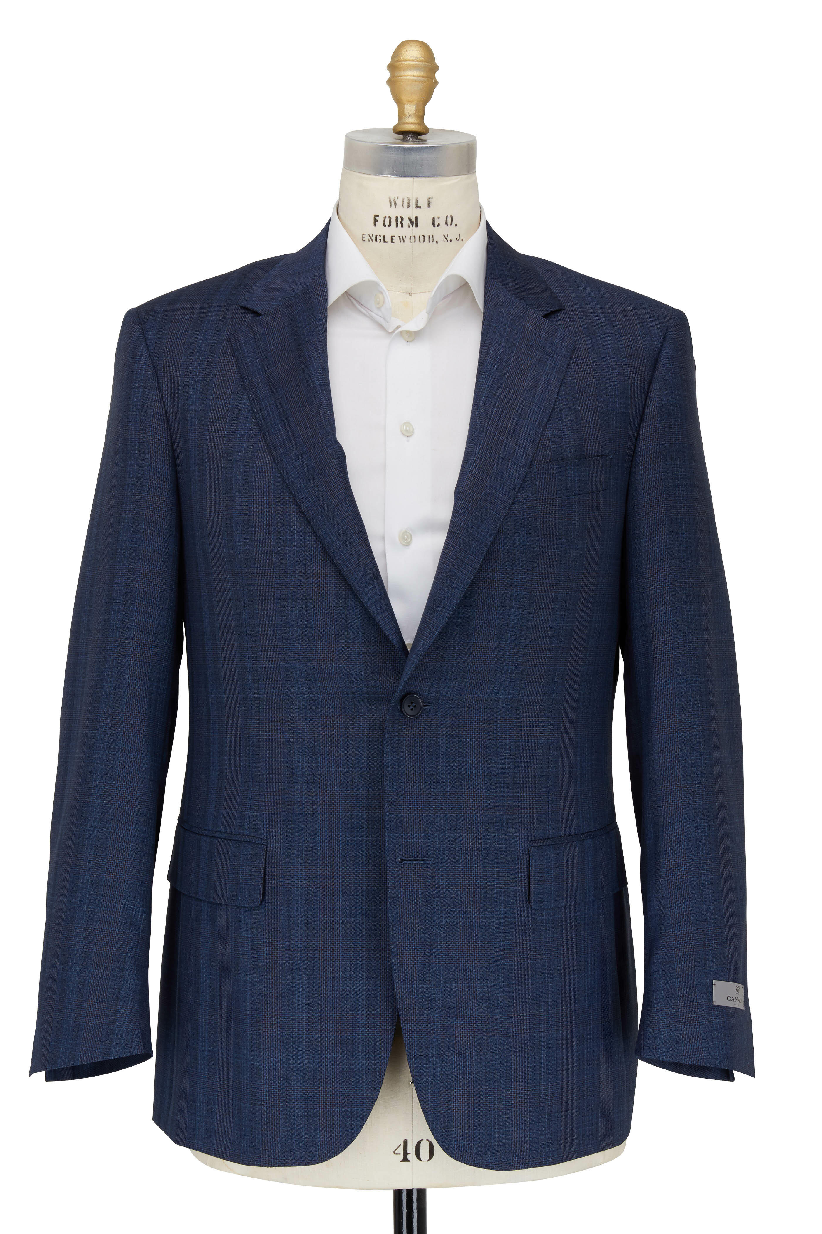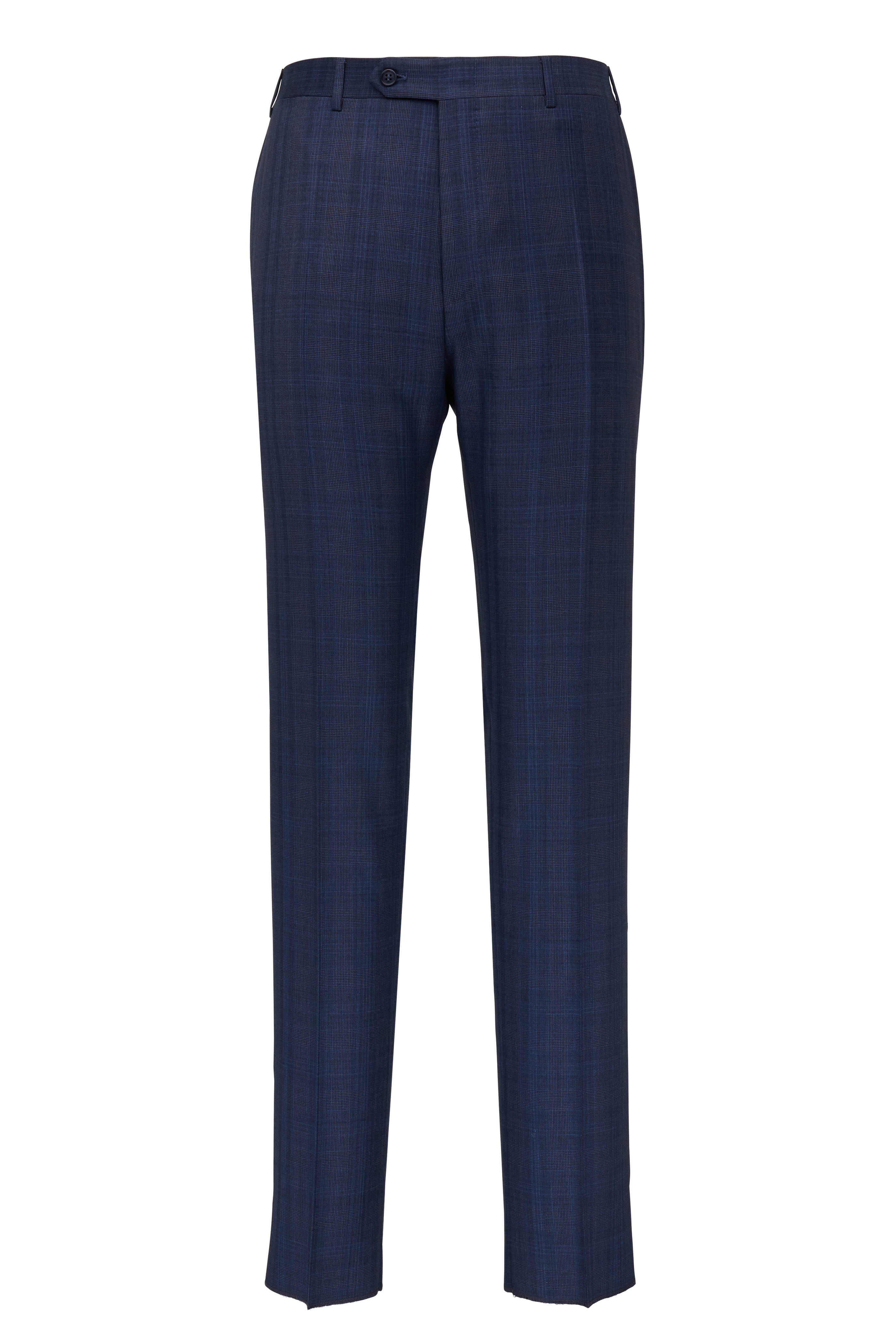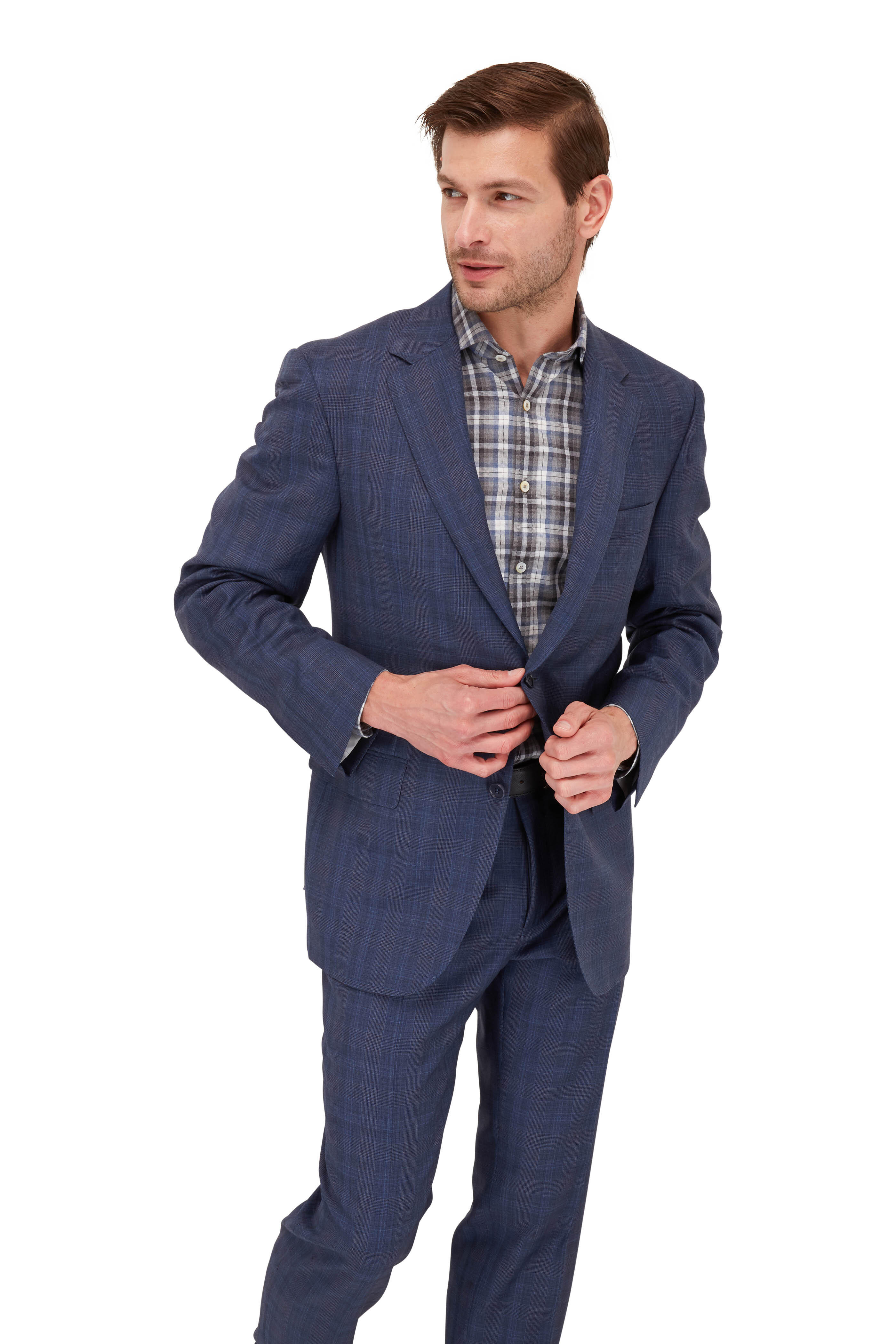Made in Italy. Jacket: Fully lined. Notched lapels. Two button closure. Chest welt pocket, lower flap pockets. Double vent. Pants: Side slip pockets, back button besom pockets, ticket pocket. Unfinished hem. 100% wool. Dry clean.