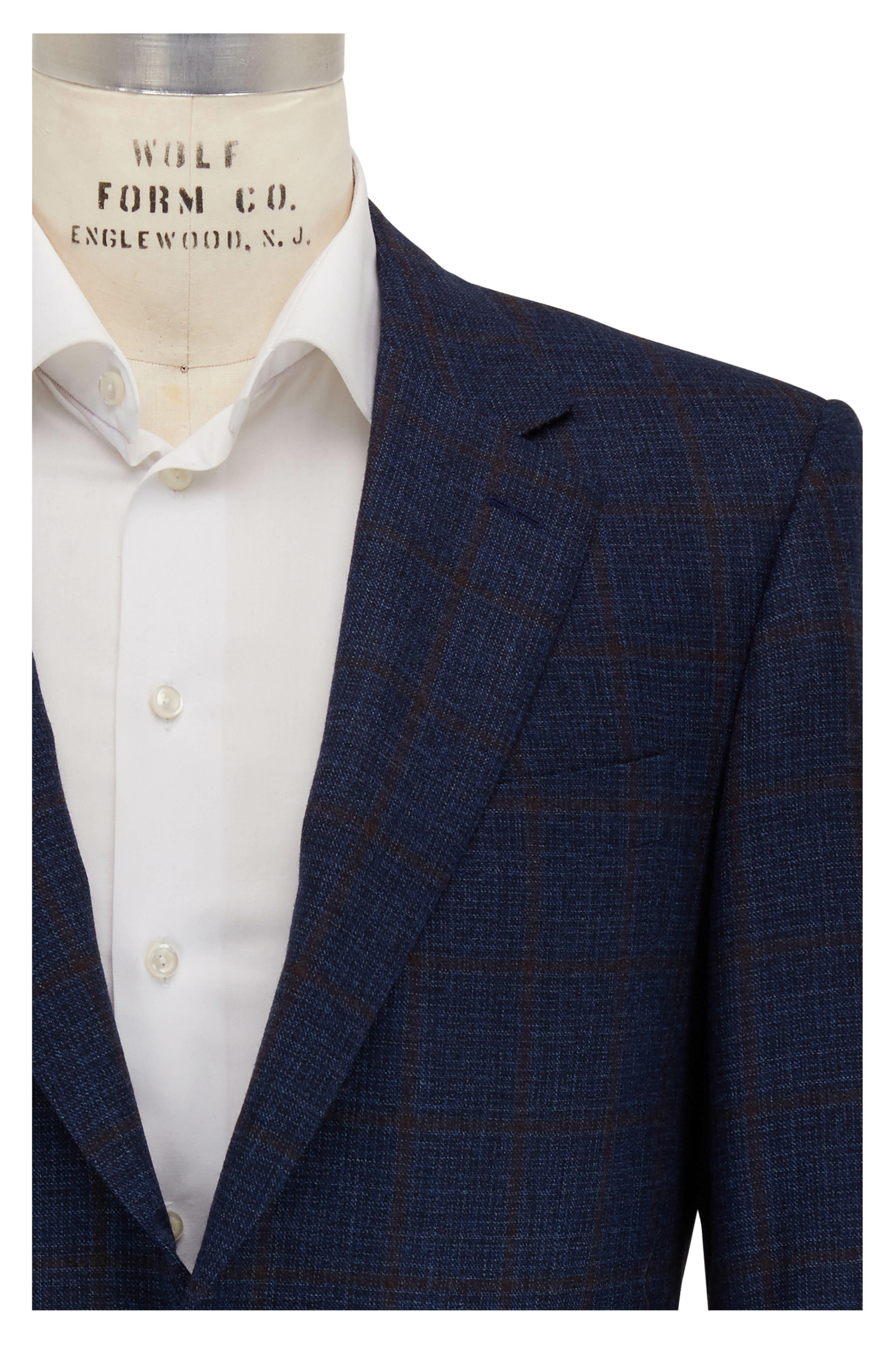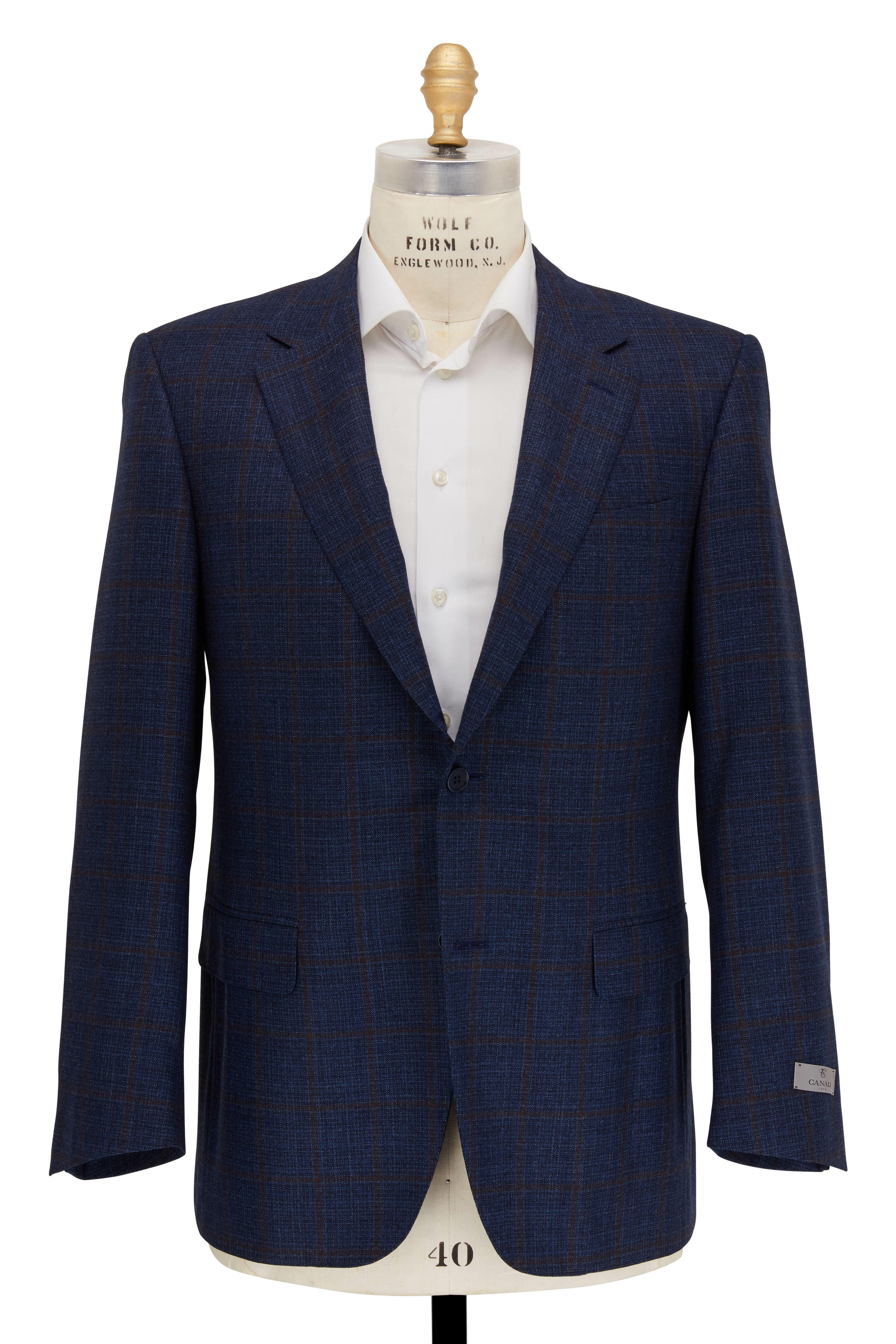 Notched lapels. Two button closure. Lower flap pockets; chest welt pocket. Double vent. Made in Italy. 100% wool. Dry clean.