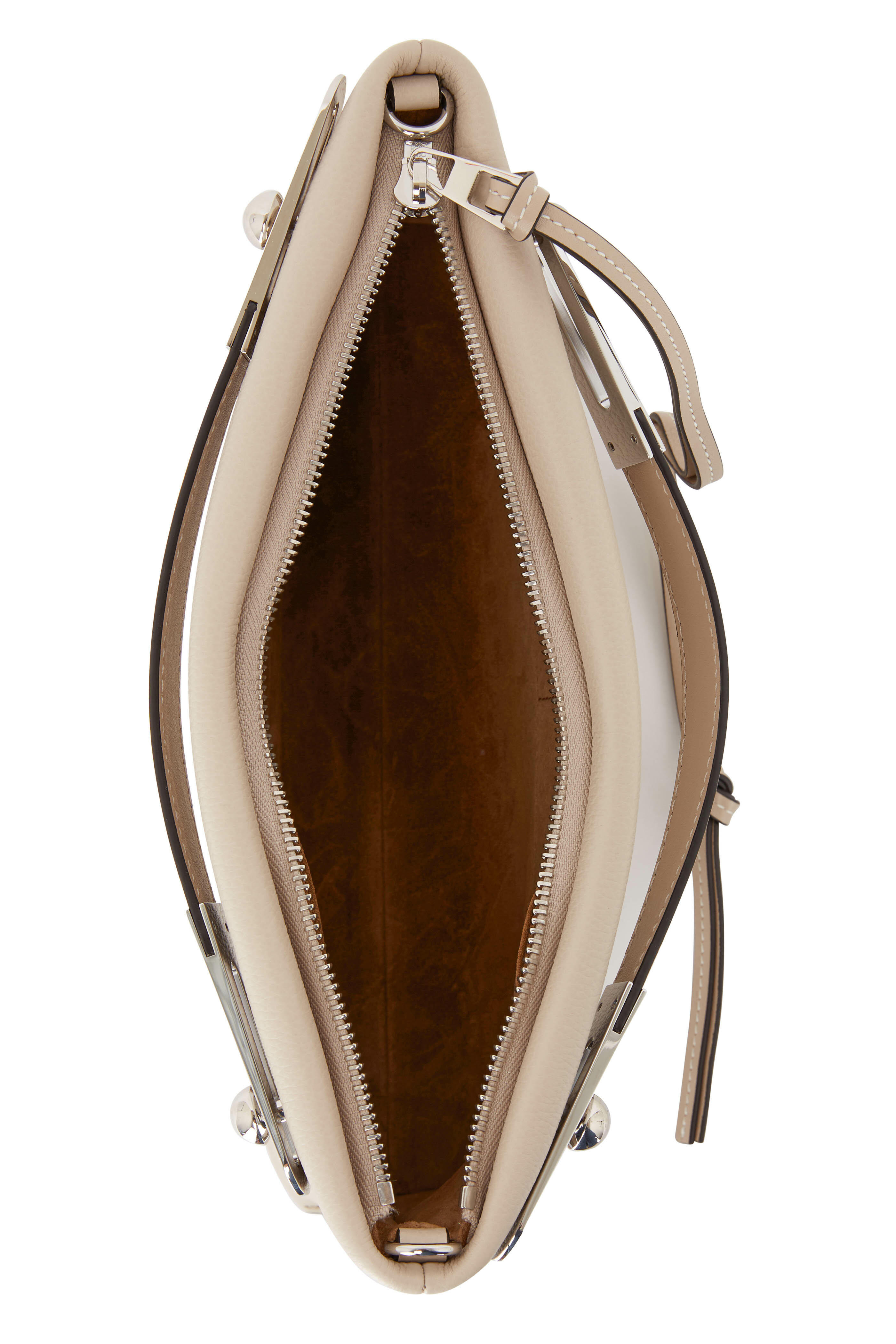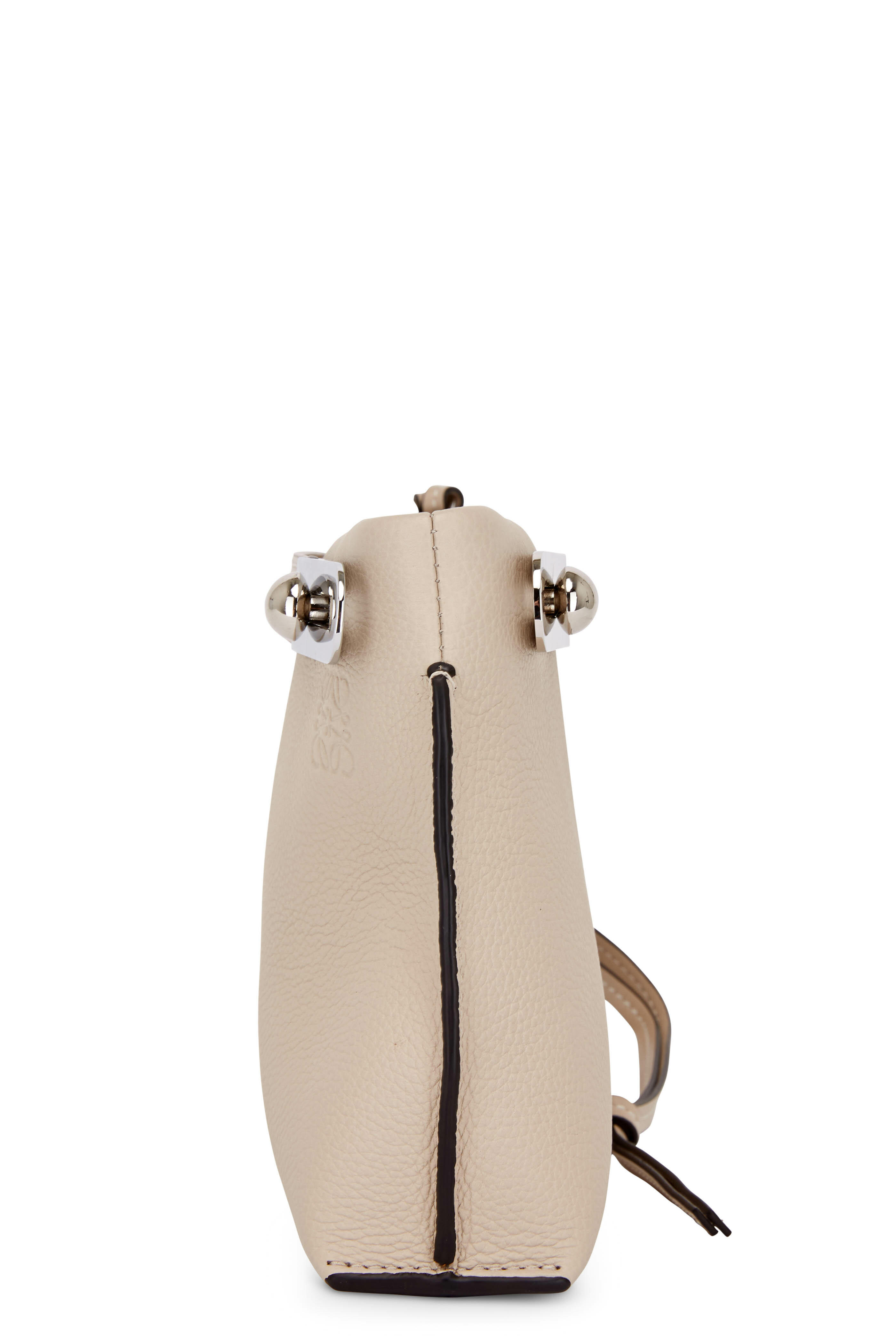 Soft grained calf leather. Sliding top handles. Detachable shoulder strap. Top zip closure. Two internal slip pockets. Suede lining. Made in Spain. Height: 11". Width: 6". Depth: 3". Handle drop: 2". Strap length: 49".
