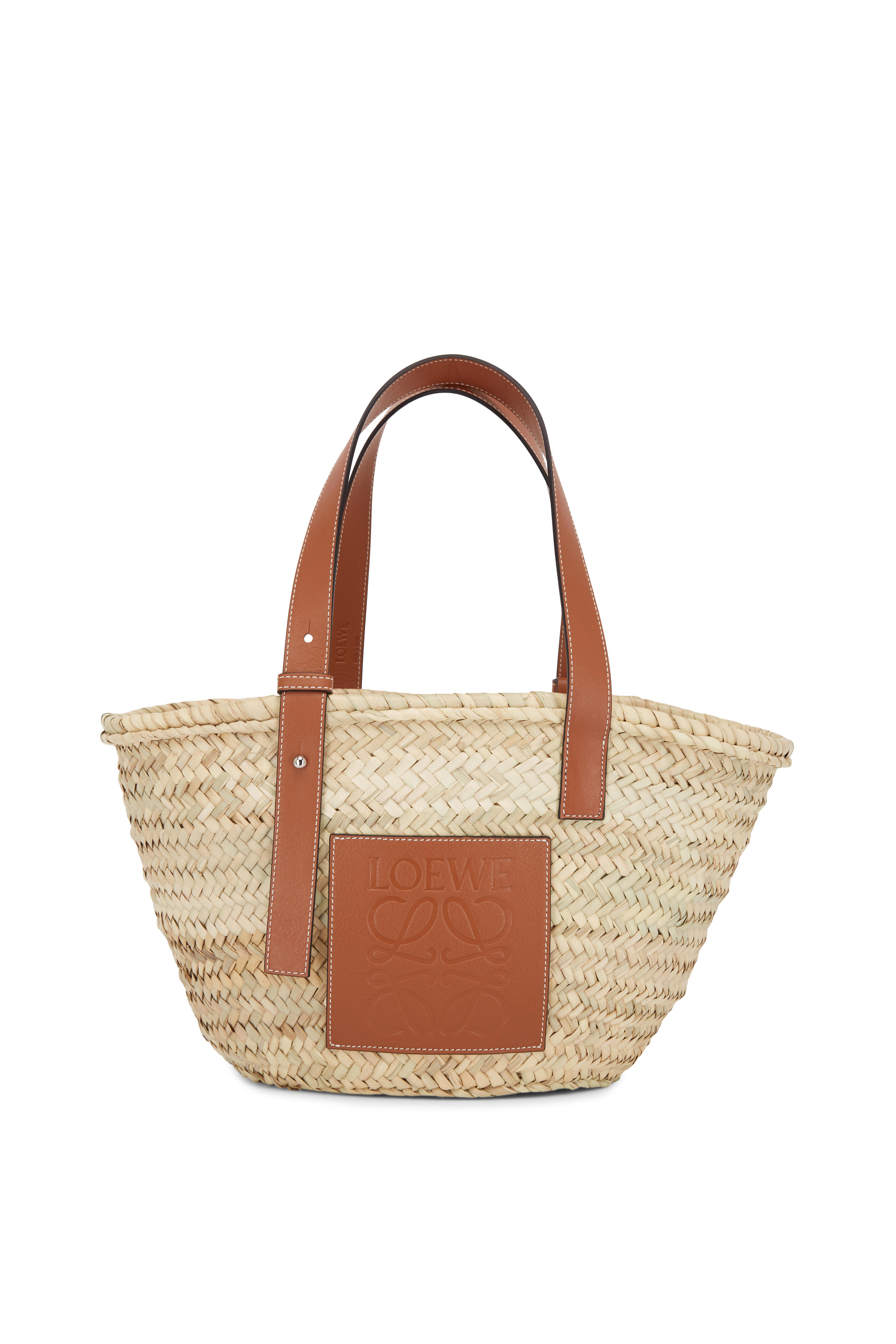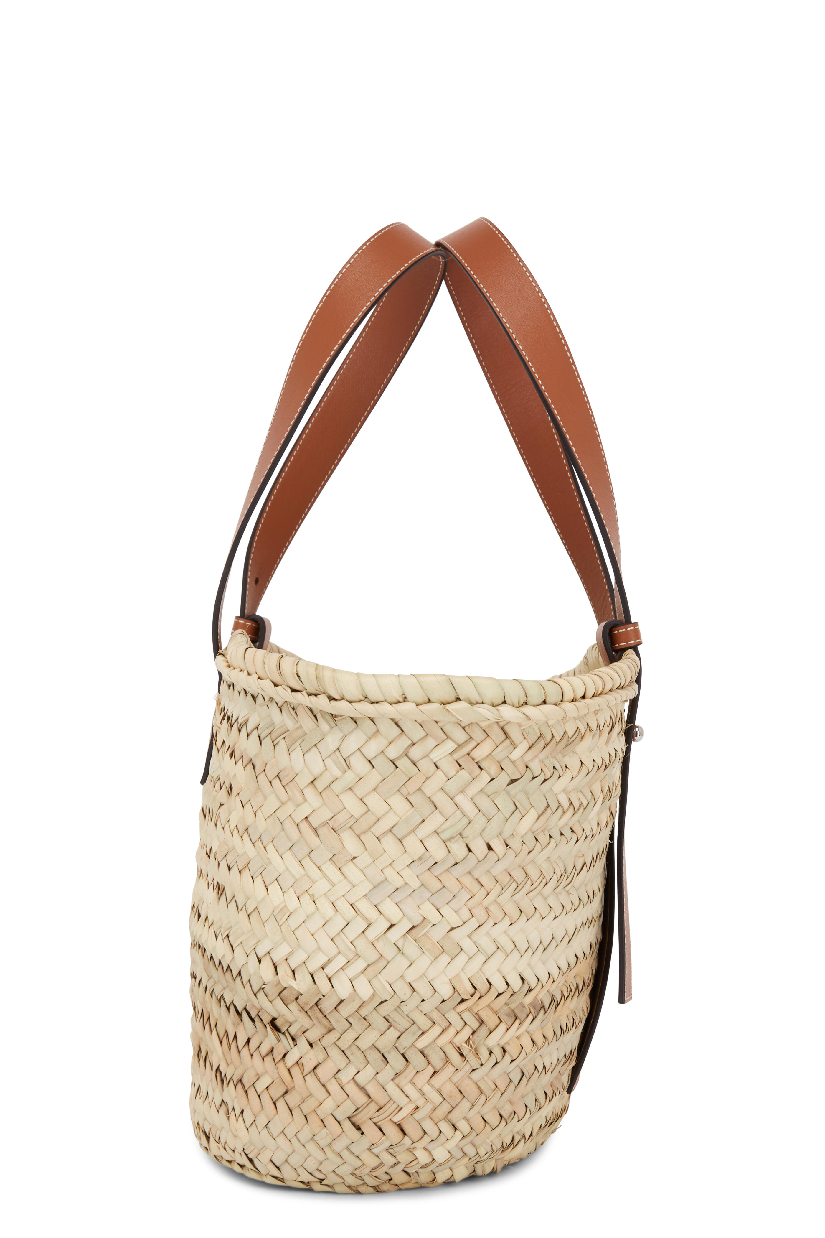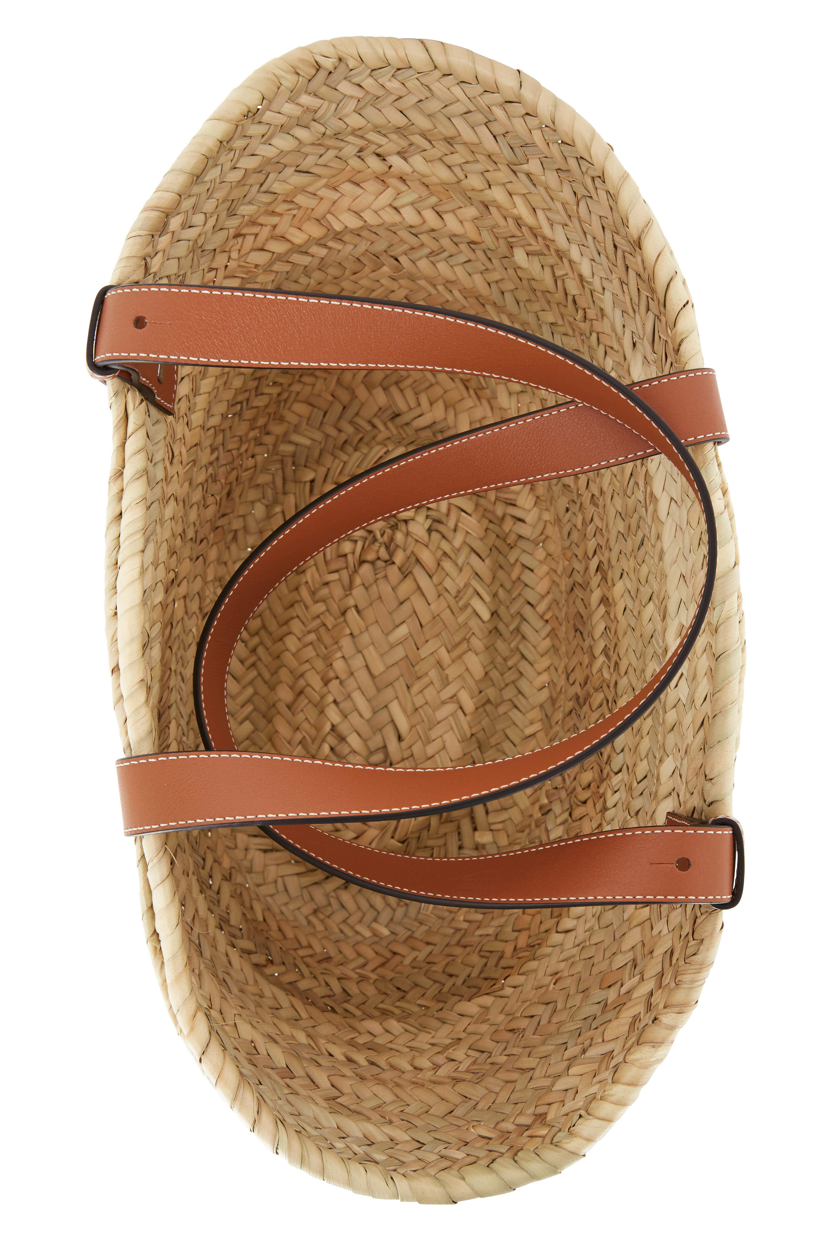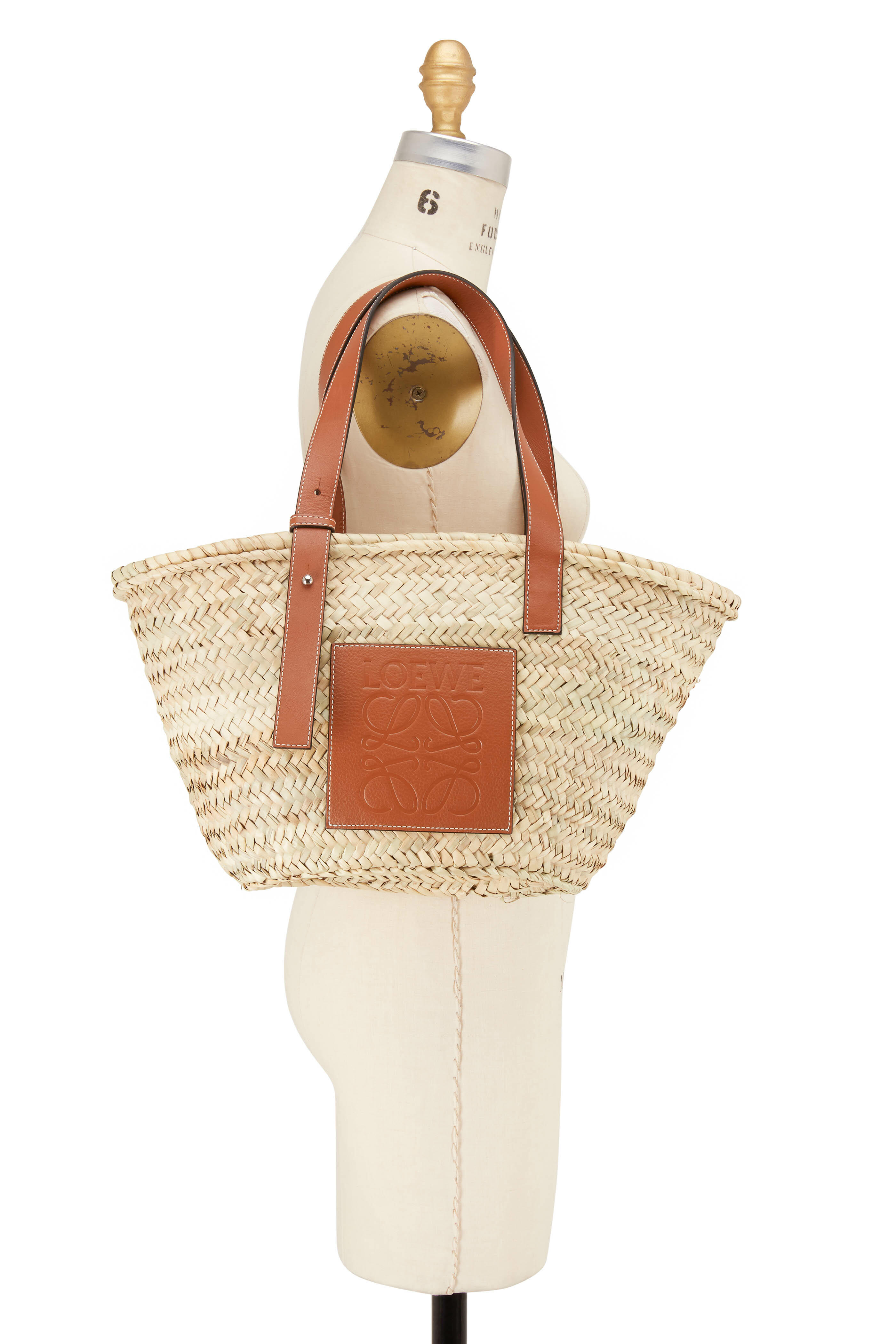 Raffia and calfskin leather. Adjustable top handles. Open top. Embossed leather logo detail. Unlined. Made in Spain. Height: 15½". Width: 10½". Depth: 6". Handle drop: 8½".