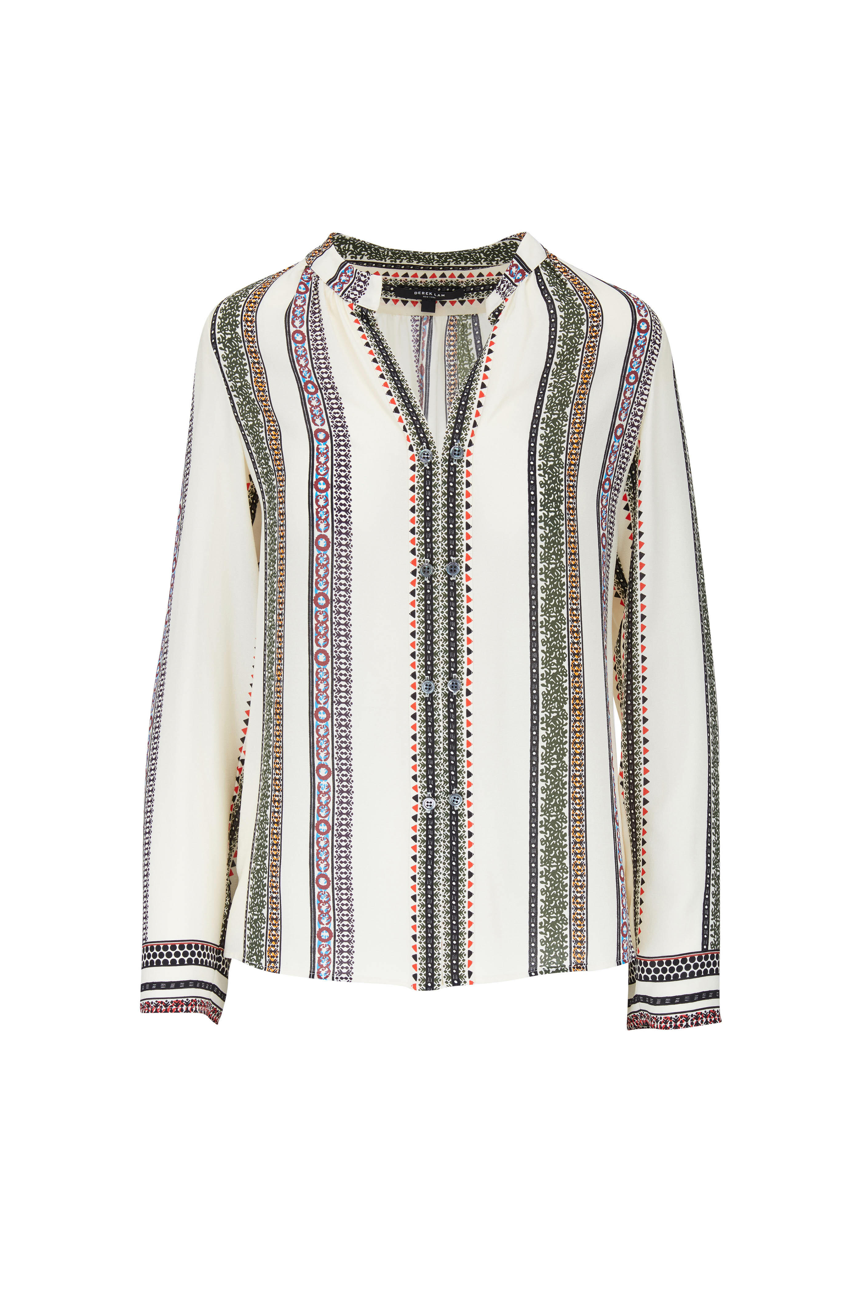 Banded collar ; v-neckline. Faux, double button placket. Vented hem. Imported. 100% silk. Dry clean.