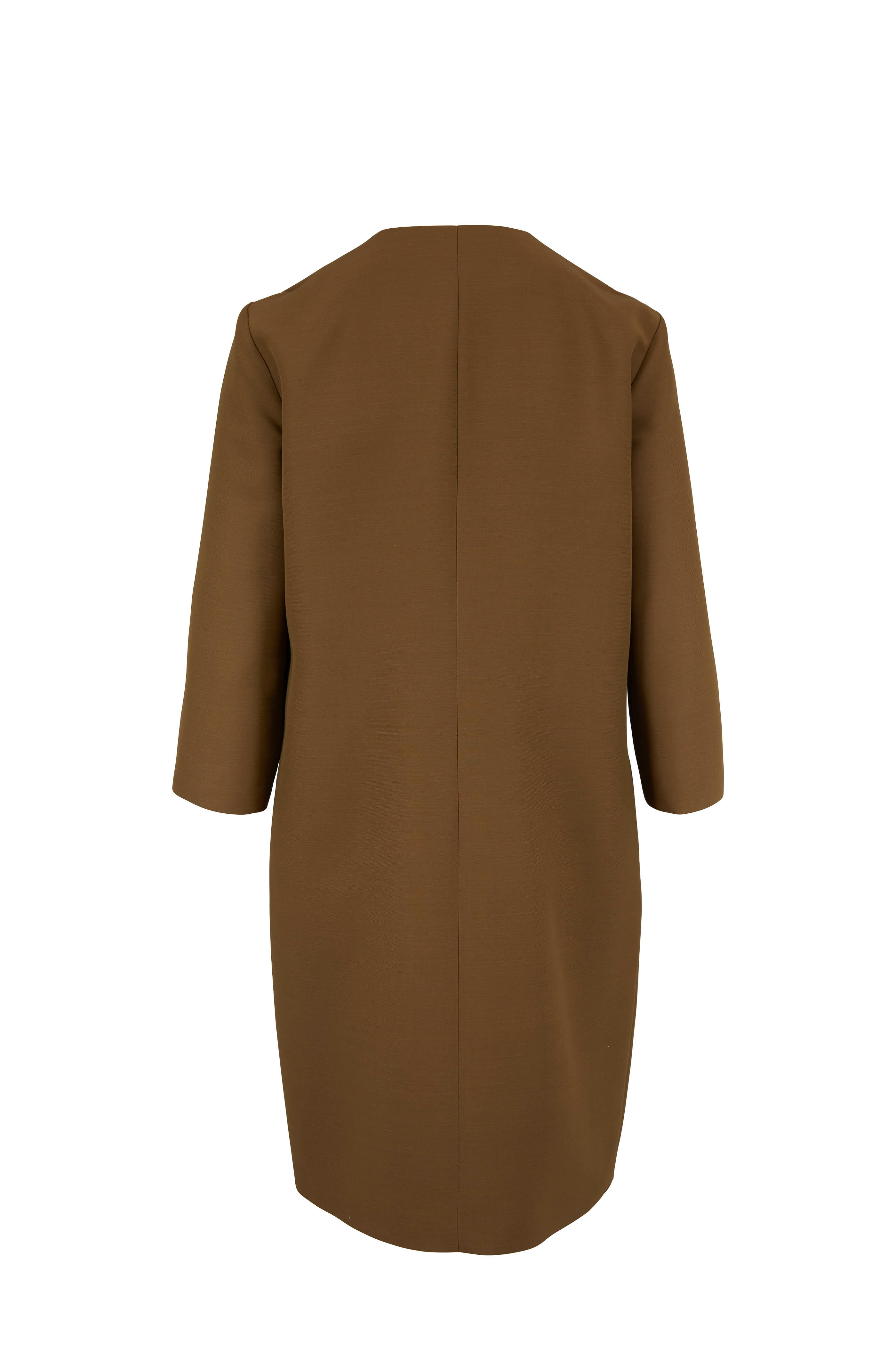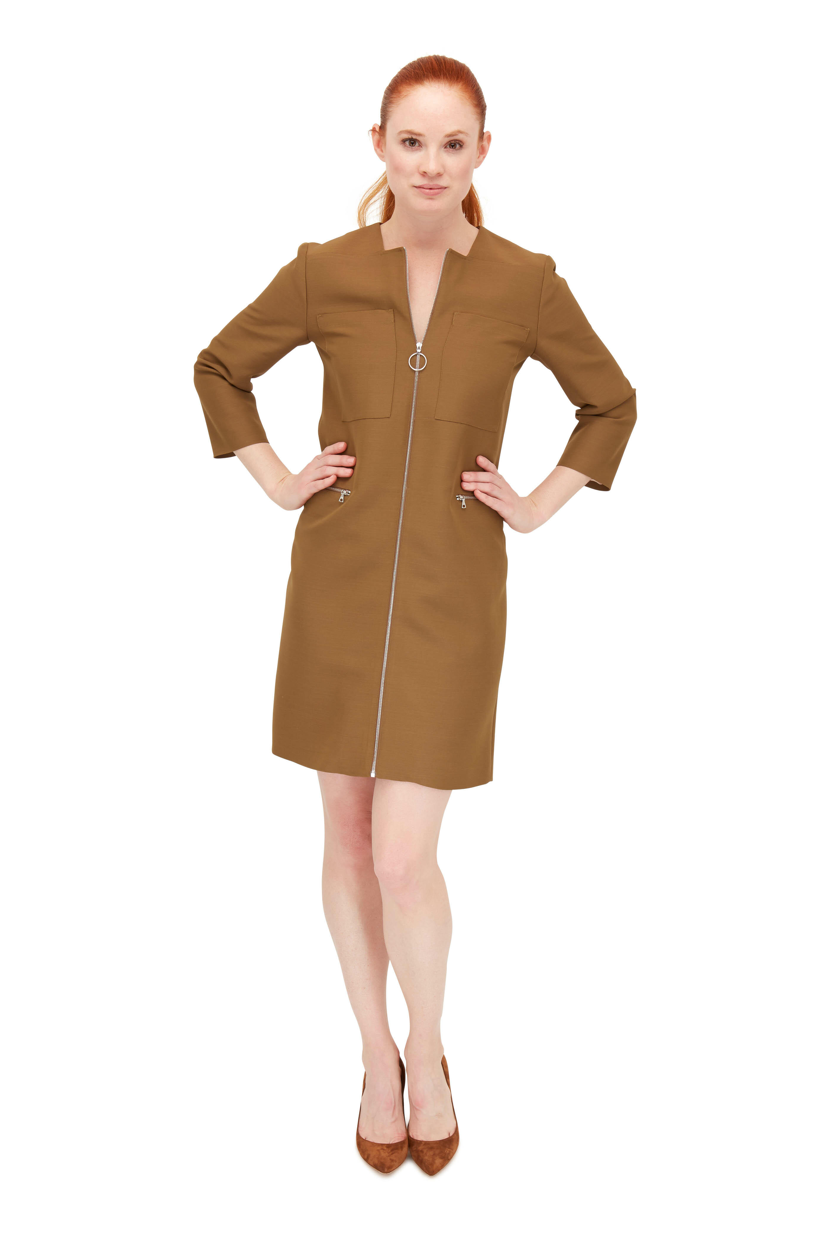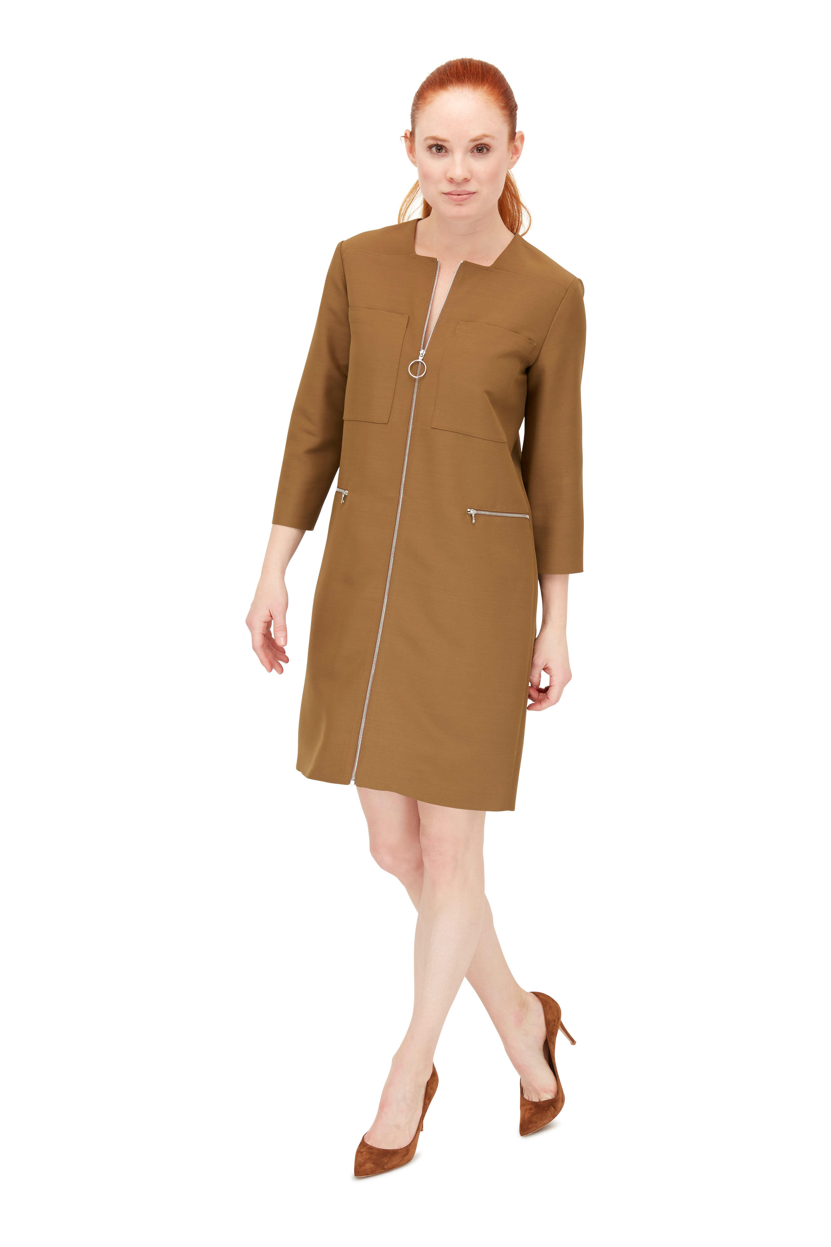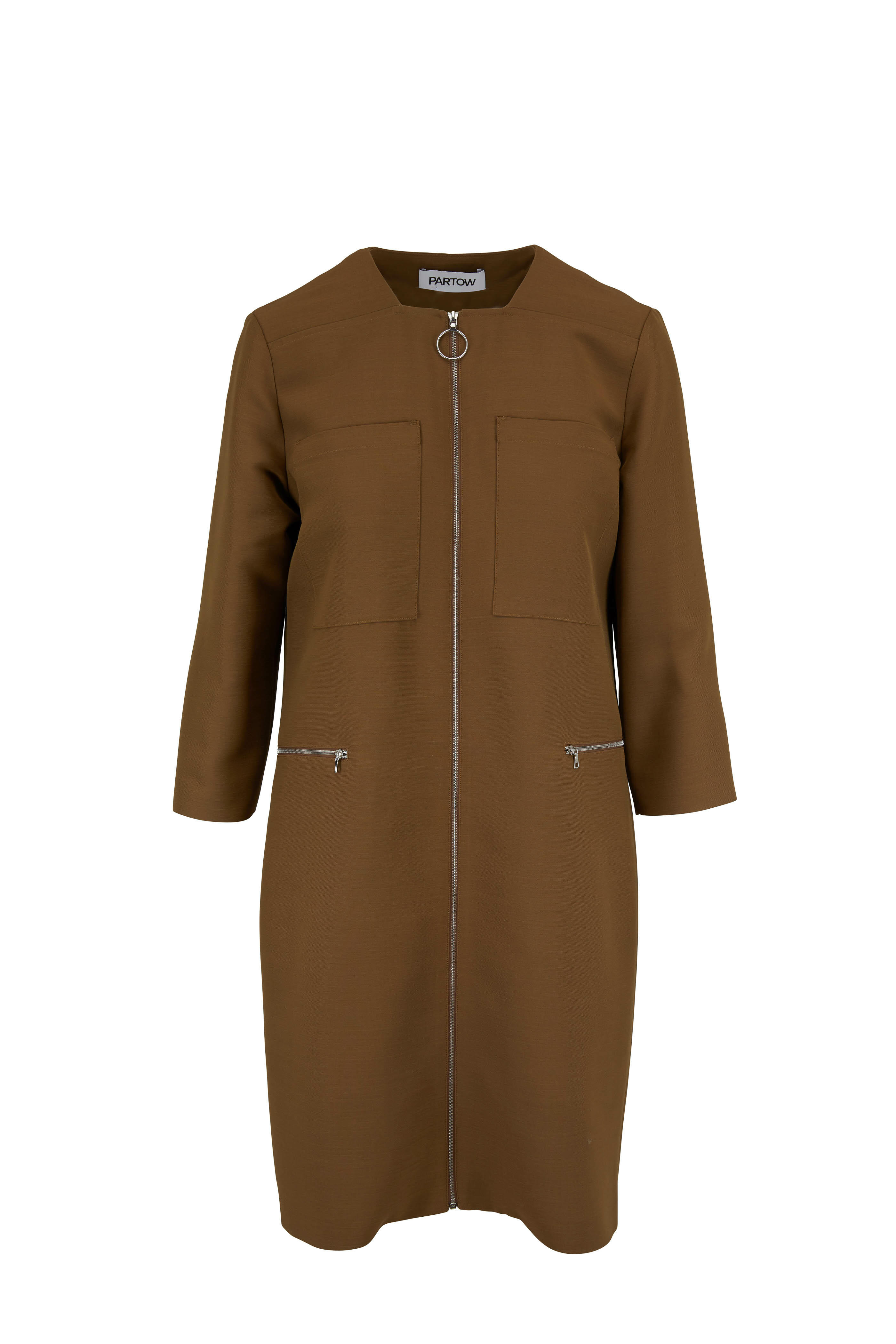 Squared neckline. Front zip closure. Three-quarter sleeves. Chest patch pockets; lower zip welt pockets. Made in the USA. 37" shoulder to hem. 73% viscose, 27% virgin wool; lining: 100% silk. Dry clean.