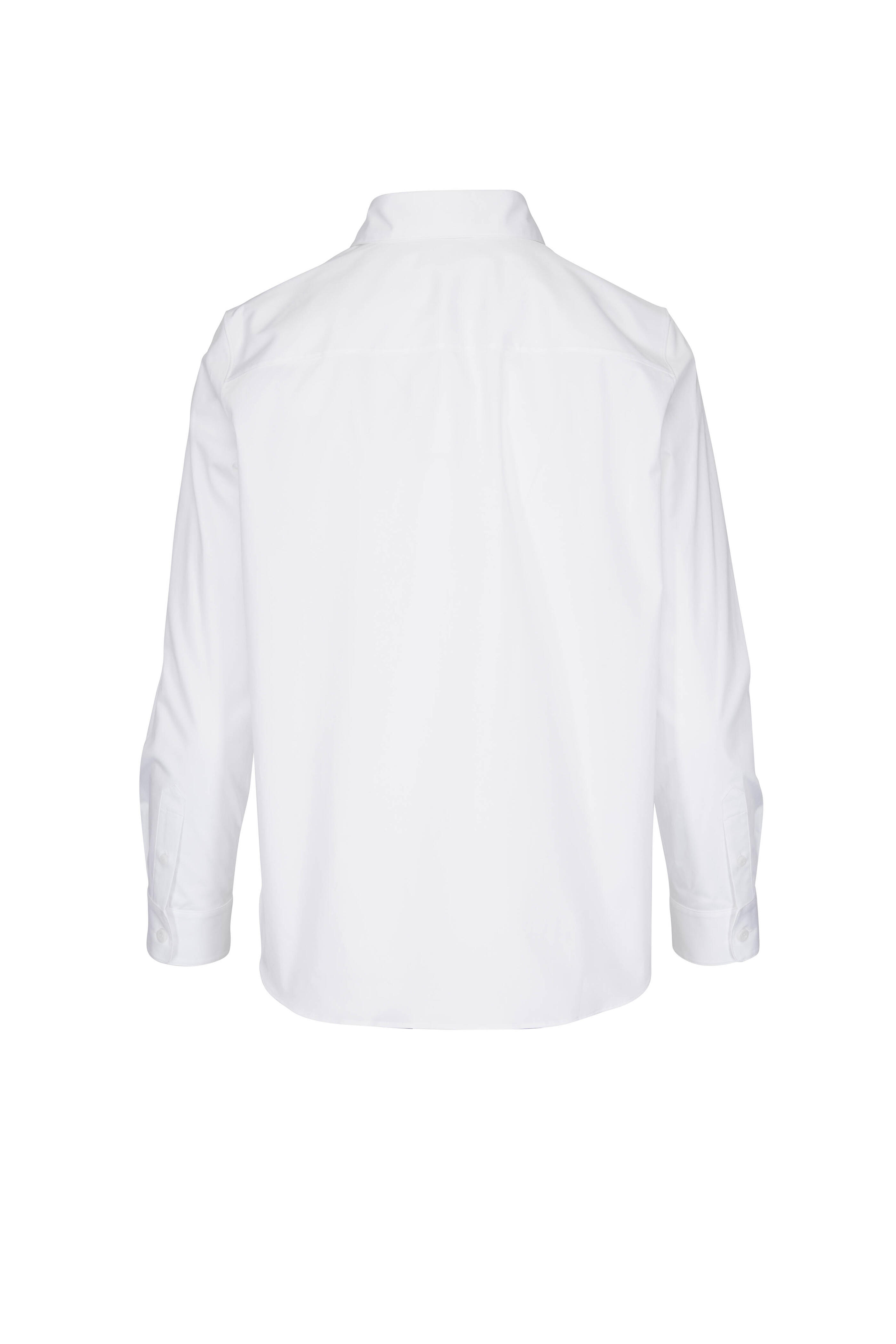 Spread collar. Concealed button-up front closure. Single button rounded cuffs. Shirttail hem. Made in the USA. 97% cotton, 3% elastane. Dry clean.