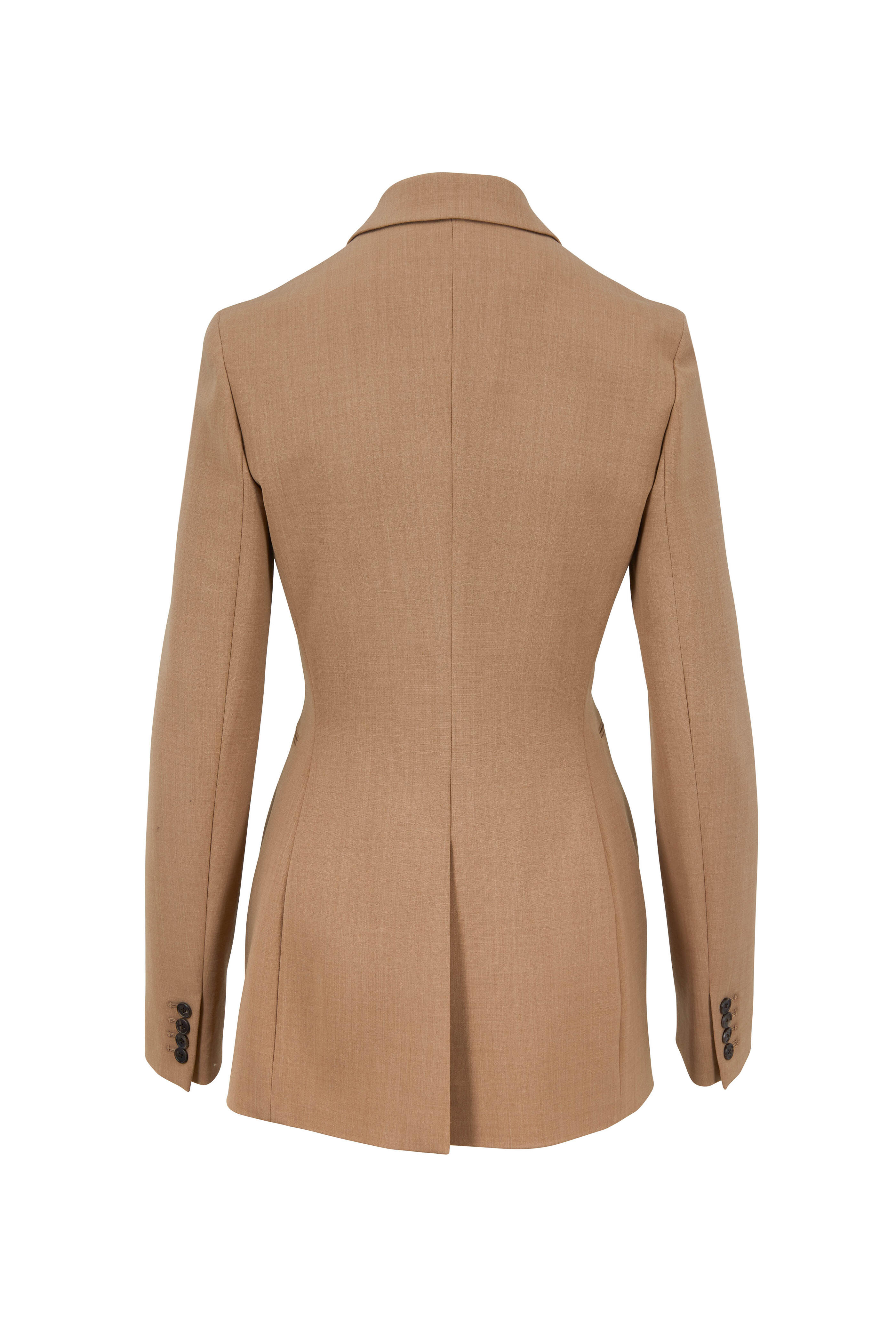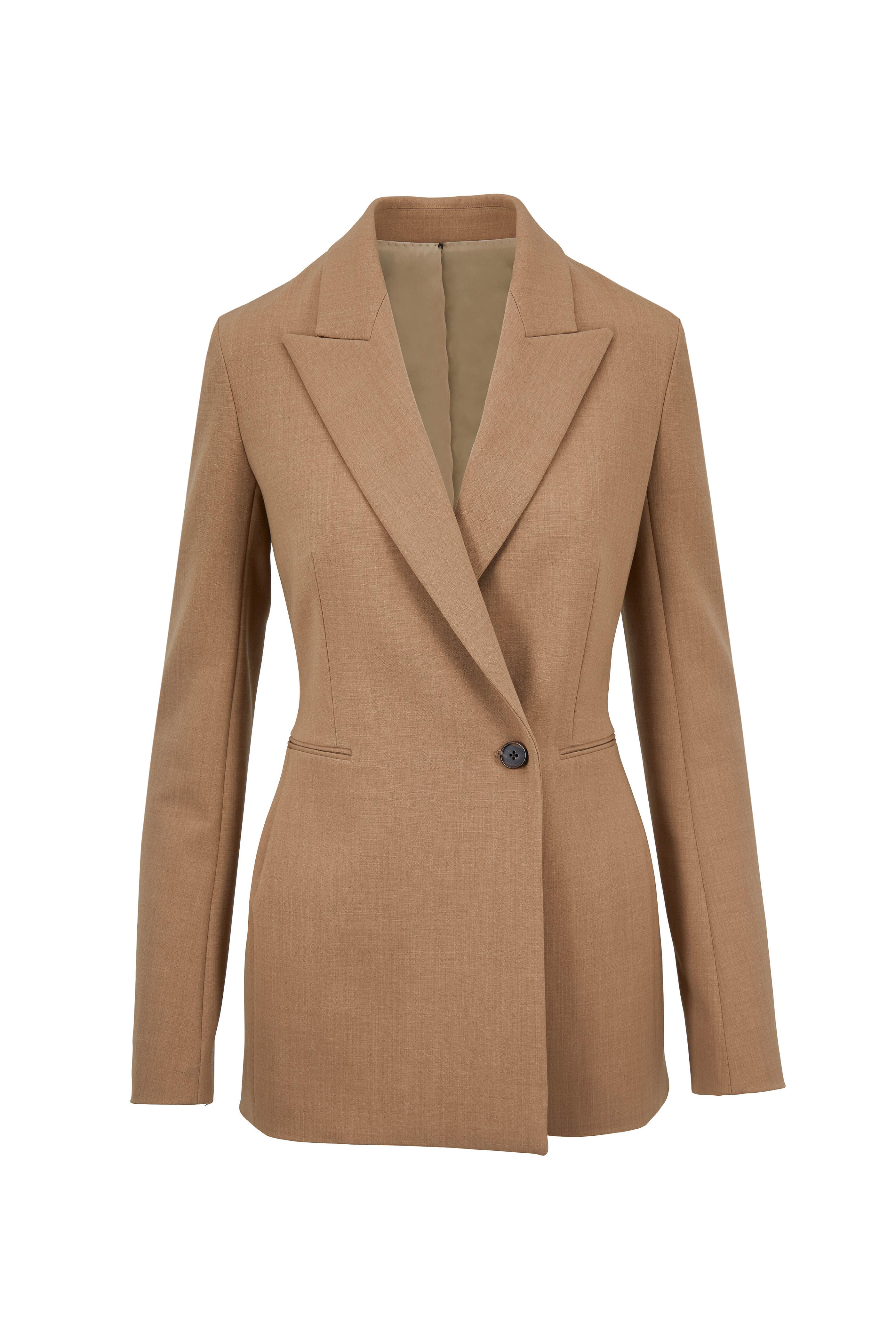 Peak lapels. Single button front closure. Lower front welt pockets. Back vent. Made in the USA. 100% wool; fully lined. Dry clean.