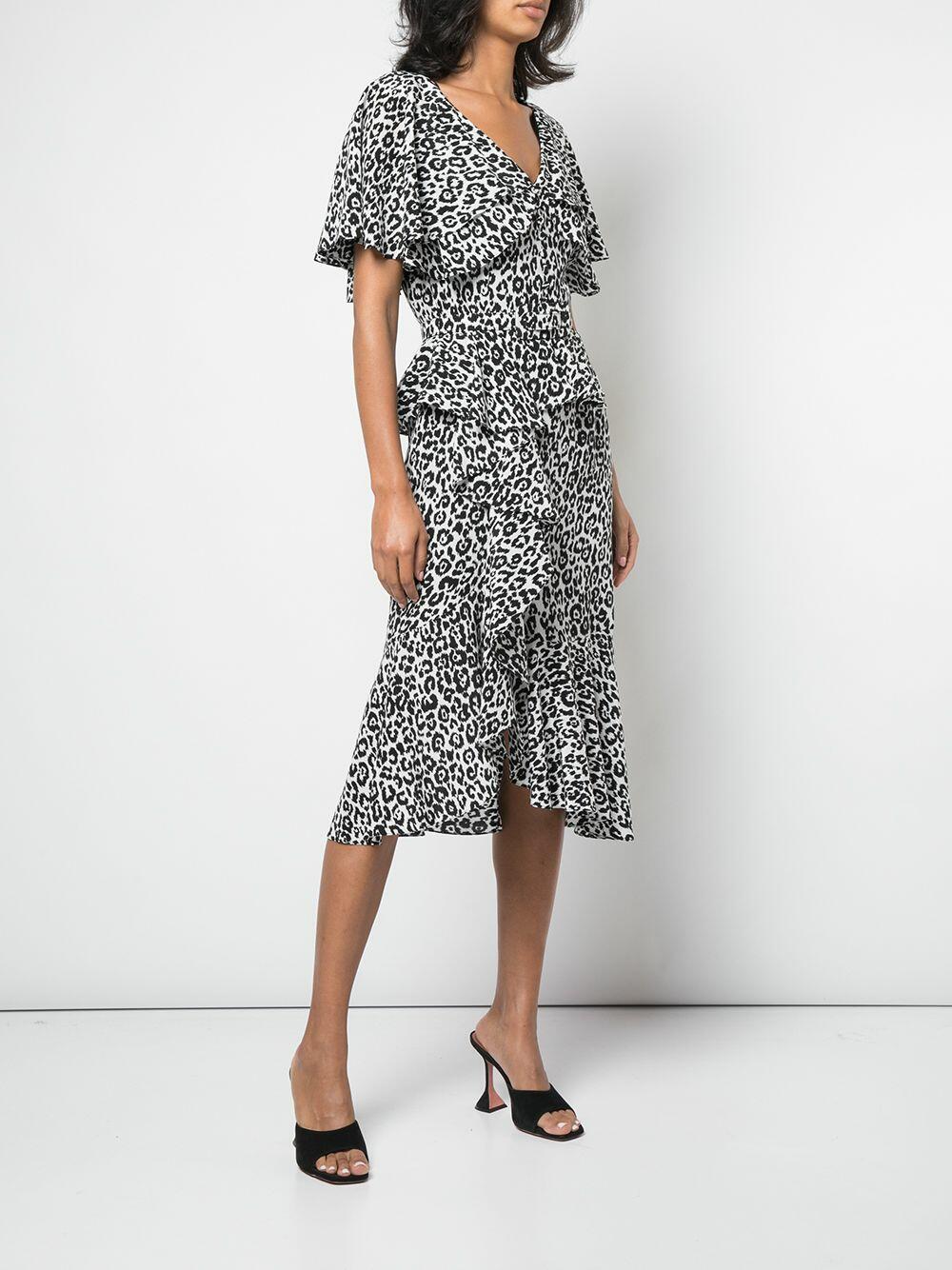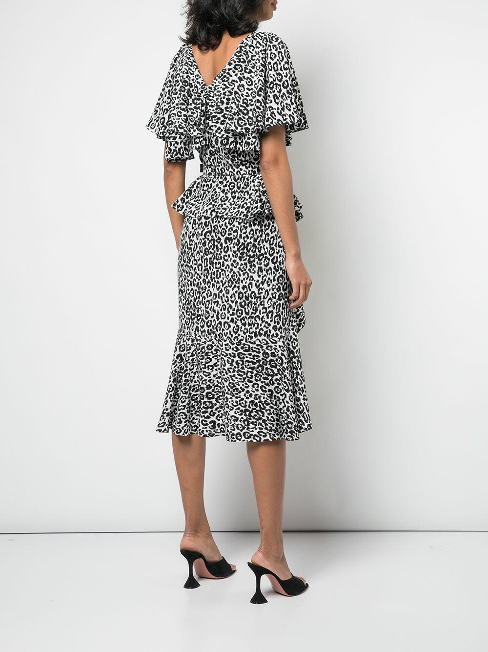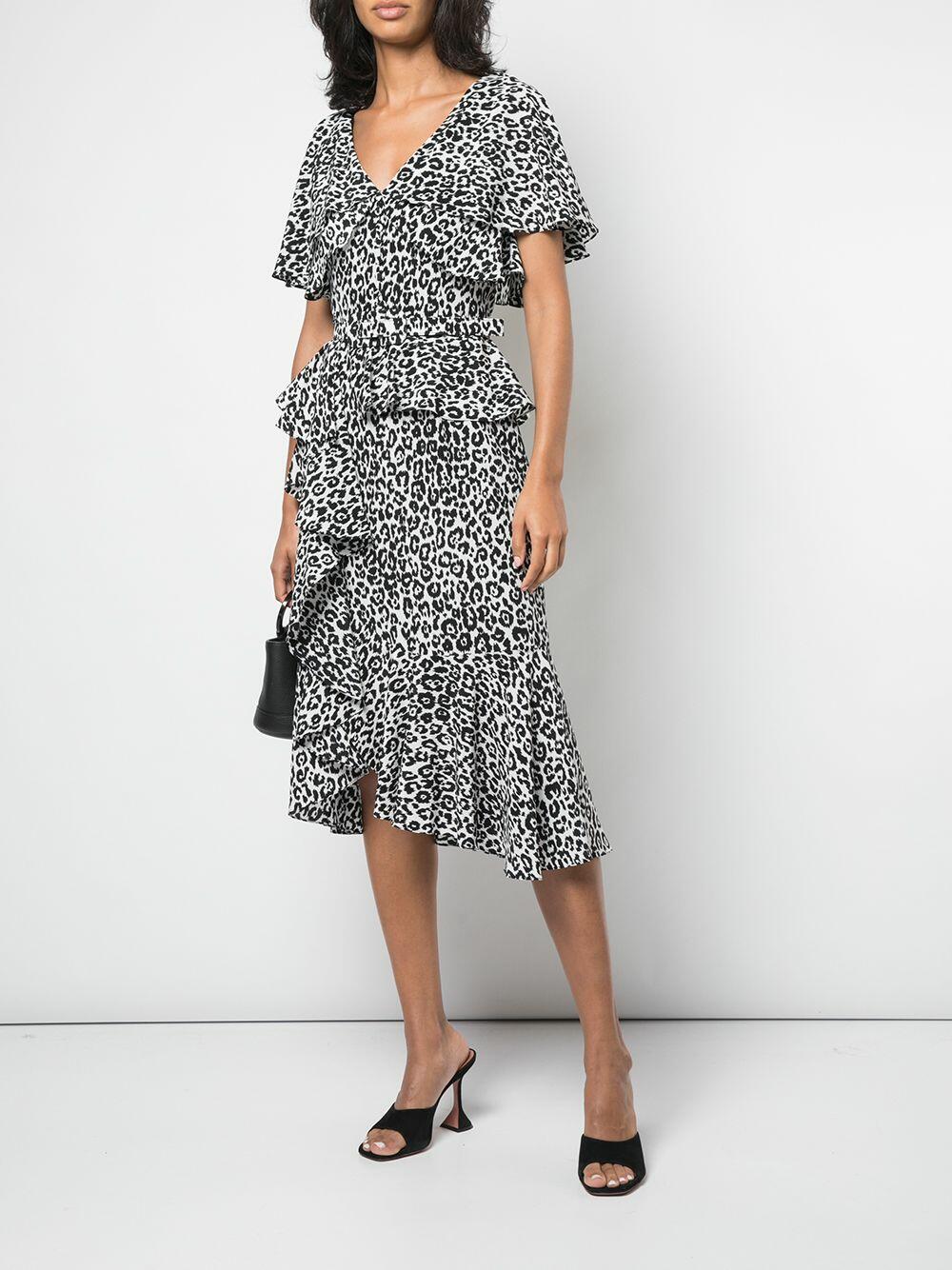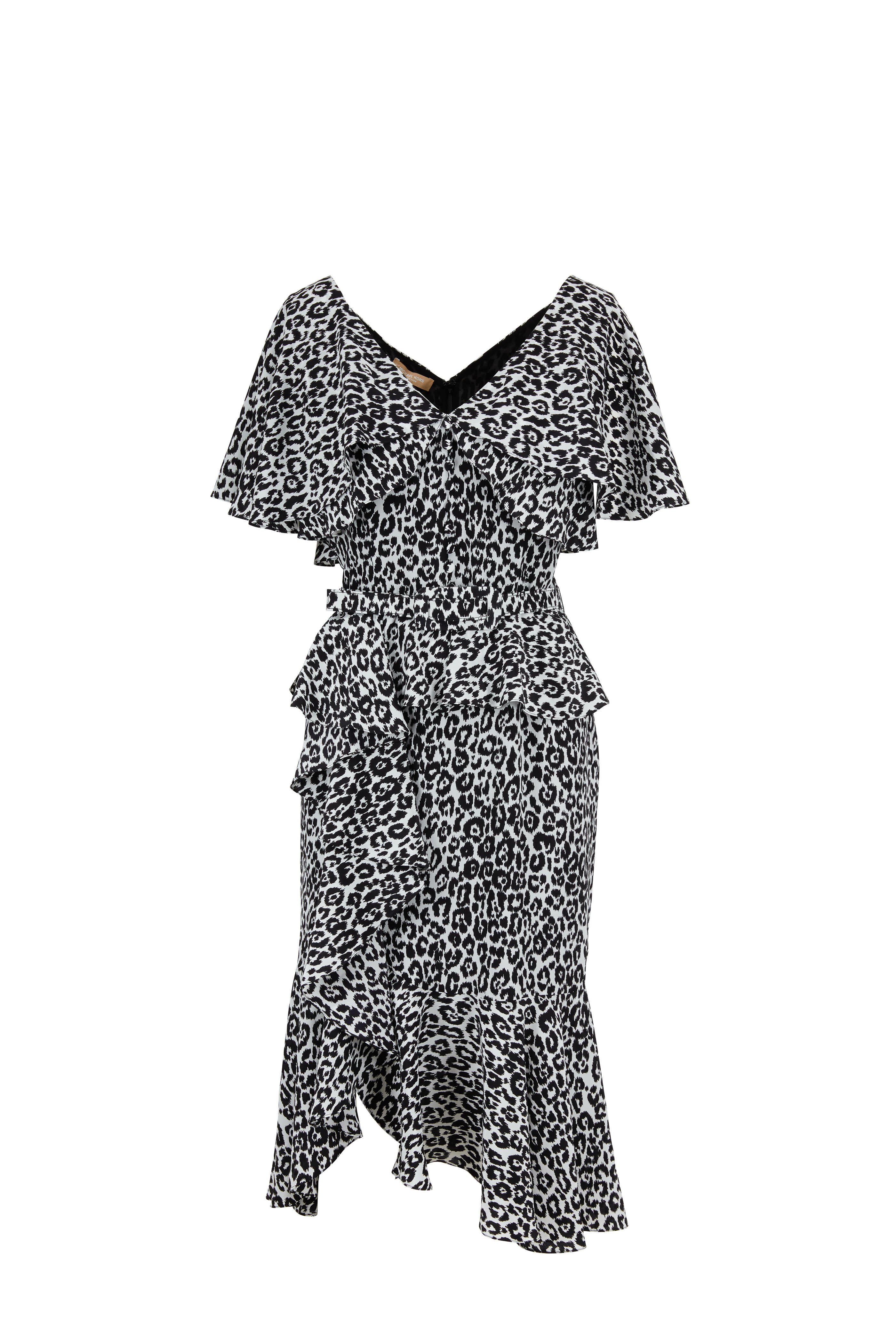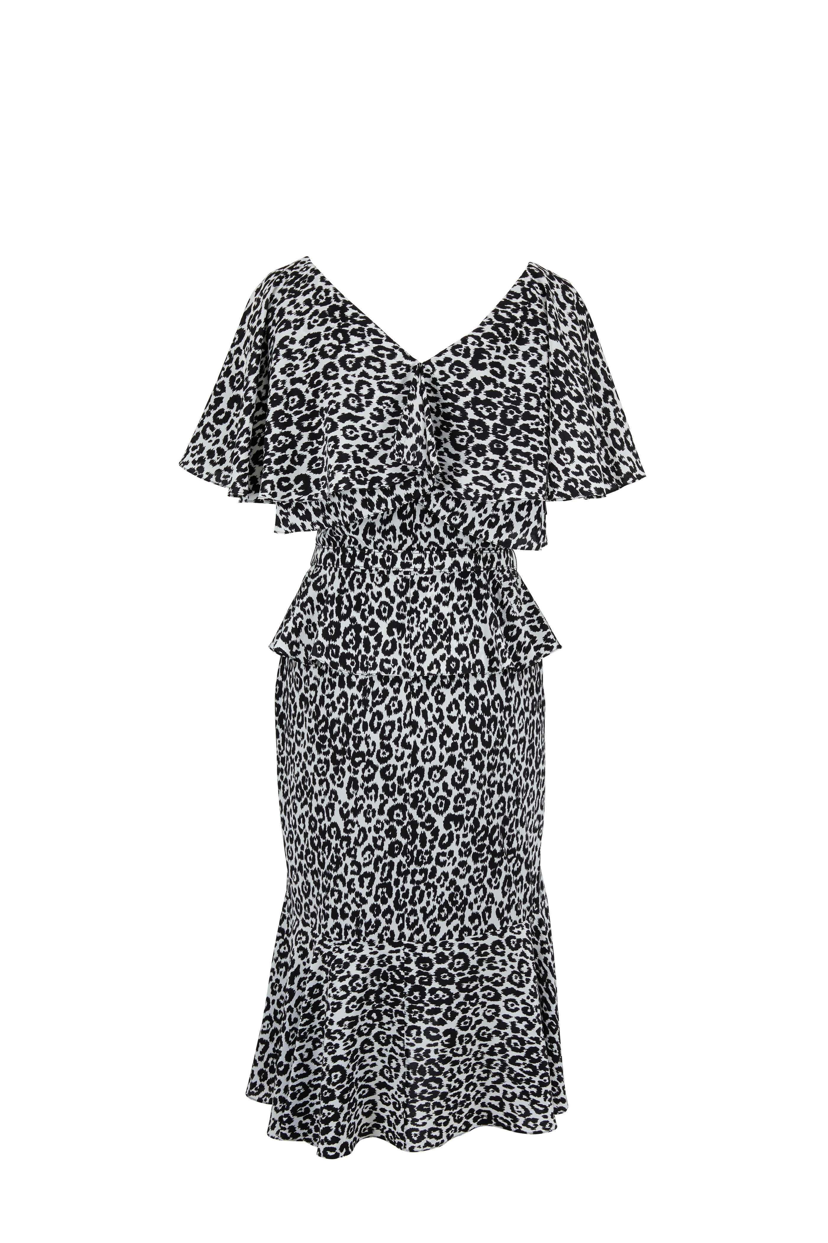 V-neckline; v-back. Concealed back zip. Short, flutter sleeves. Side slit, flounce hem. Removable self belt. Front covered button detailing. Made in Italy. 44" shoulder to hem. 100% silk; lining: 100% silk. Dry clean.