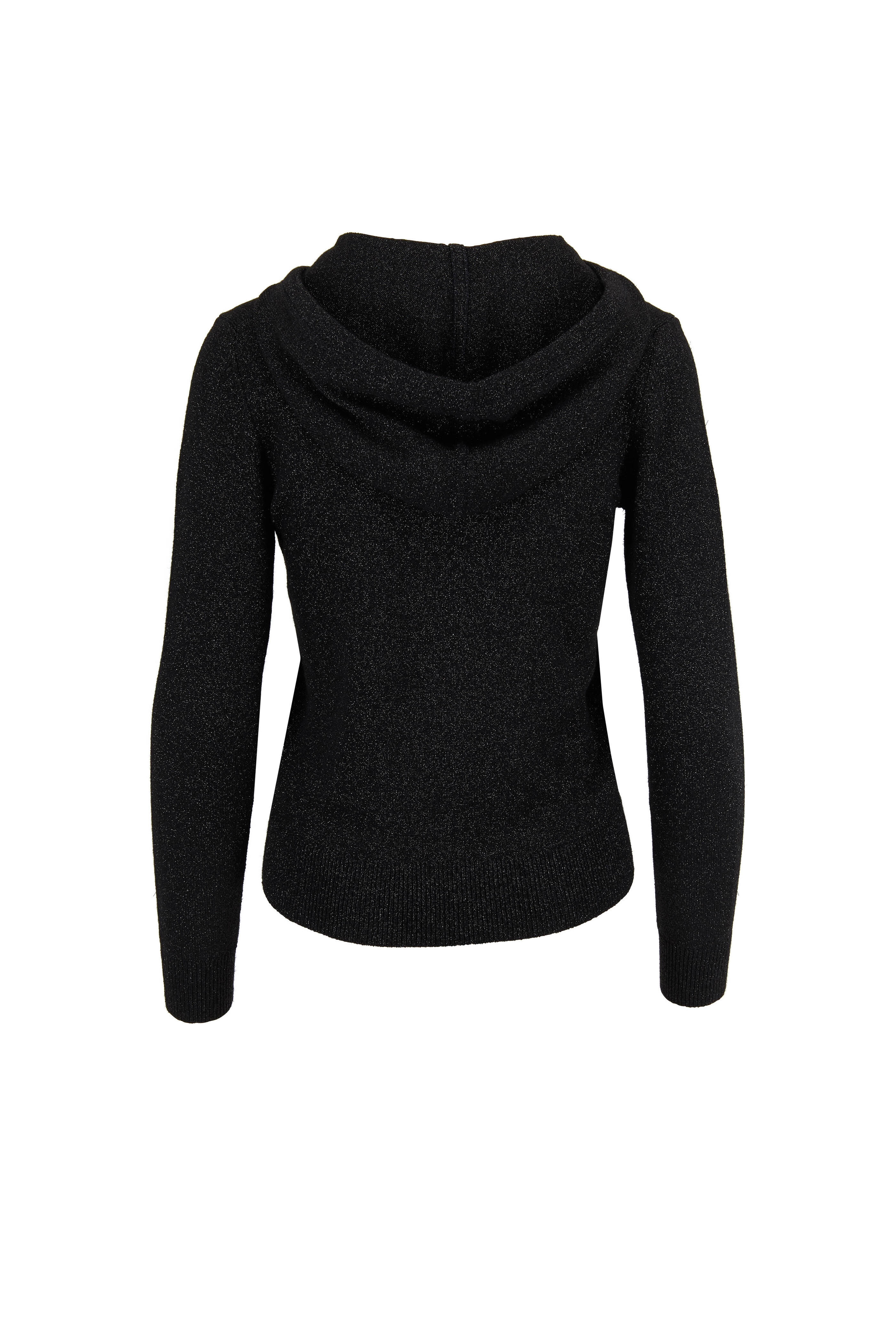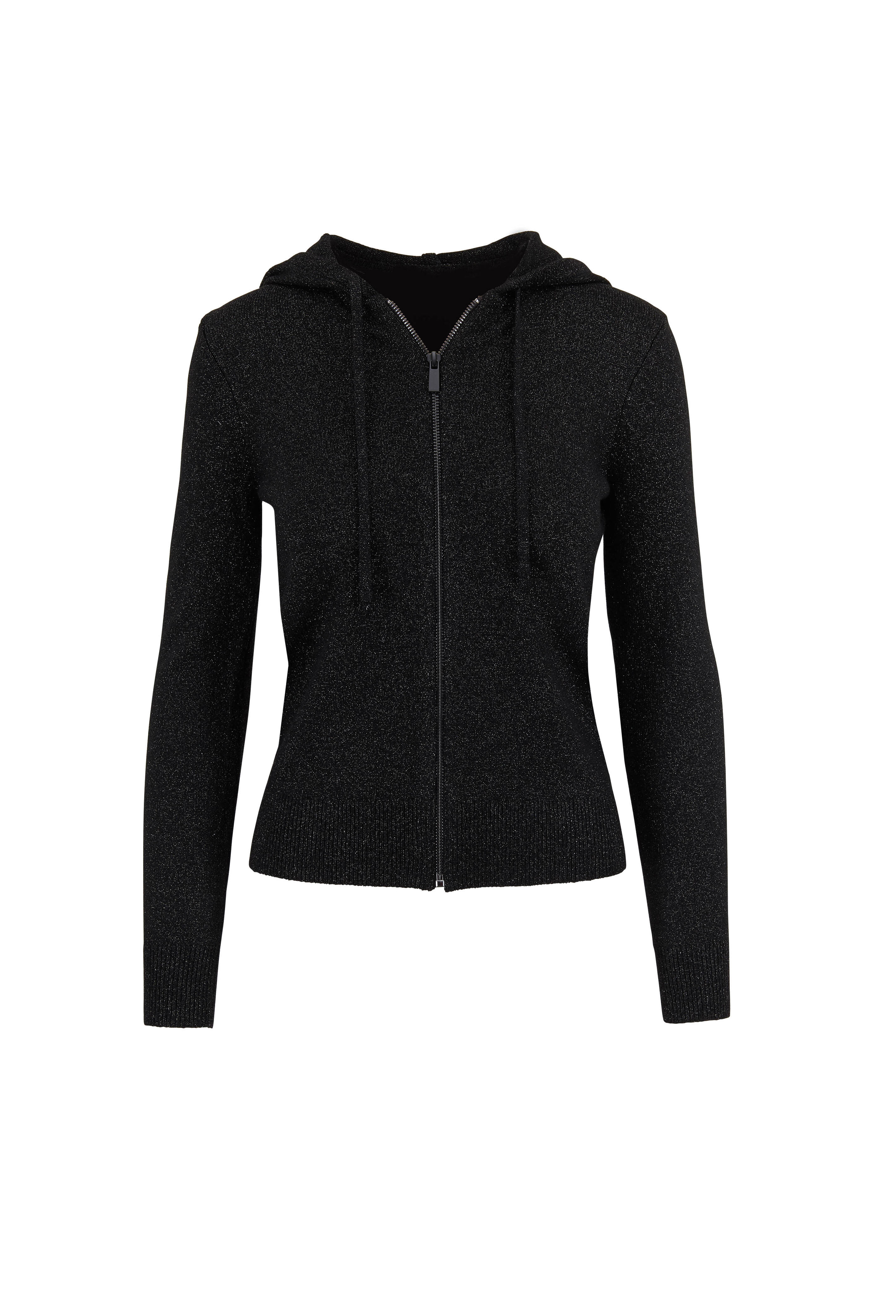 Attached, drawstring hood. Front zip. Ribbed trim. Imported. 80% viscose, 20% metallic. Dry clean.