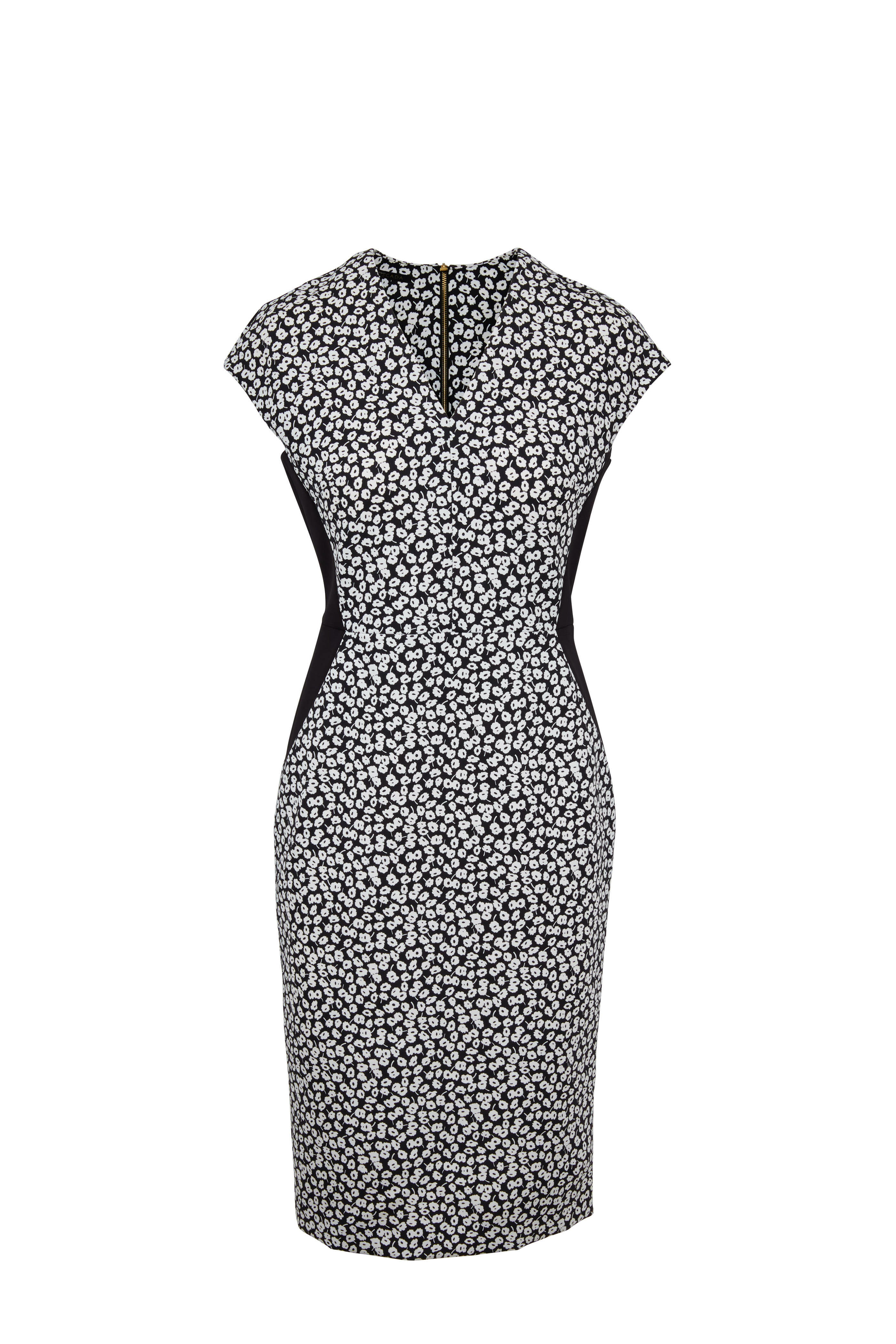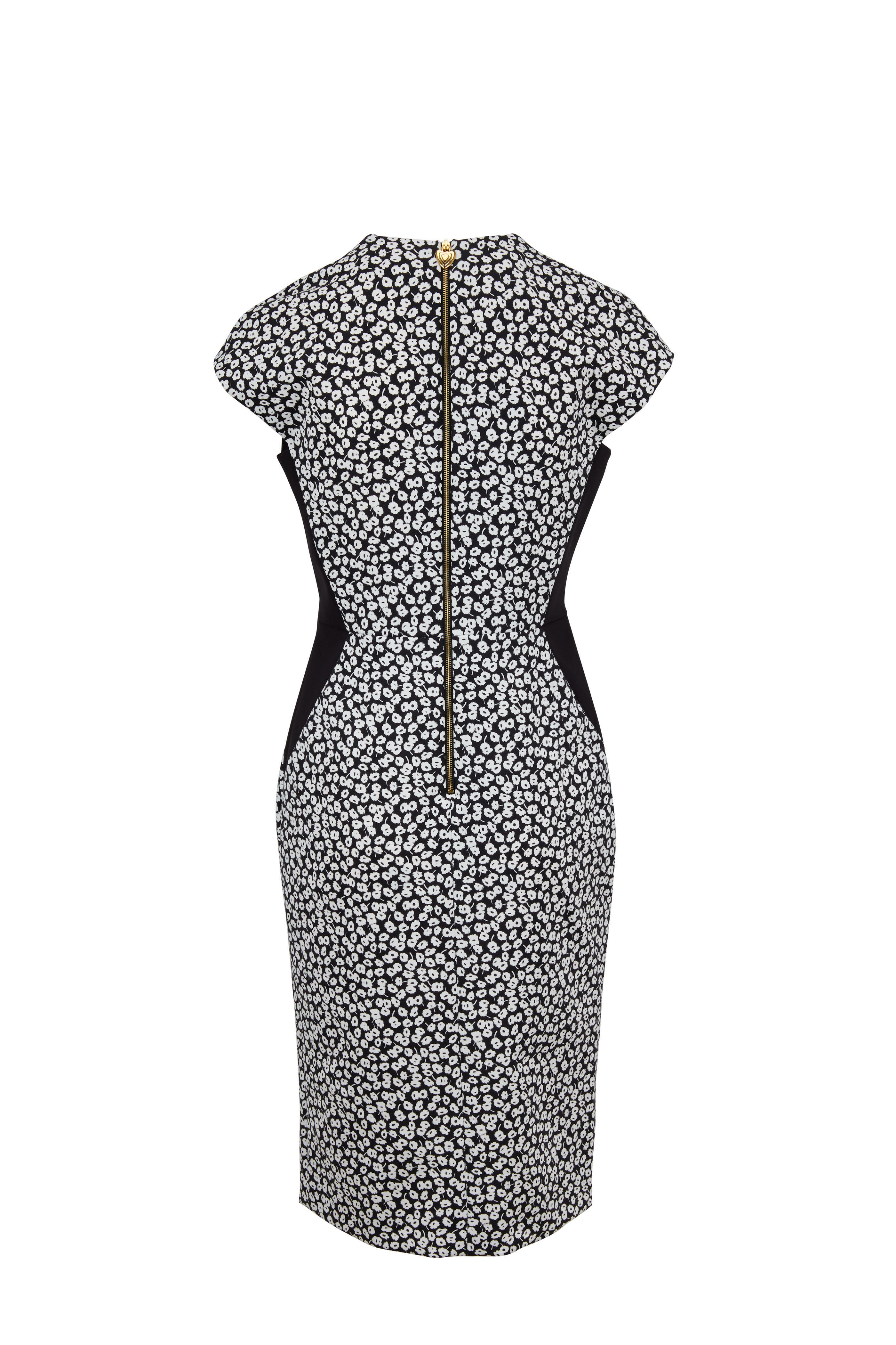 V-neckline. Exposed gold-toned back zip with gold-toned heart pull. Cap sleeves. Nipped at waist. Straight hem. Imported. 86% polyamide, 16% elastane; unlined. Dry clean.