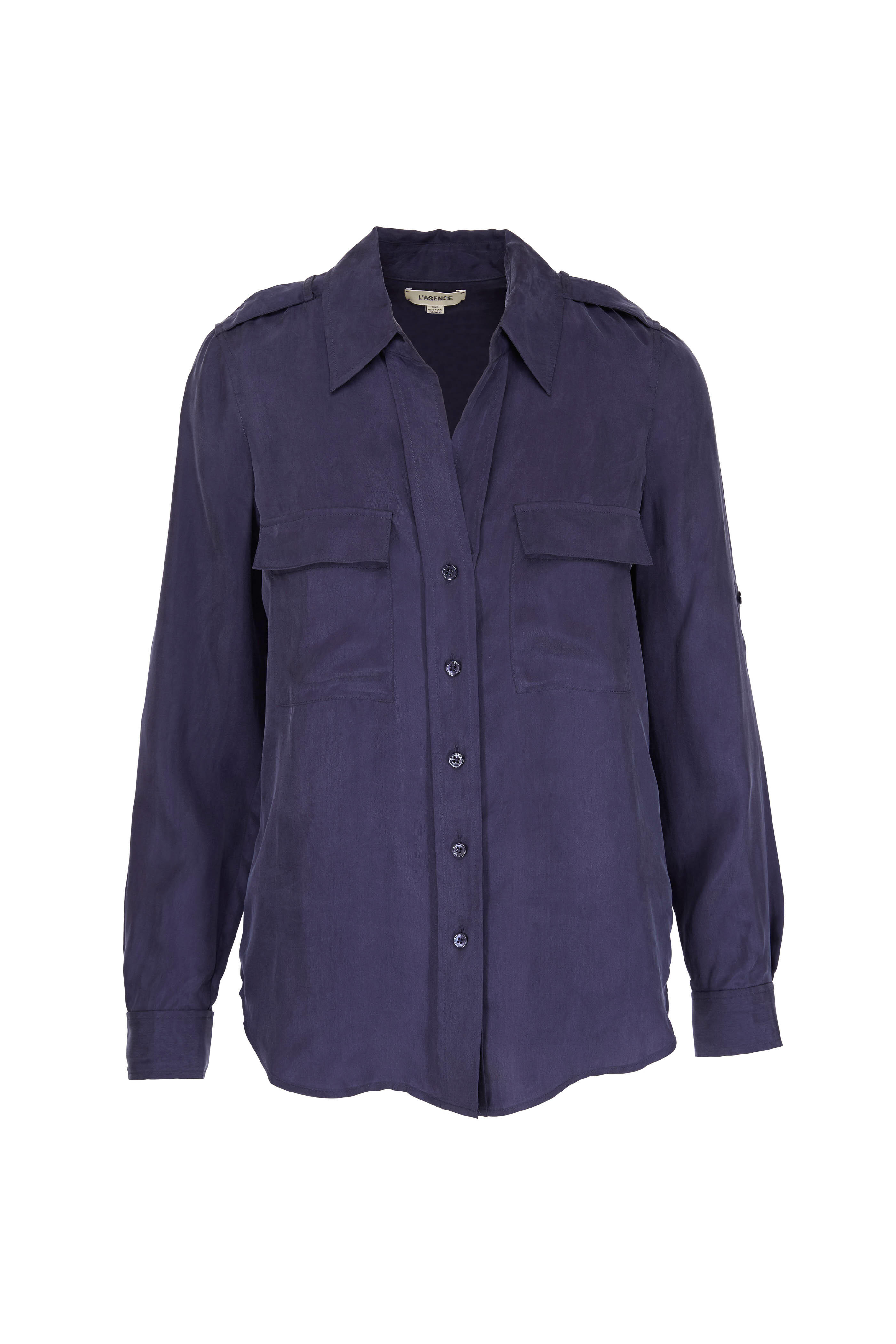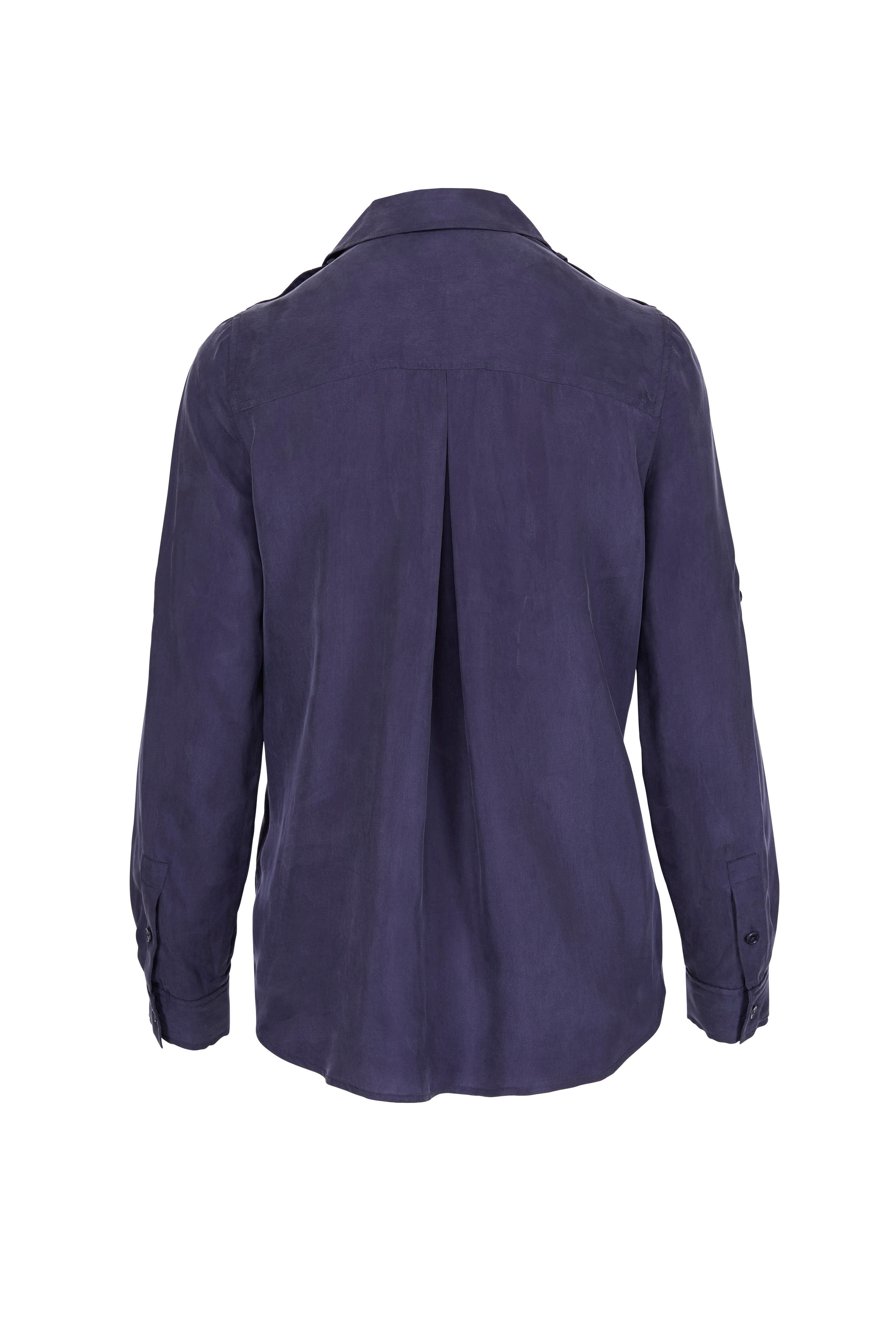 Spread collar. V-neckline. Button-up front closure. Single button squared cuffs. Chest patch pockets. Shoulder epaulettes. Imported. 100% cupro. Dry clean.