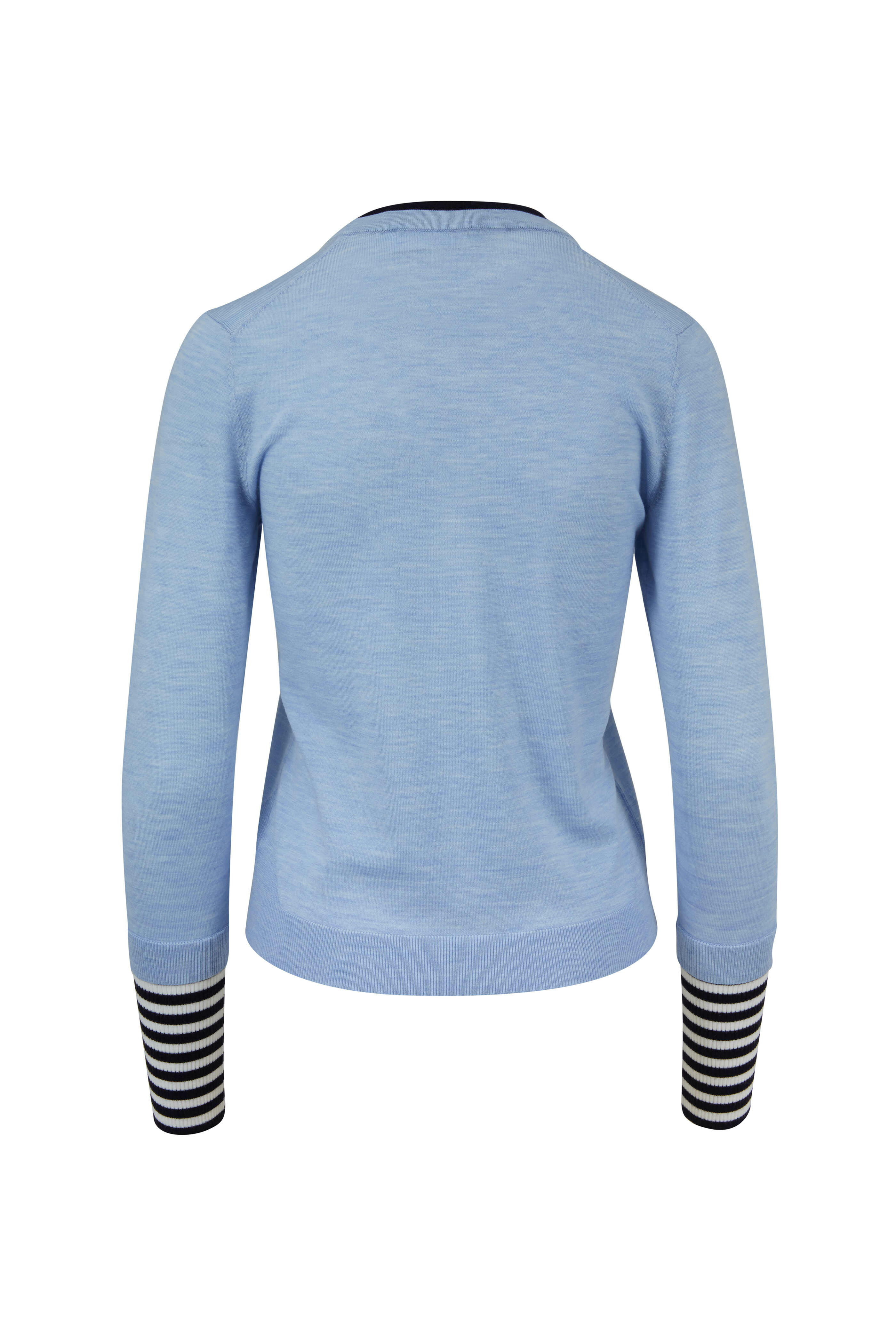 Layered round neckline. Contrast striped, ribbed cuffs. Ribbed hem. Imported. 94% merino wool, 5% nylon, 1% elastane. Dry clean.