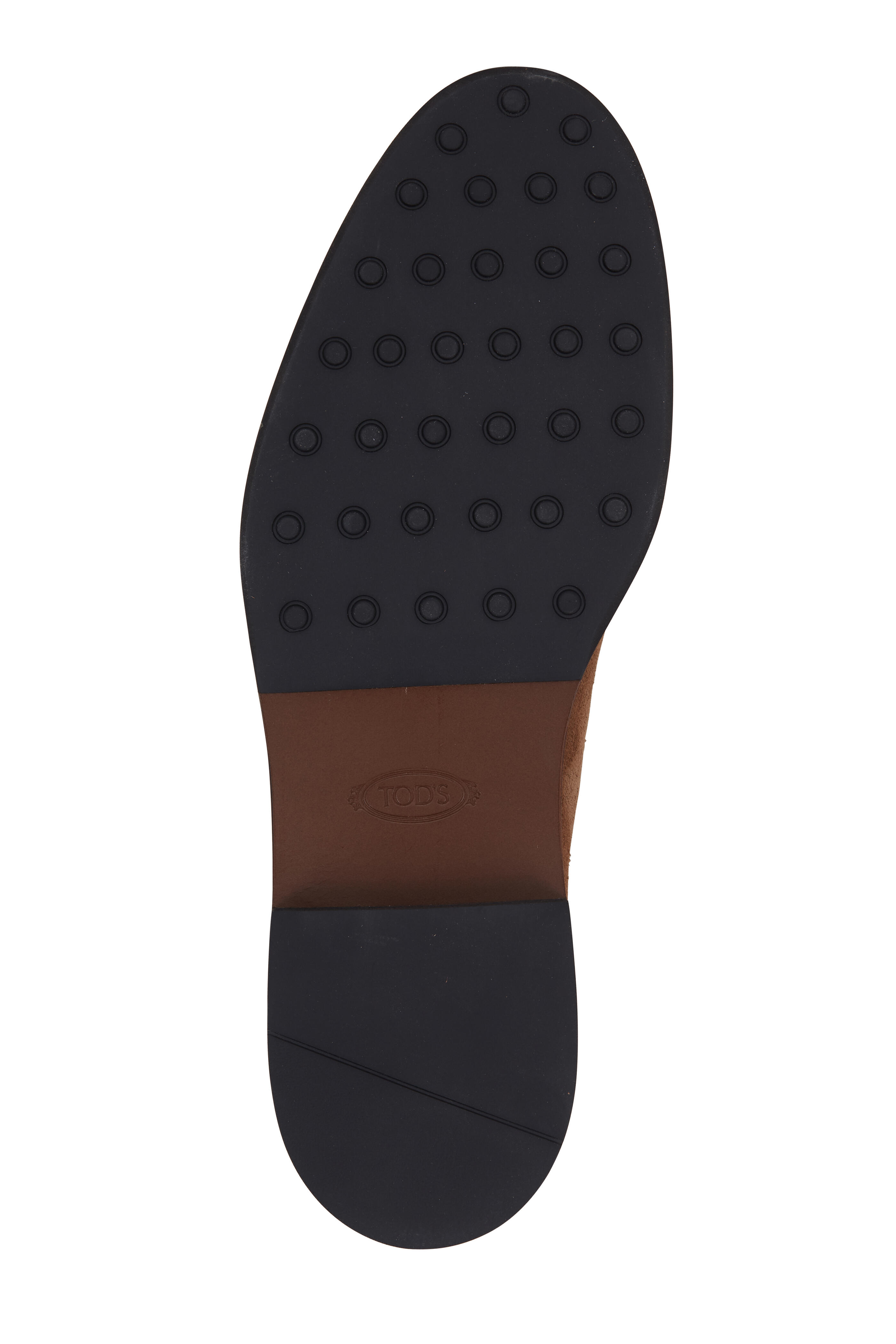 Calfskin suede upper. Almond toe. Five eyelet lace-up closure. Leather lining and insole. Signature pebbled rubber sole. Made in Italy.