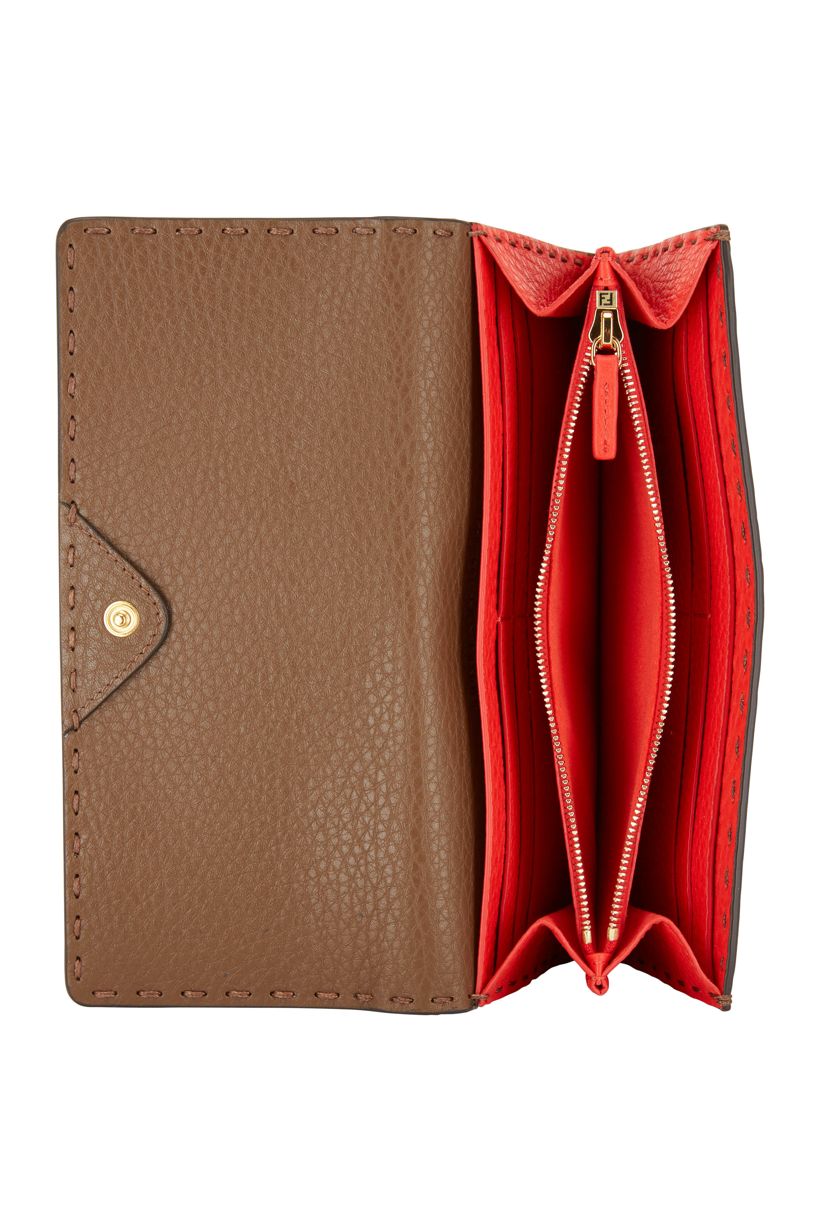 Grained calfskin leather. Flap front, snap closure. Tonal top-stitching. Embossed logo detail. Interior zip compartment, ten card slots, four open compartments, one front slit pocket. Lined in contrast color leather. Made in Italy. Width: 7 ½". Height: 4". Depth: 1".