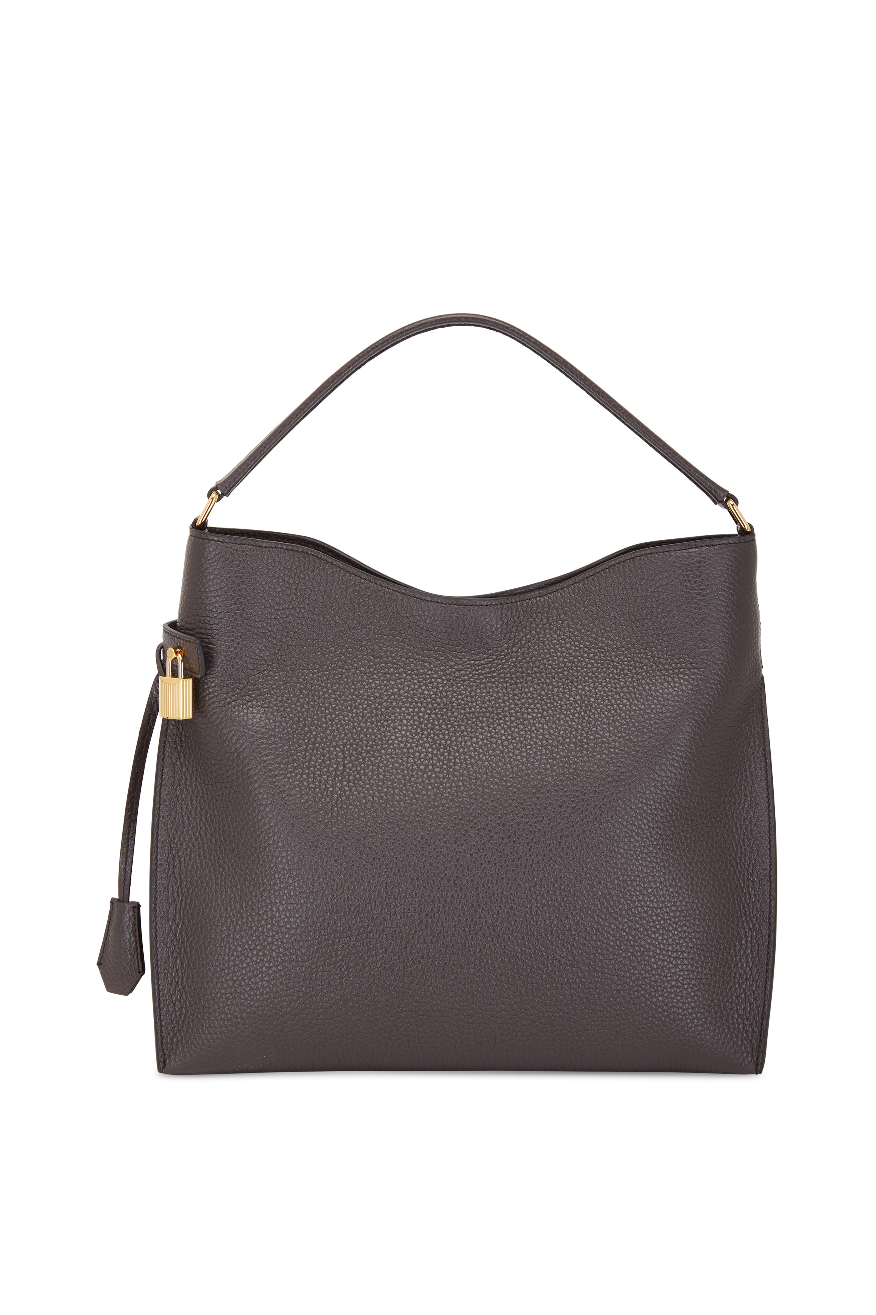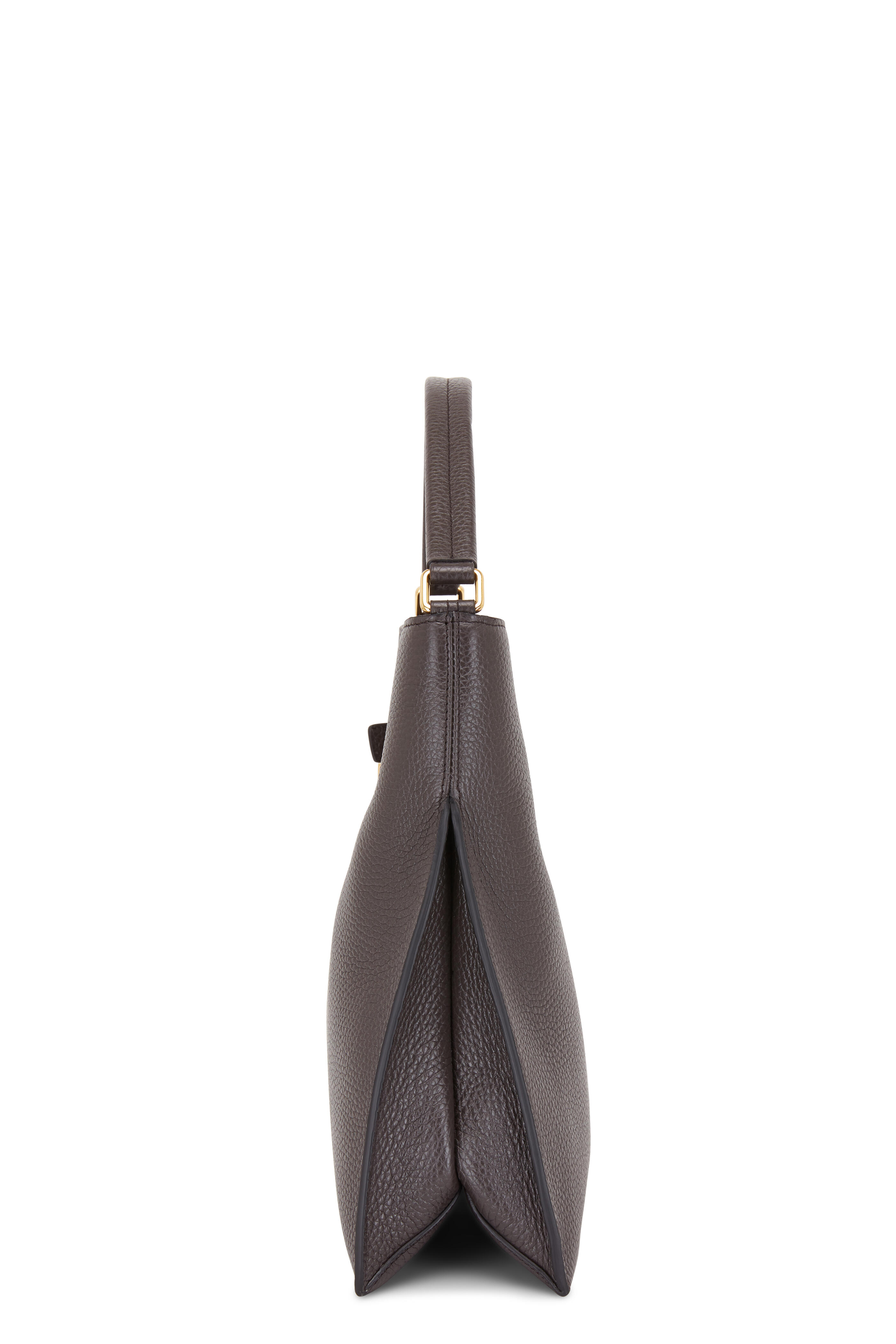 Grained calfskin leather. Padded top handle. Concealed center magnetic snap closure. Front zip pocket with pad-lock closure. Interior zip pocket. Detachable zip pouch pocket. Lined in cotton canvas. Made in Italy. Width: 13". Height: 12". Depth: 4 ½". Handle drop: 7".