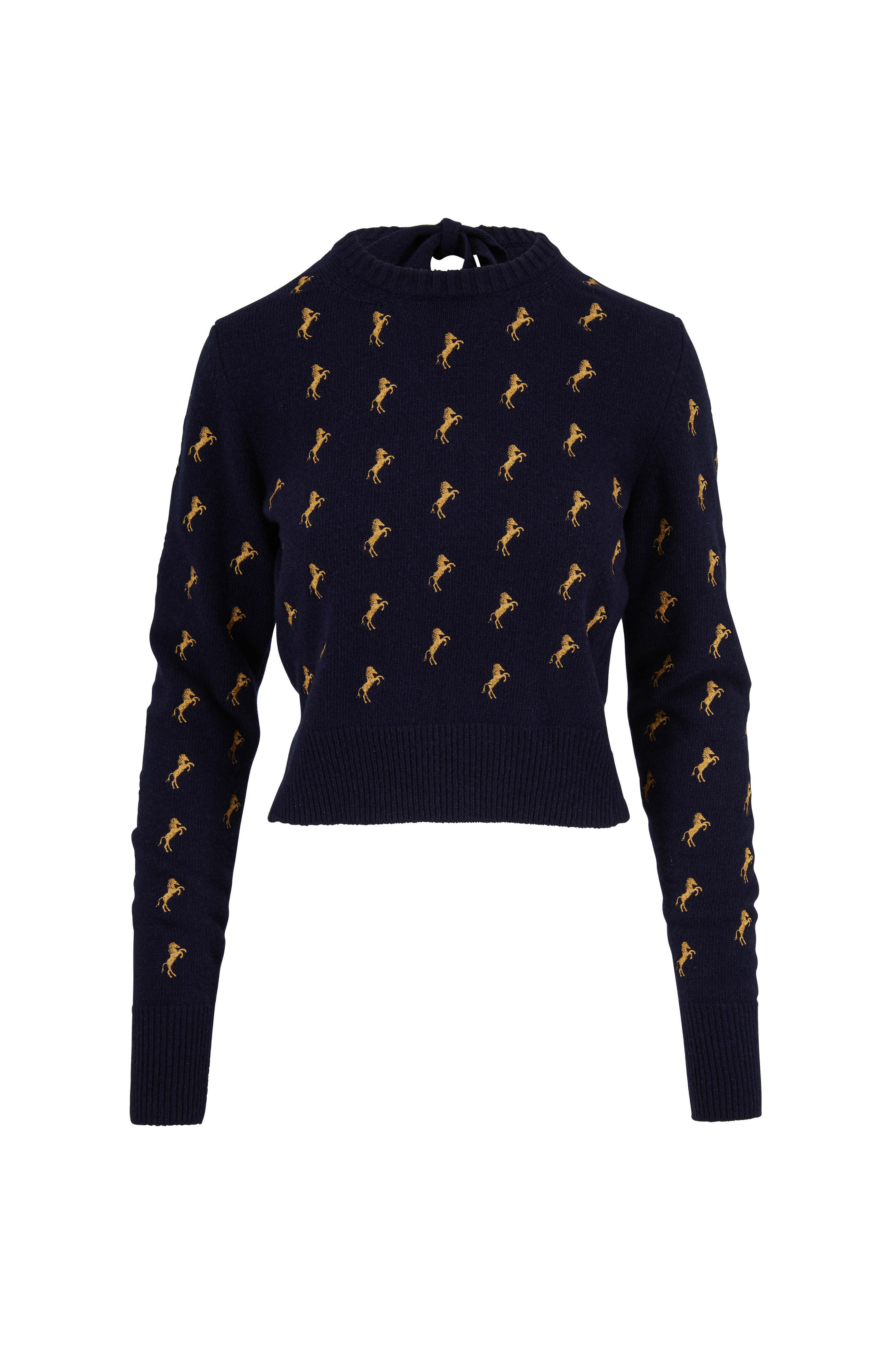 Crewneck; self-tie at back neck. Ribbed trim. Made in France. 99% wool, 1% other fibers. Dry clean.