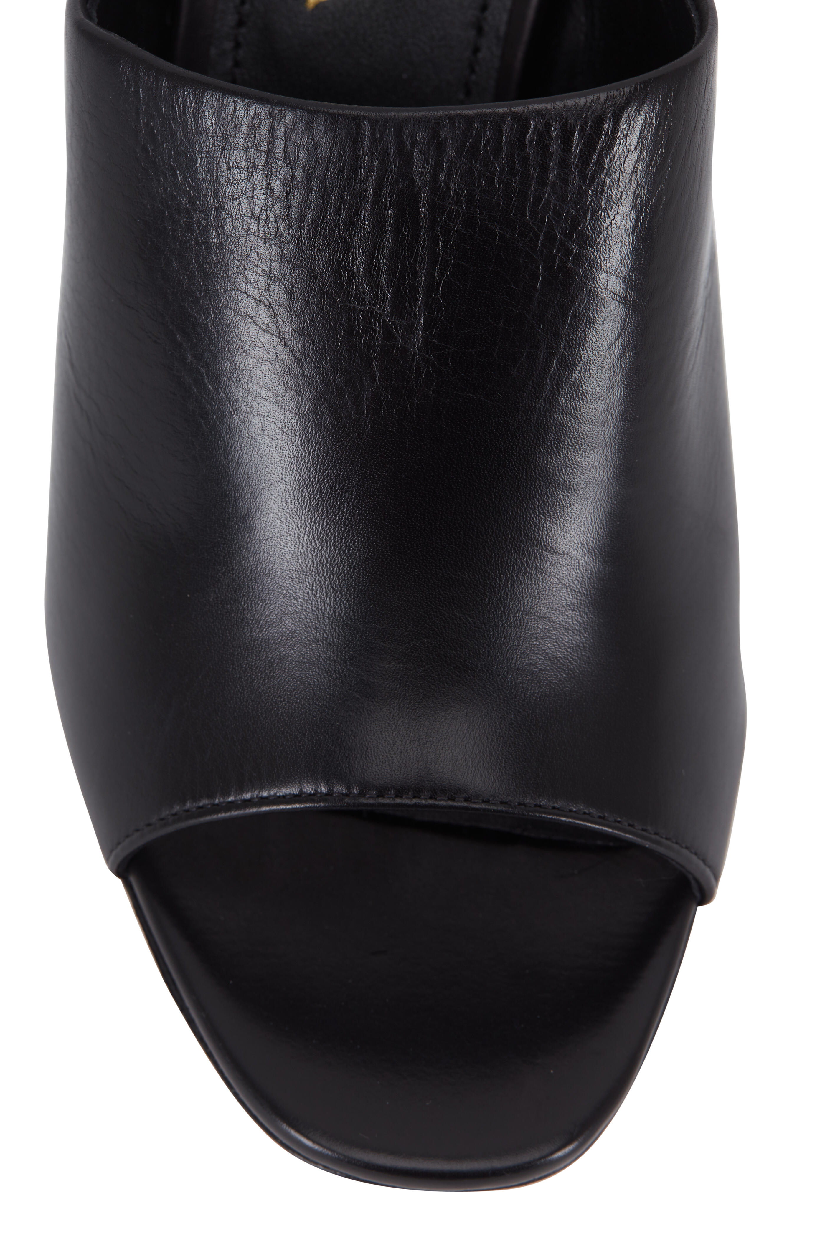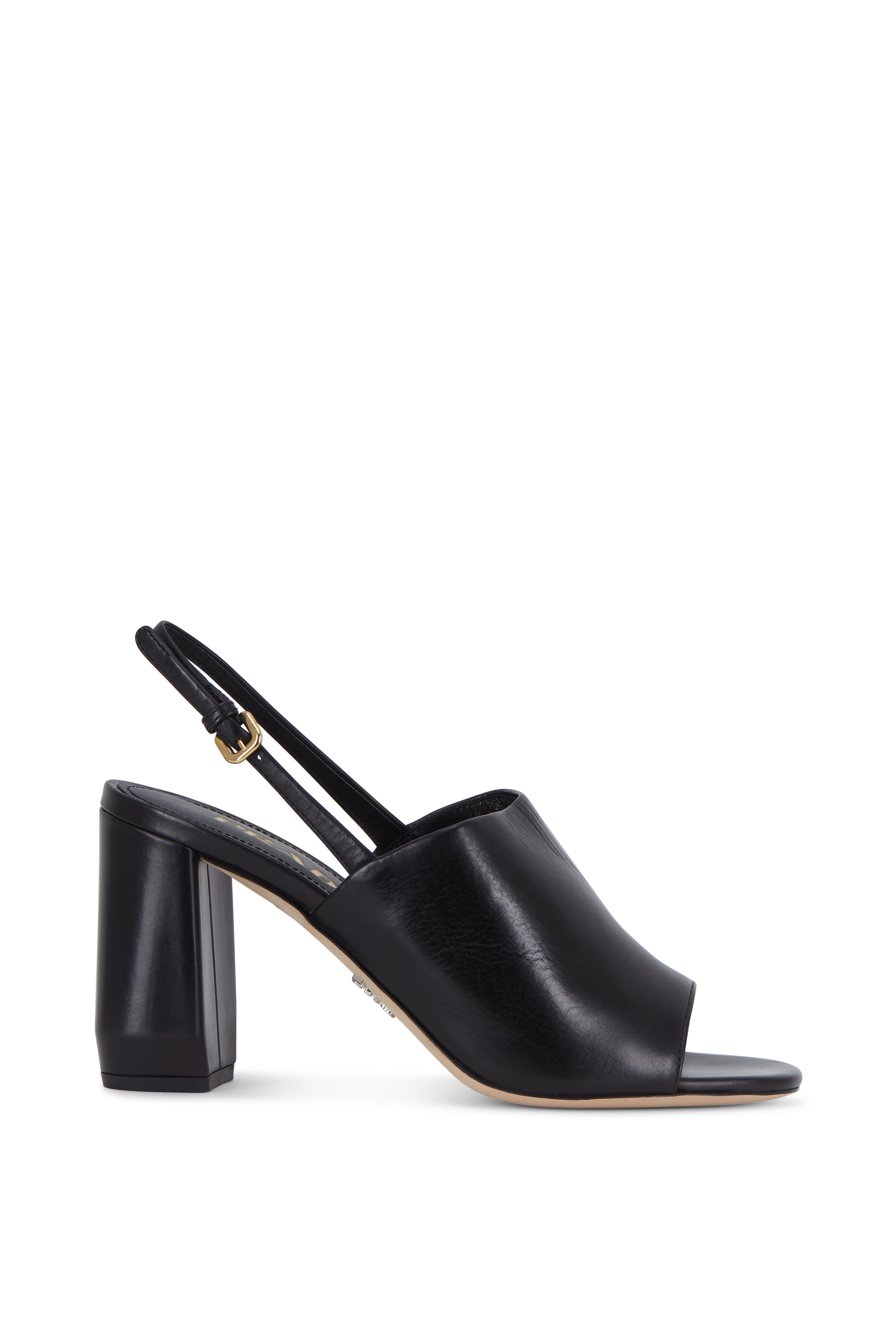 Calfskin suede upper. Square open-toe. Slingback, adjustable buckle. Leather lining and insole. Self covered block heel. Leather sole. Made in Italy. Heel measurement: 85mm (3.3").