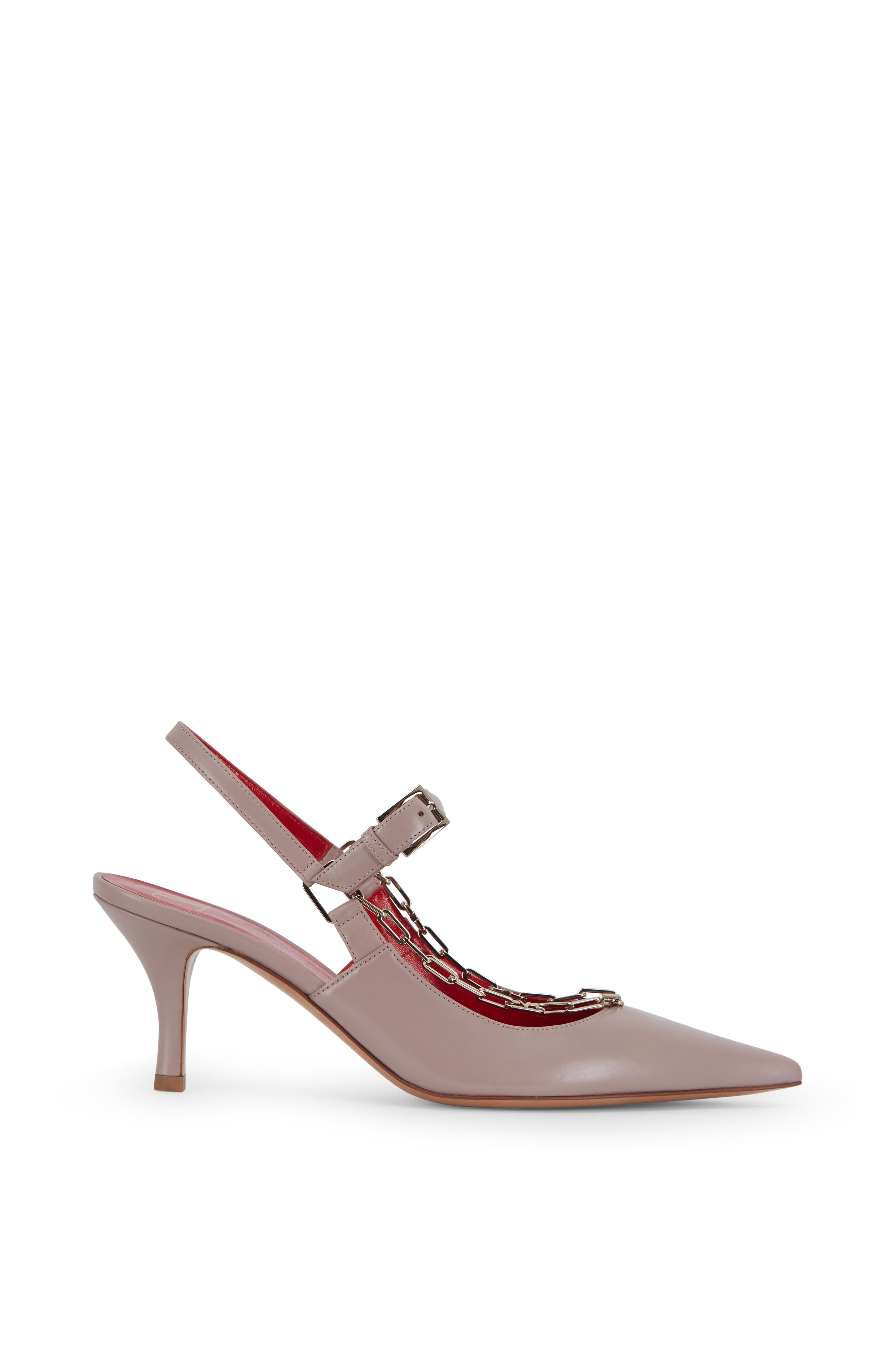 Calfskin leather upper. Pointed toe. Logo detail chain. Strap at vamp, adjustable buckle. Leather lining and insole. Self covered heel. Leather sole. Made in Italy. Heel measurement: 70mm (2 ¾").