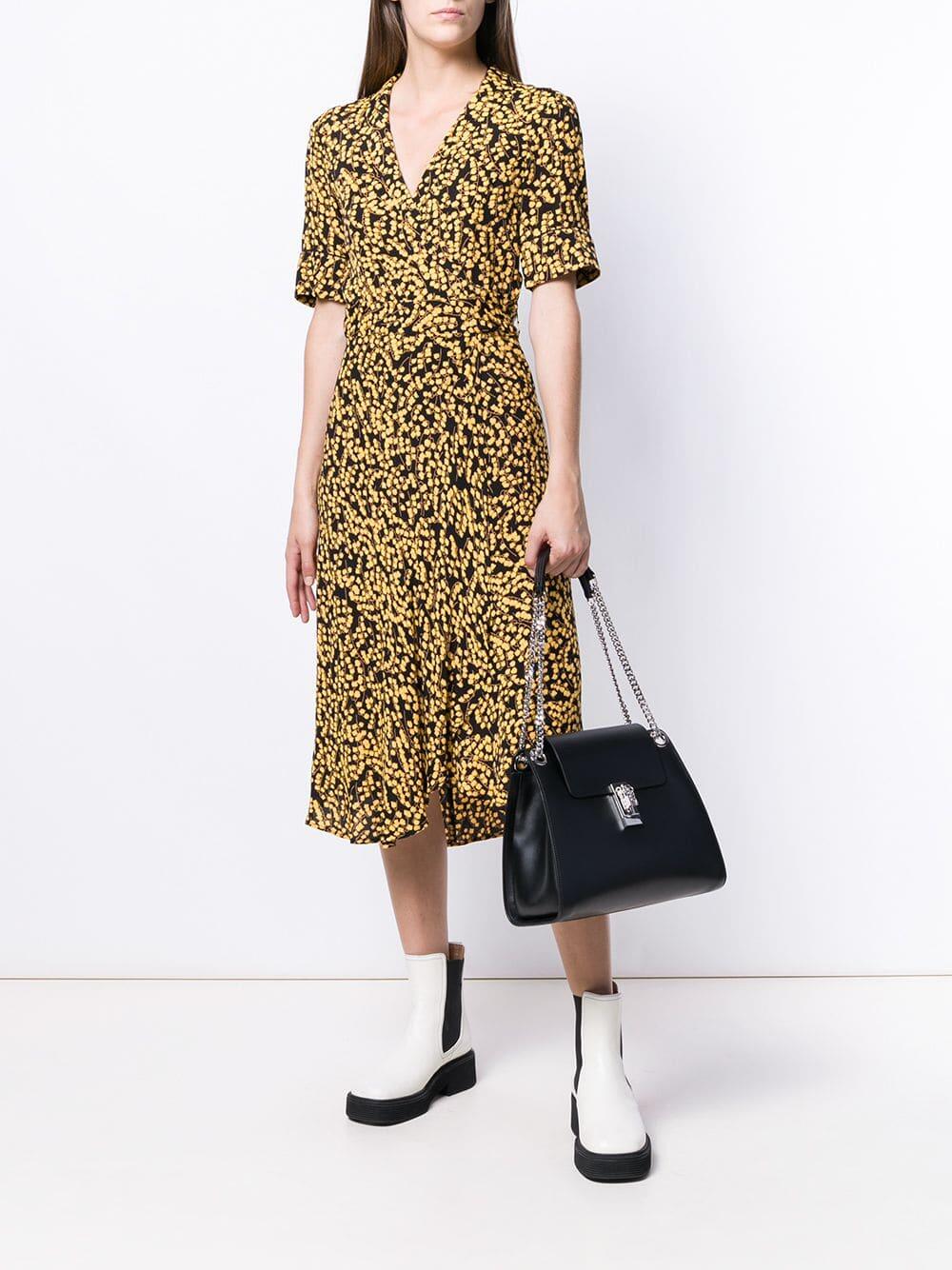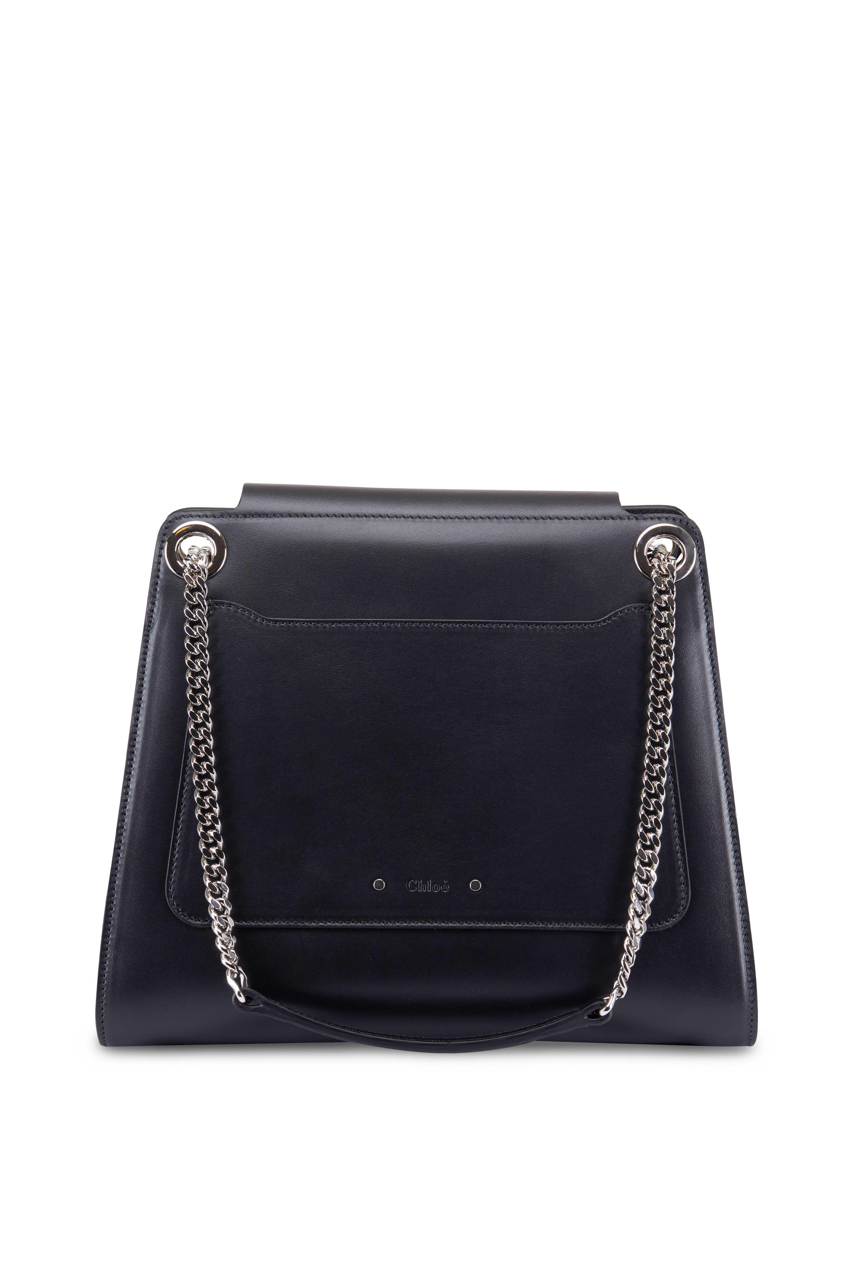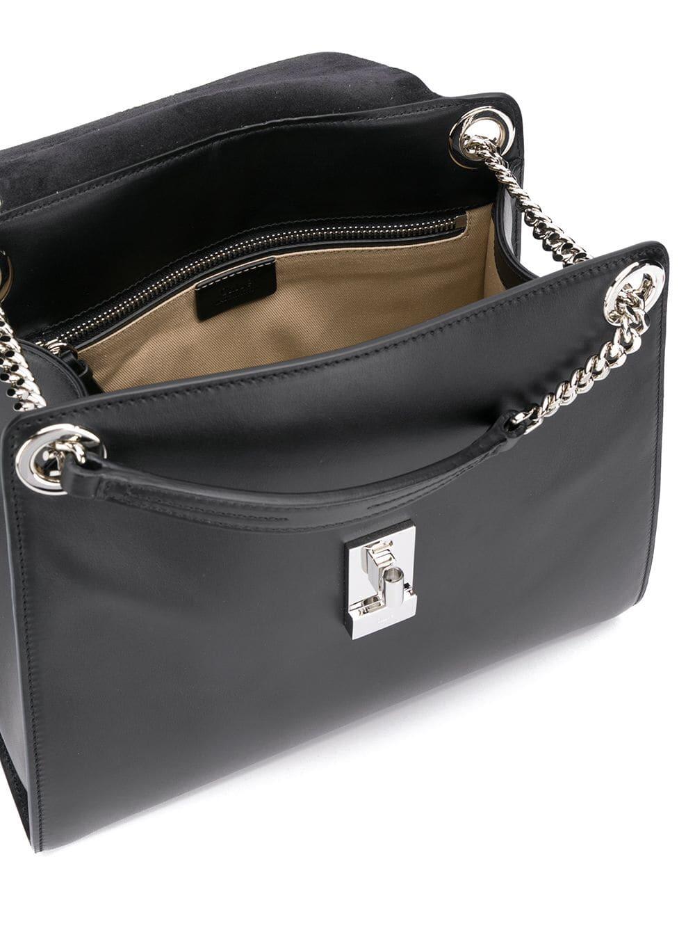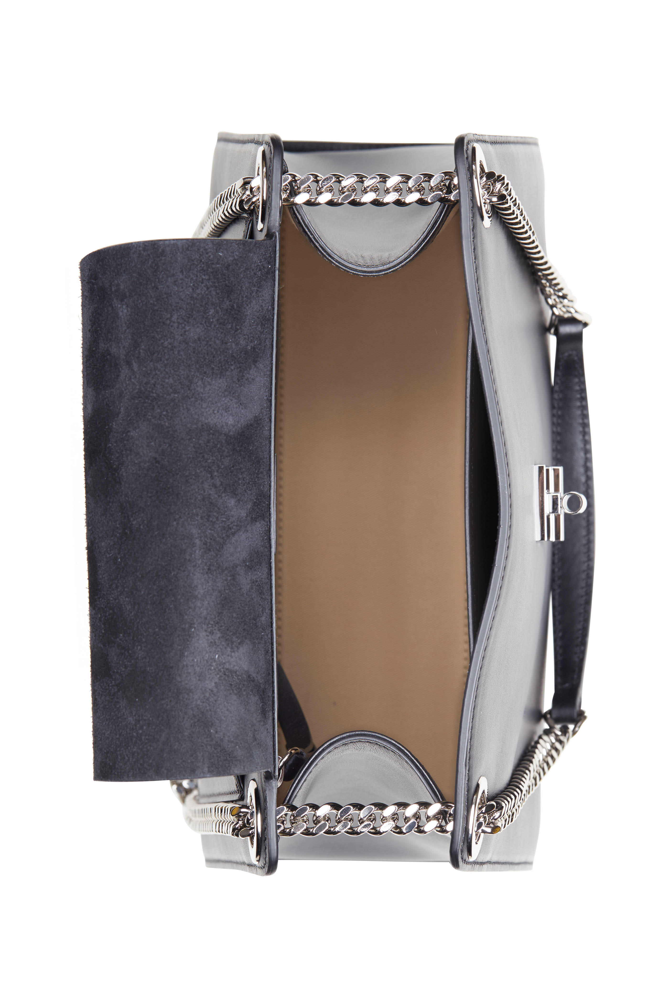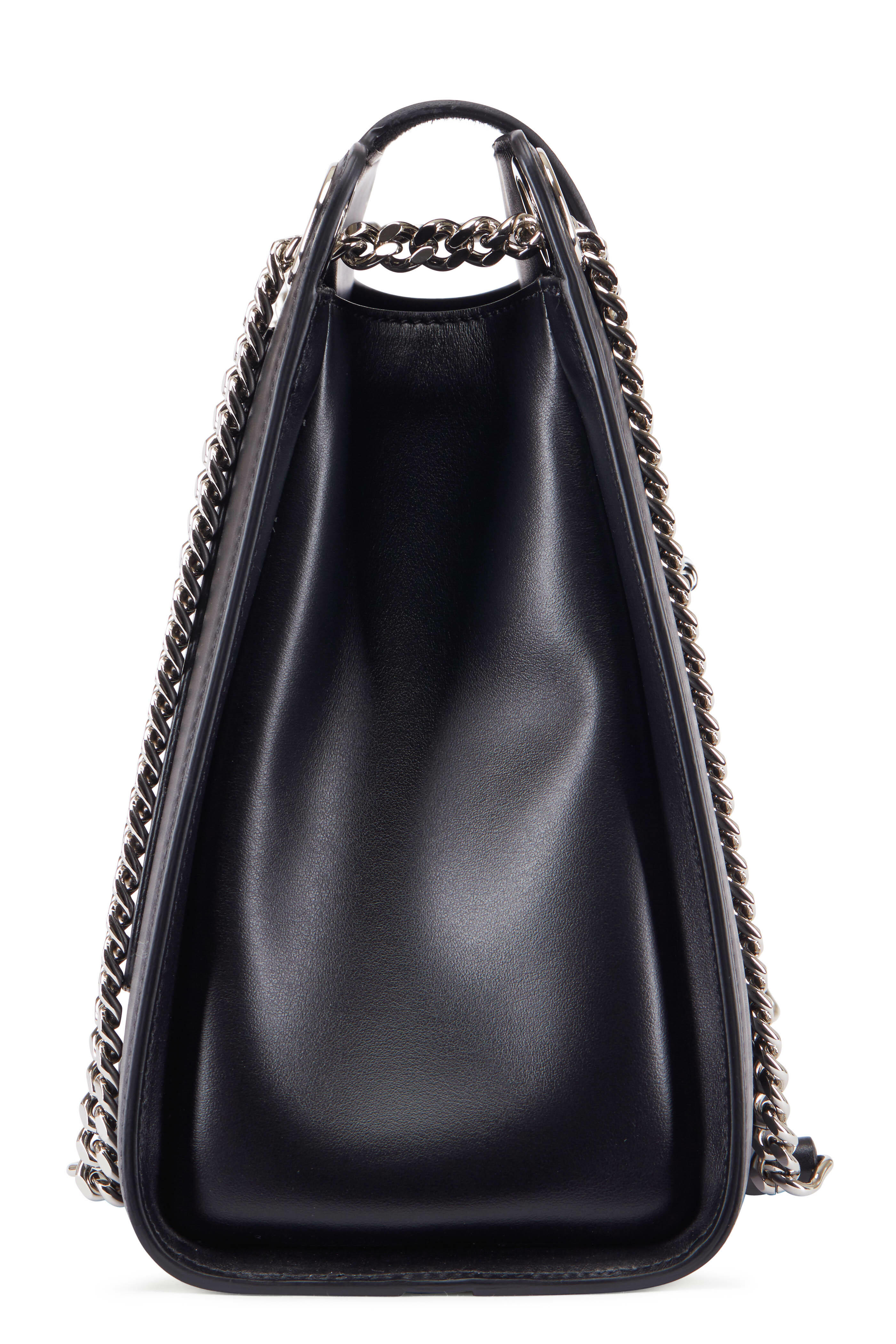 Glossy calfskin leather. Dual silver-tone chain strap. Detachable and adjustable crossbody strap. Flap front, turn-lock pin closure. Exterior back slip pocket. One interior slip pocket. Lined in canvas. Made in Italy. Width: 11 ½". Height: 10". Depth: 5". Chain strap drop: 10". Detachable and adjustable crossbody strap drop: 18".