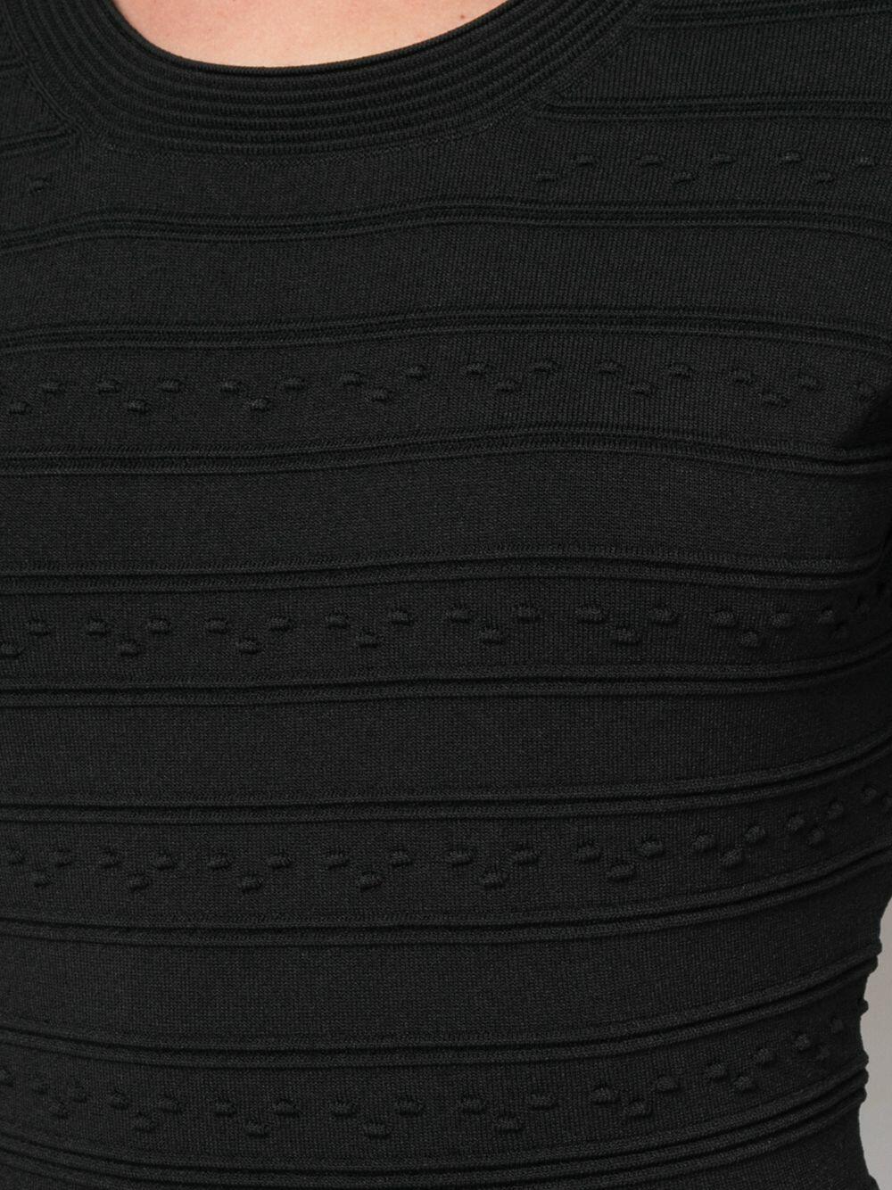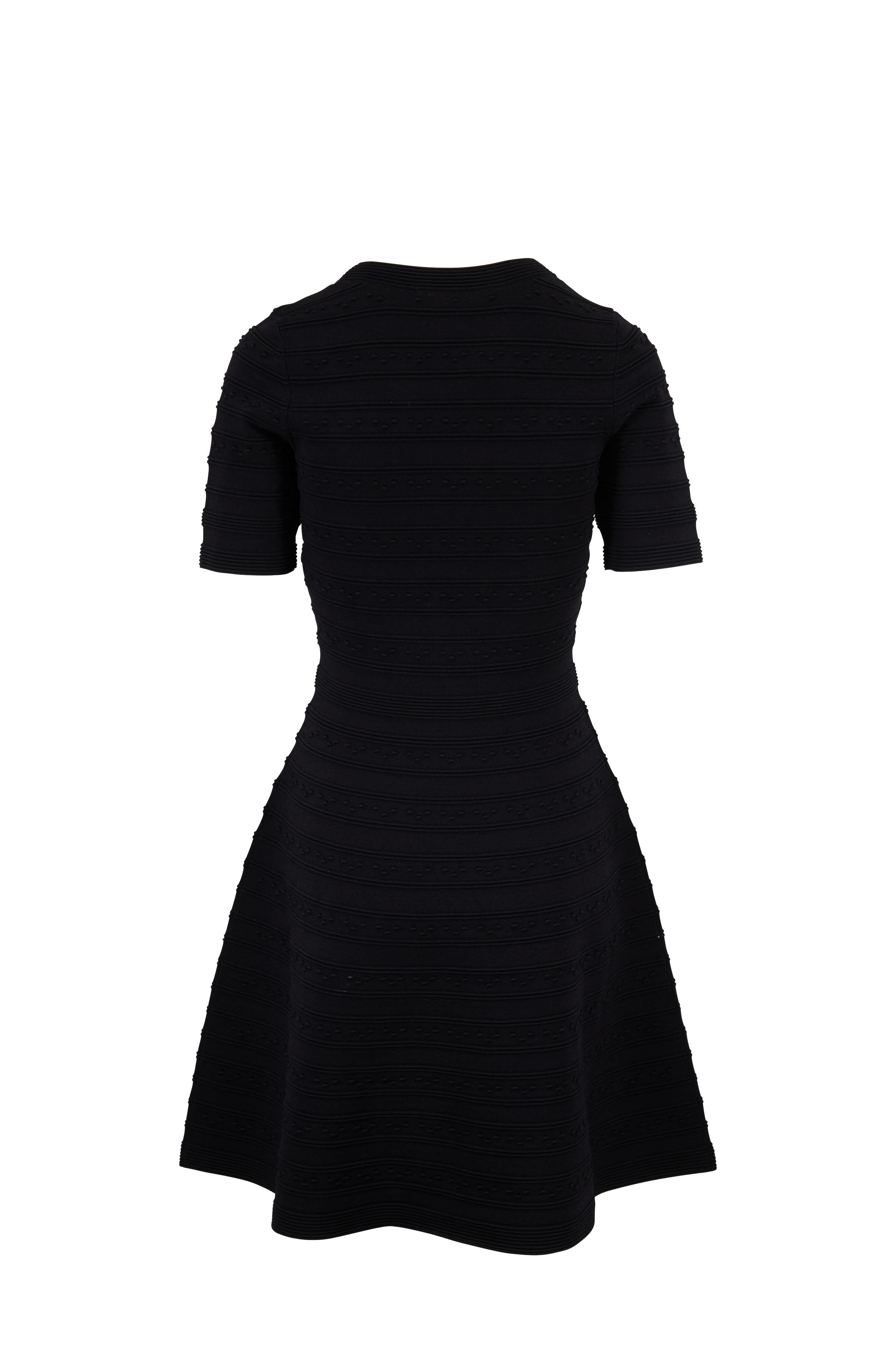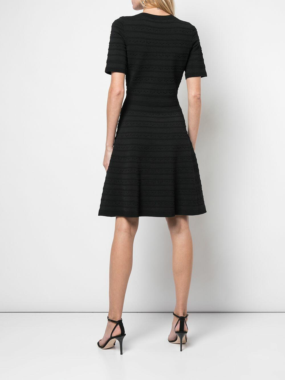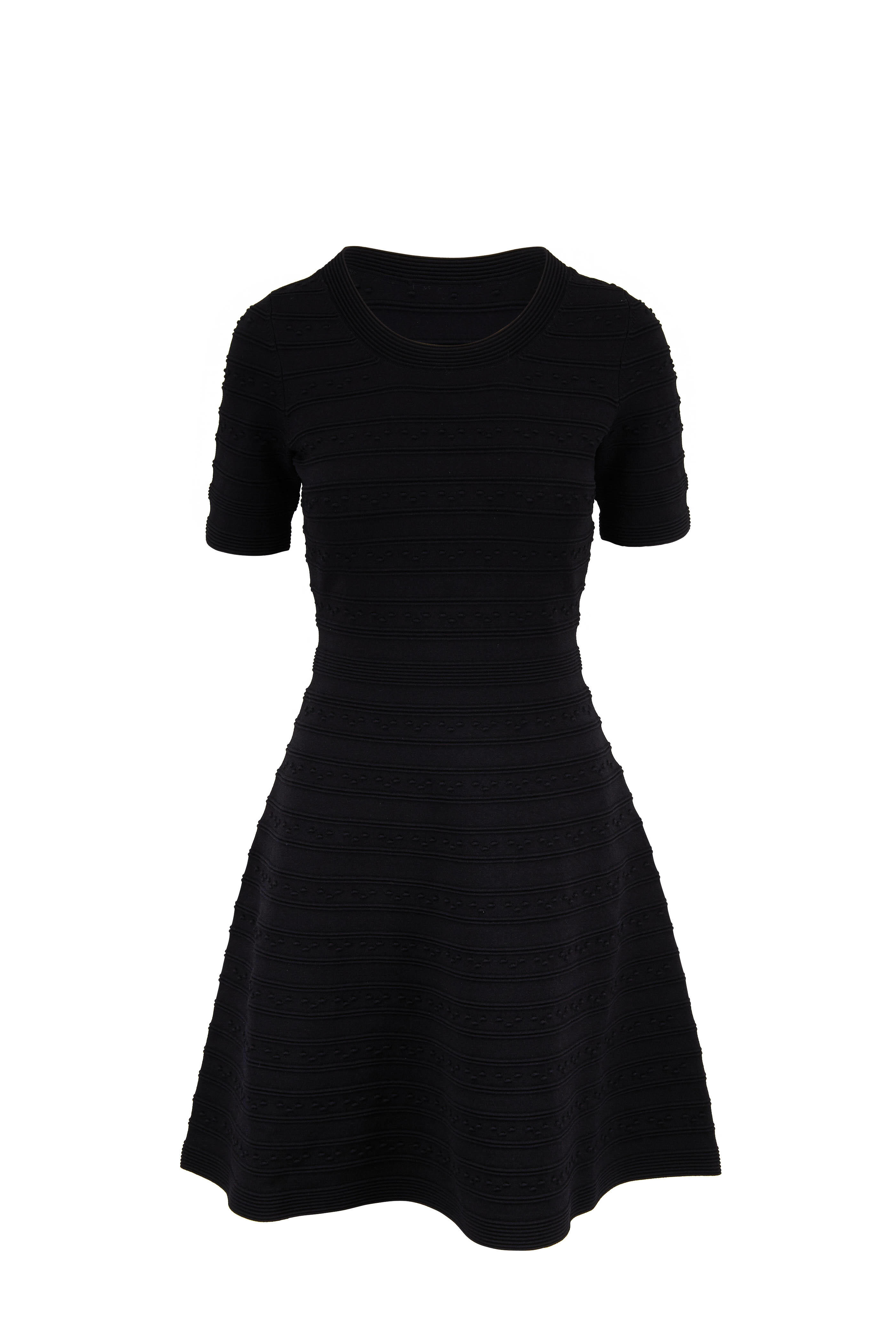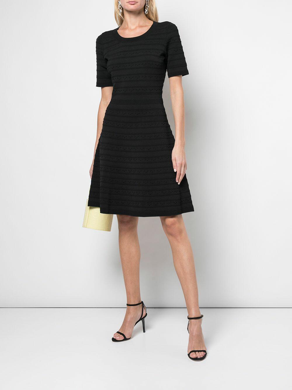 Round neckline. Slip over style. Flared hem. Imported. Fit and flare silhouette. 37" shoulder to hem. 54% viscose, 44% polyamide, 2% elastane. Dry clean.