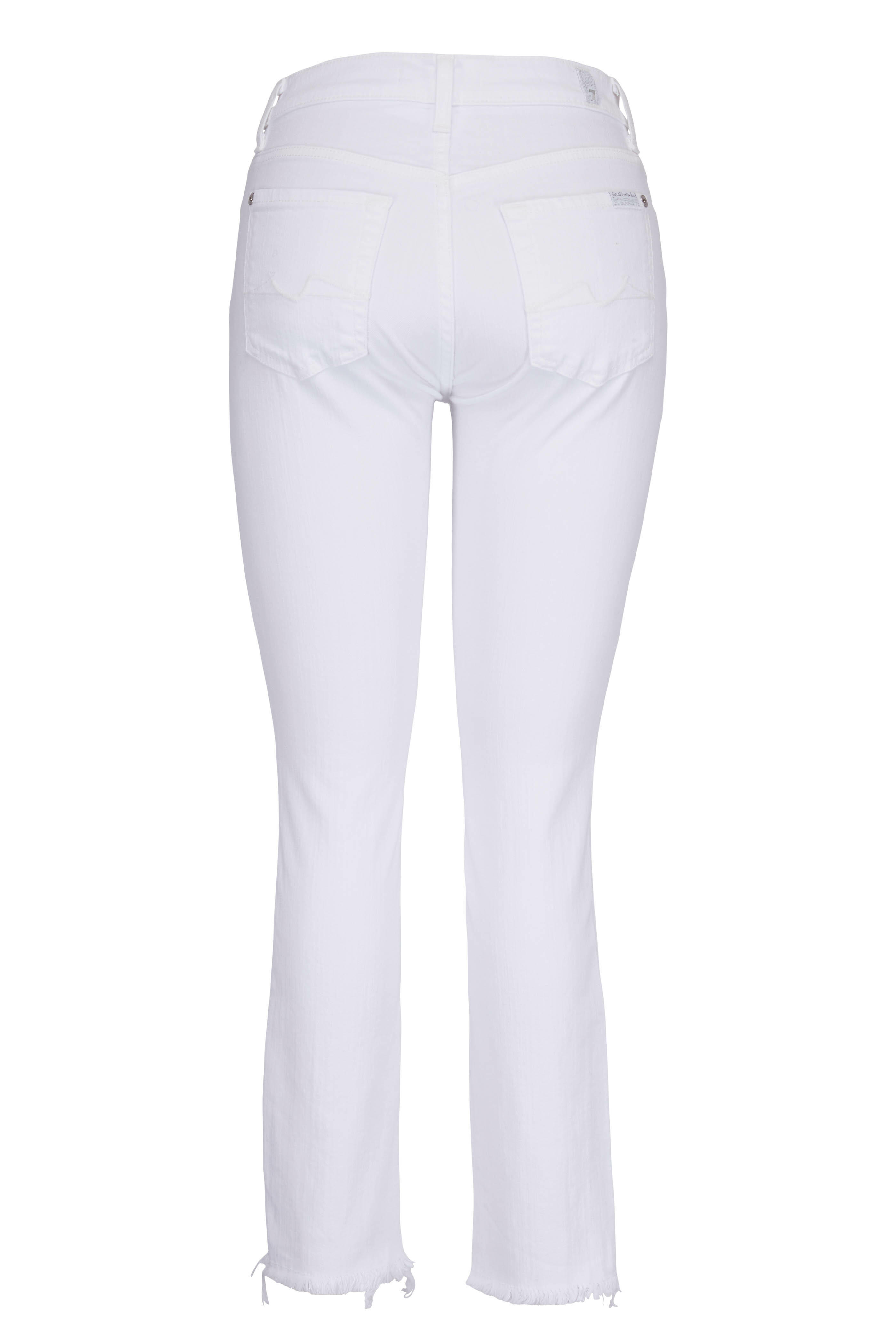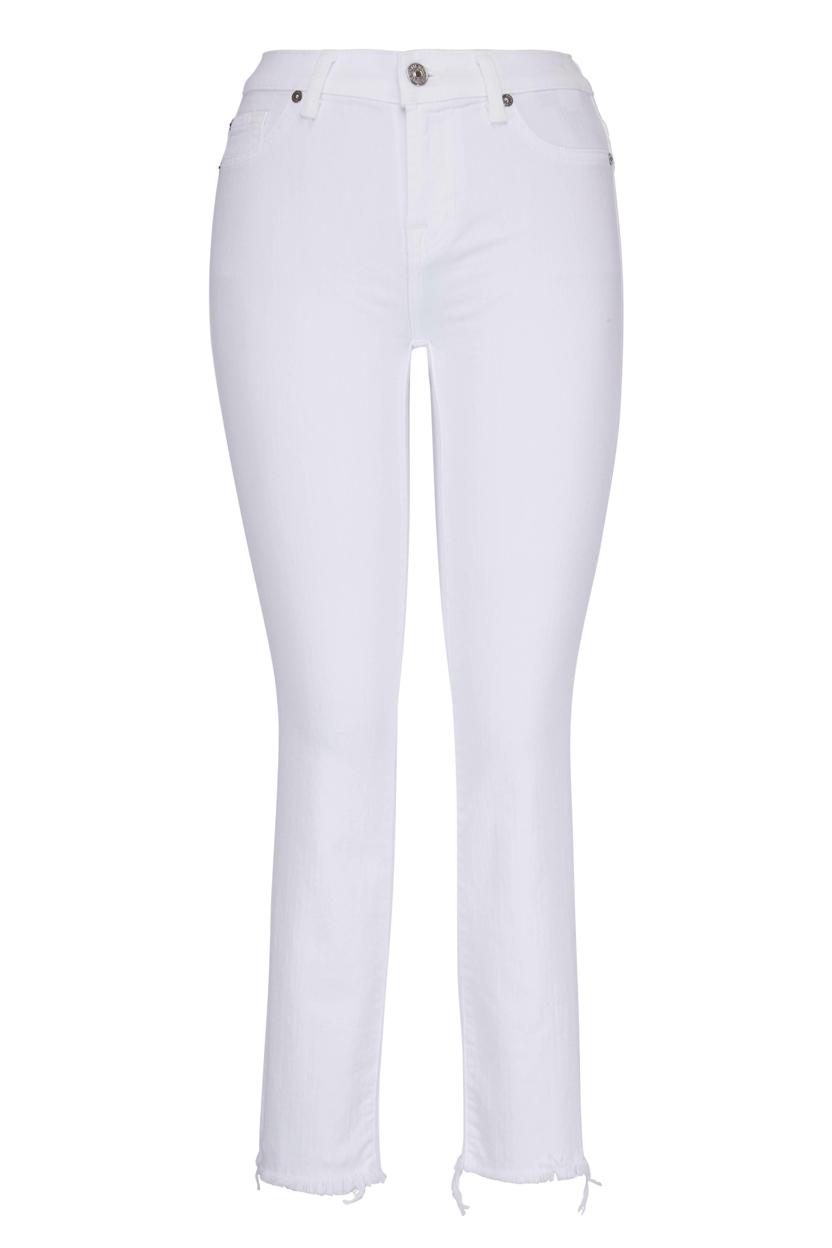 Five pocket styling. Frayed hem. Imported. Inseam: 26". Leg opening: 12". Rise: 11". 94% cotton, 5% polyester, 1% elastane. Machine wash.
