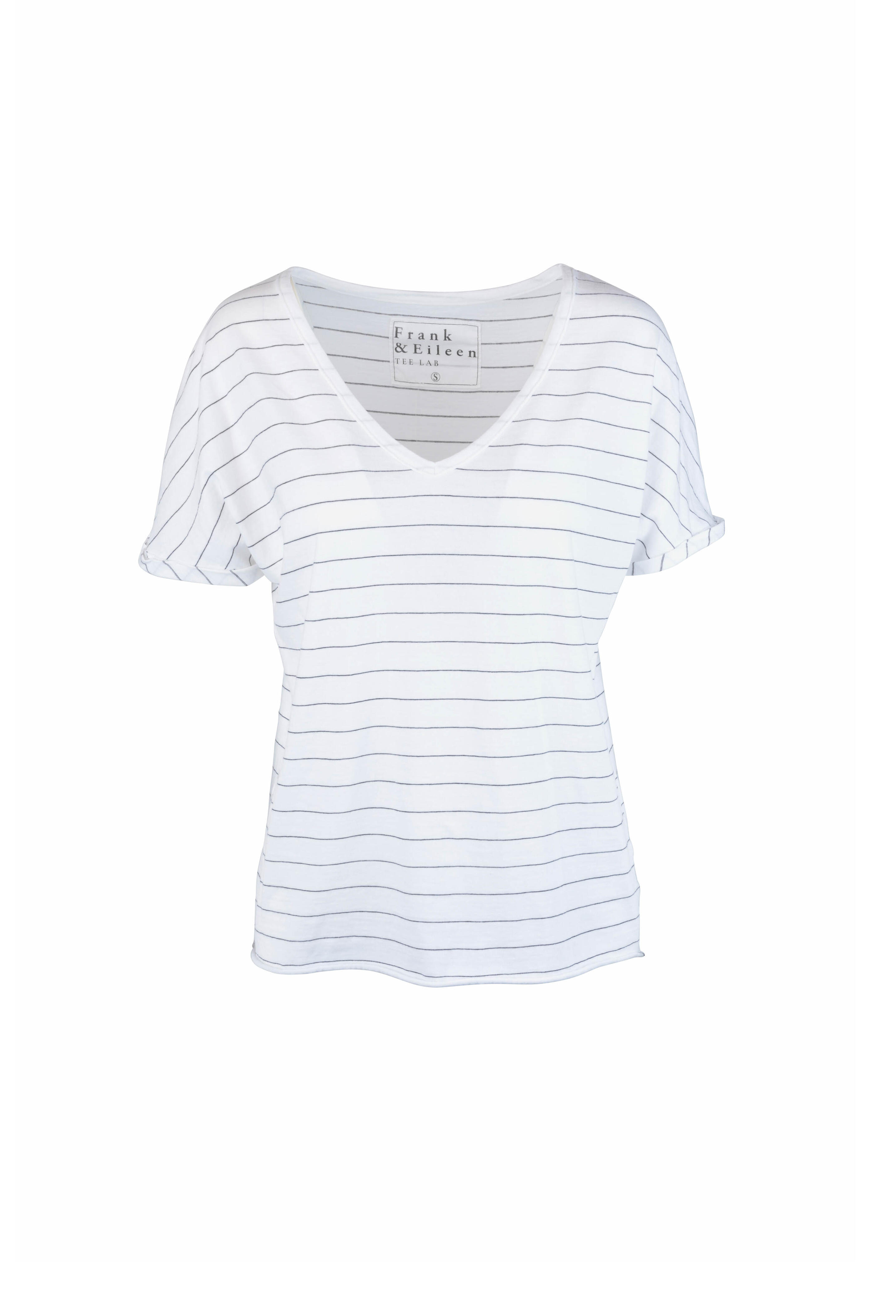 V-neckline. Dolman cuffed sleeves. Raw edge hem. Made in the USA. 100% cotton. Machine wash.