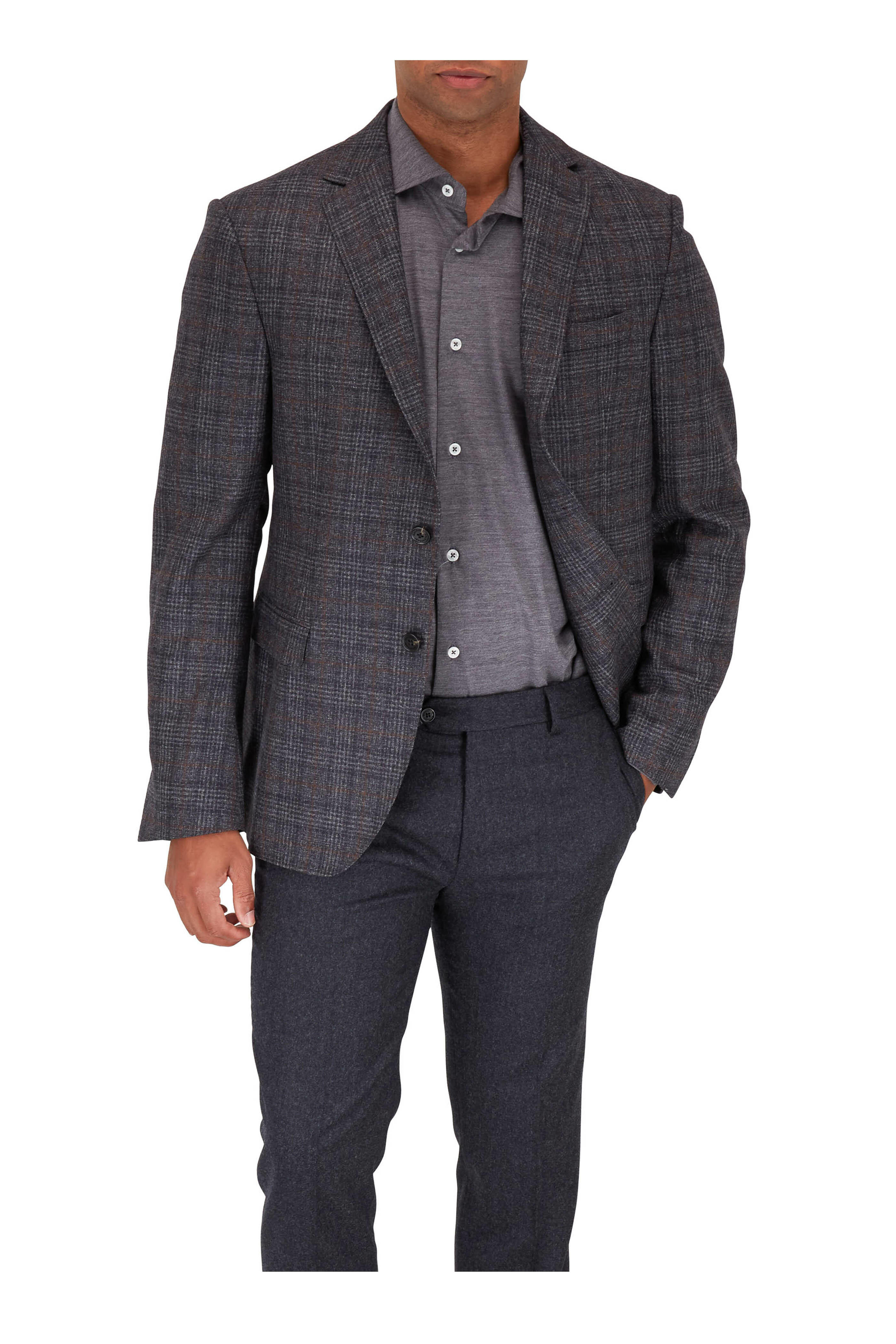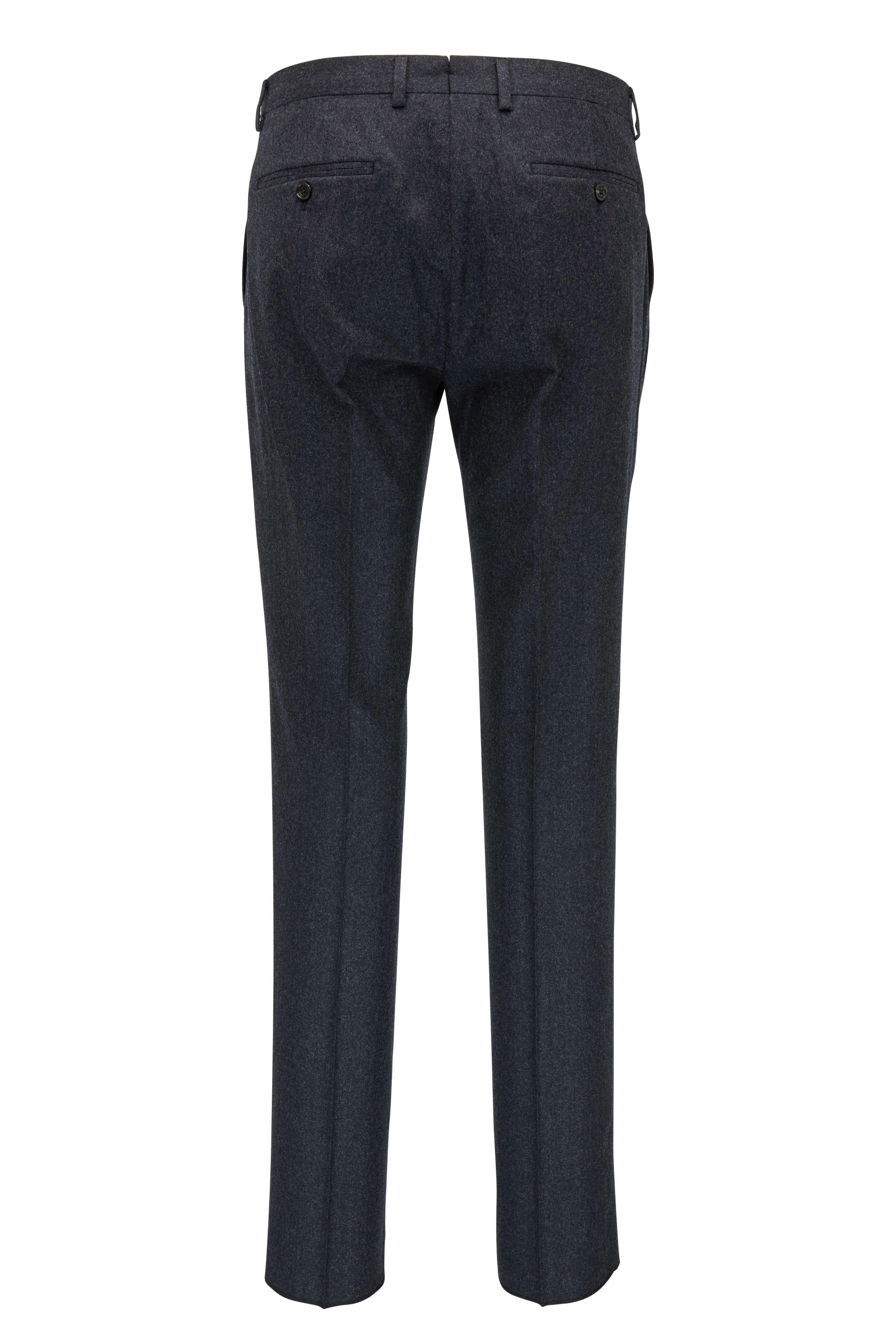 Banded waist; belt loops. Front slash pockets, back button welt pockets. Unfinished hem. Imported. 100% virgin wool. Dry clean.