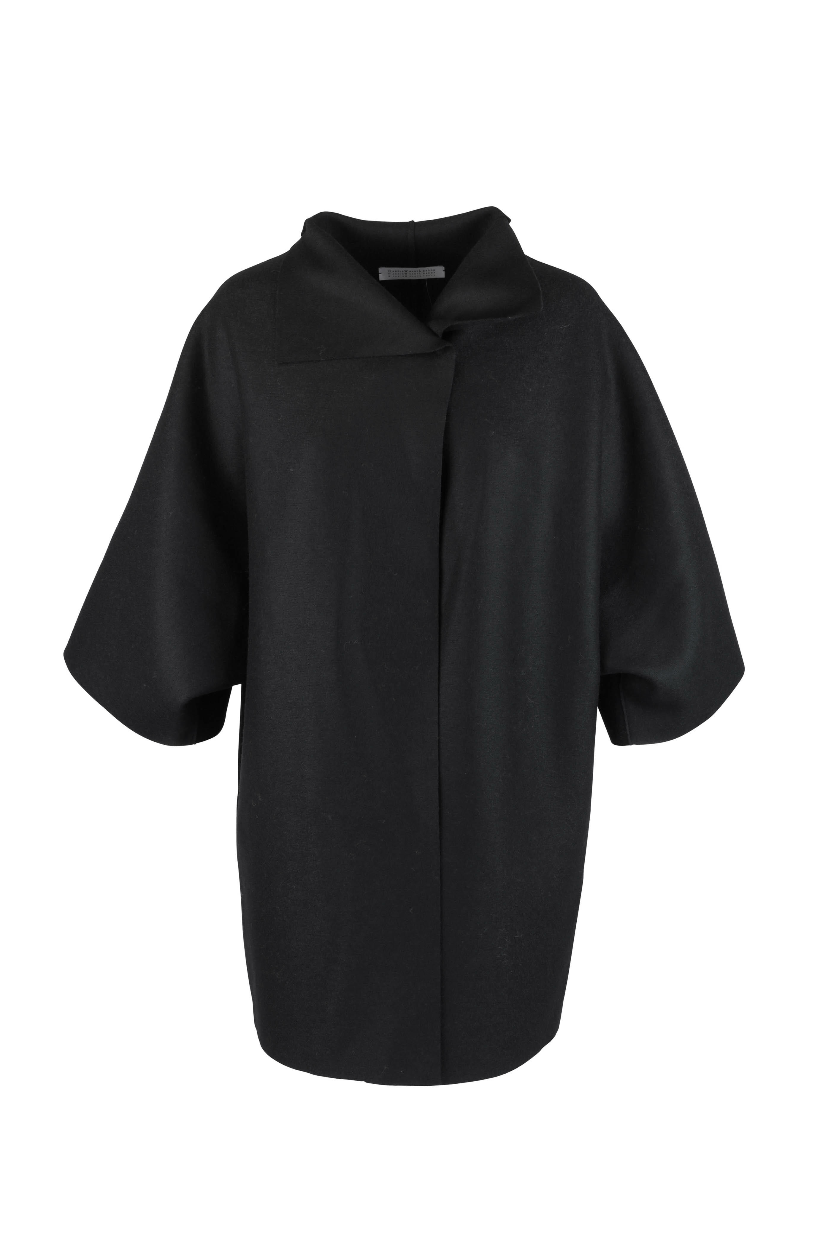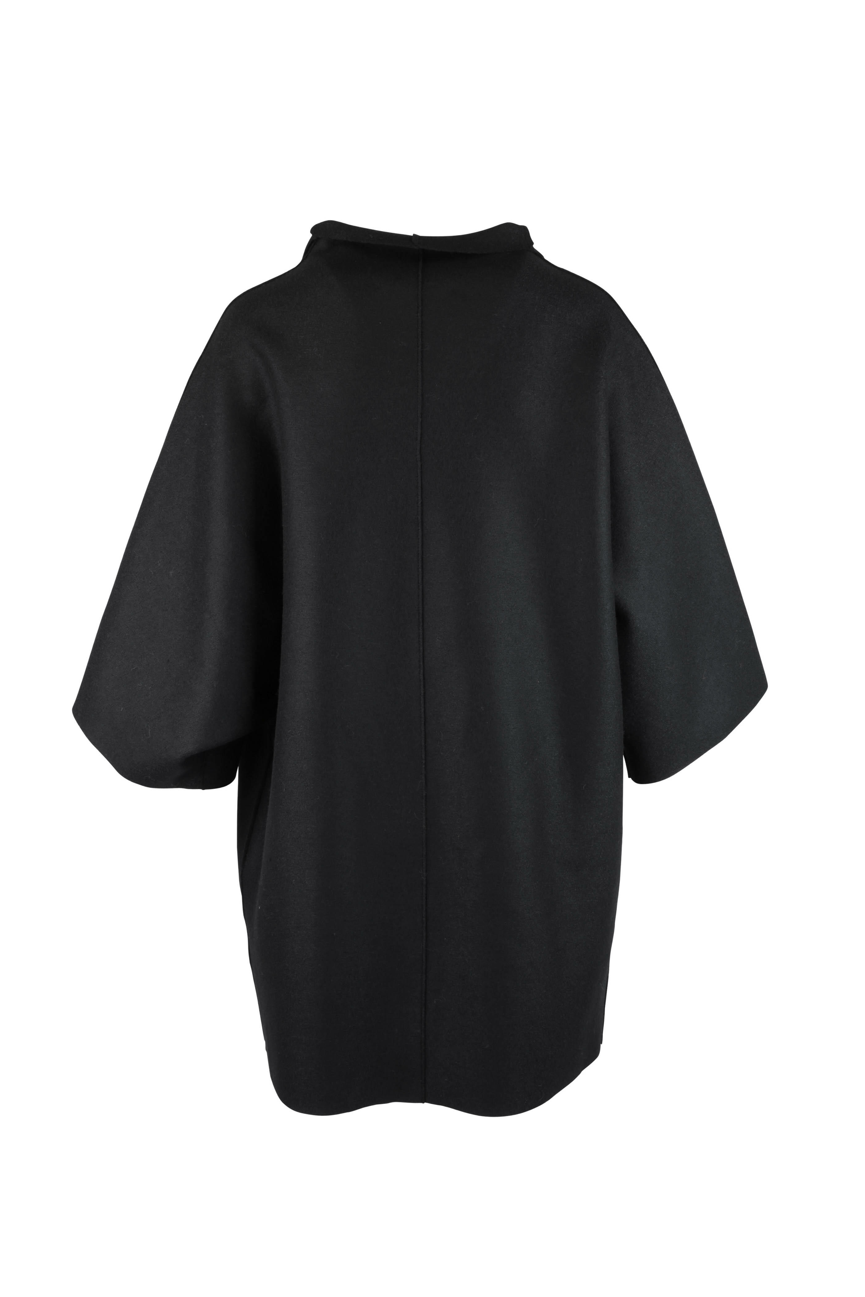 Fold down collar. Concealed single snap closure. Side slip pockets. Made in Italy. Shoulder to hem: 34". 100% wool. Dry clean.