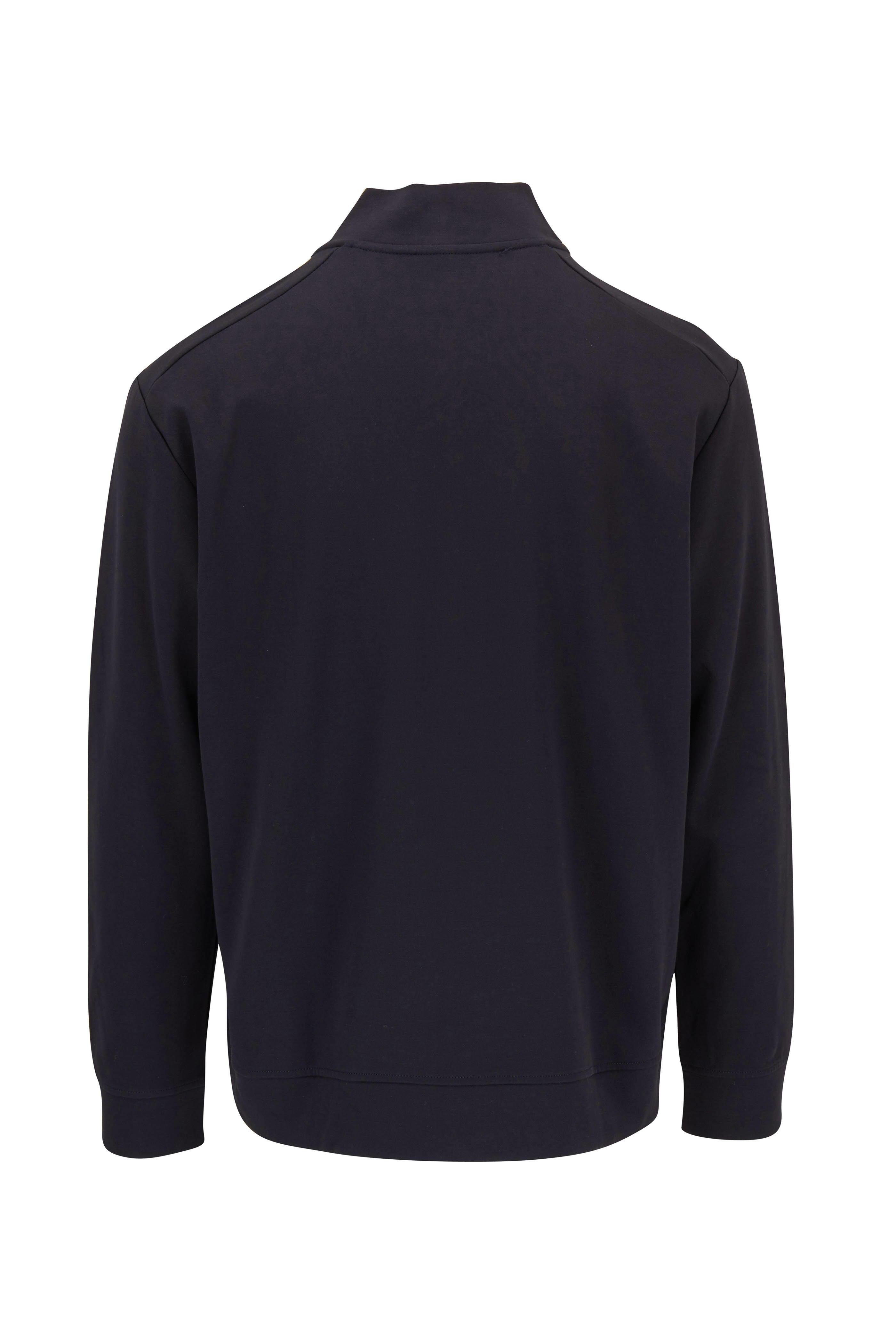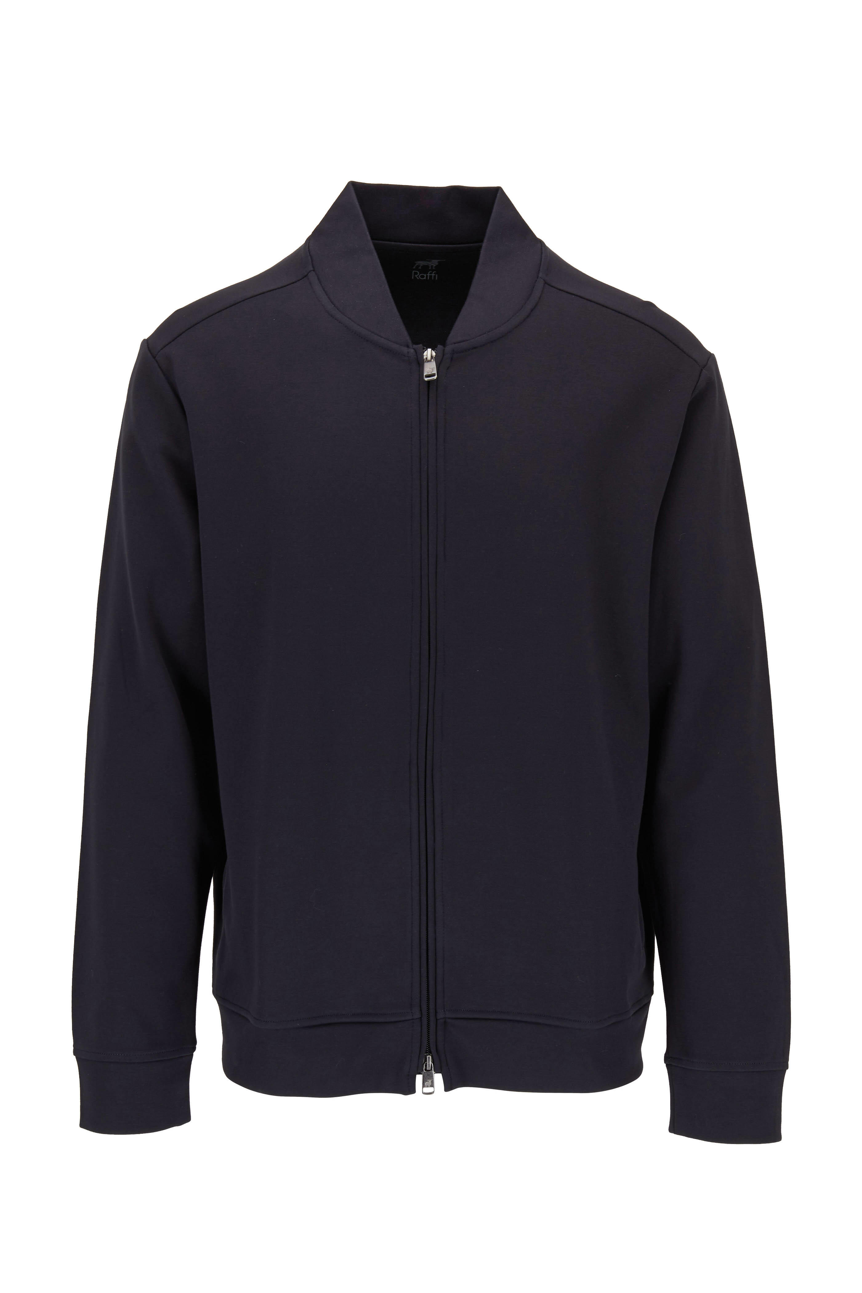 Baseball collar. Two-way zip. Lower vertical zip pockets. Banded hem and cuffs. Imported. 77% cotton, 23% polyester. Dry clean.