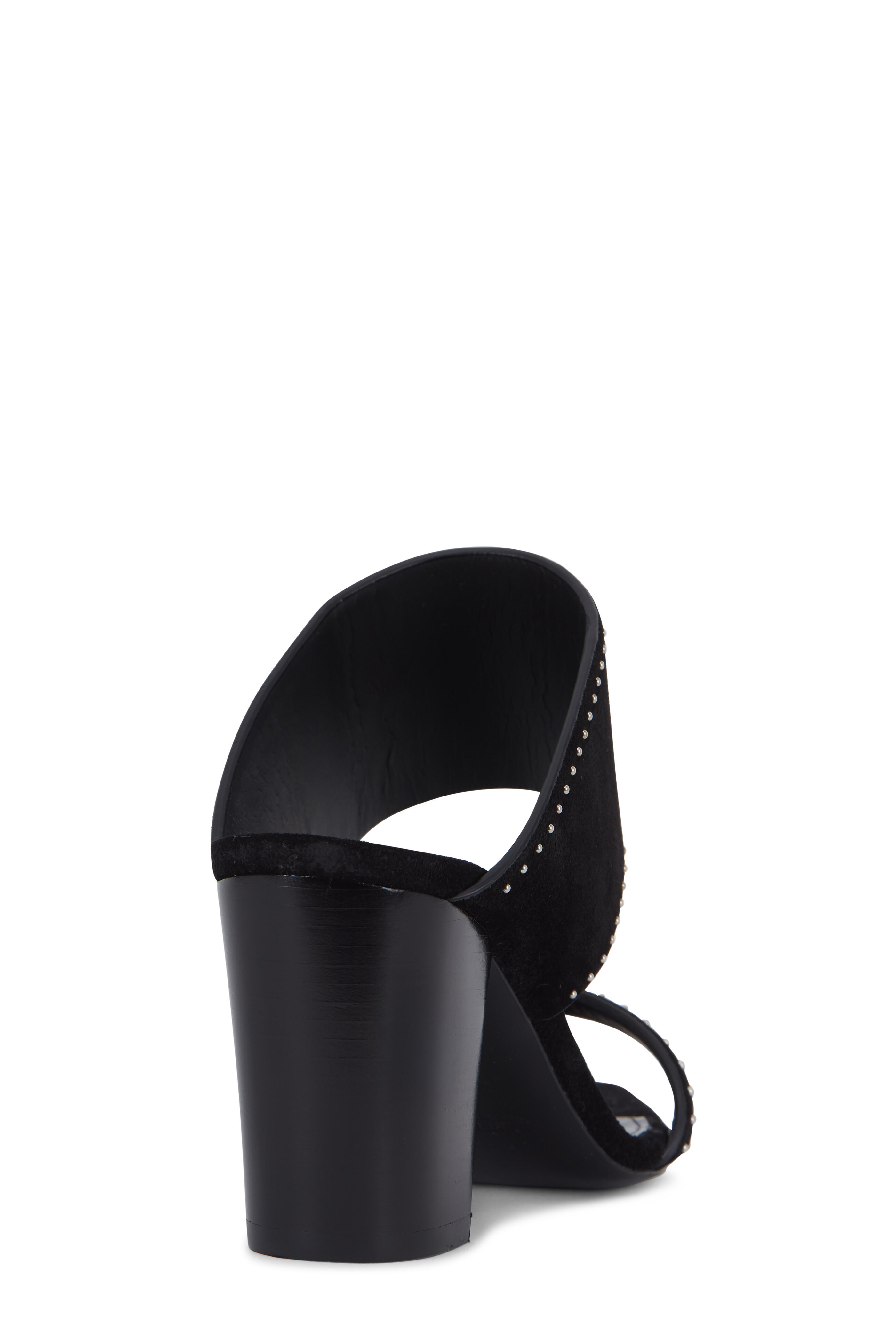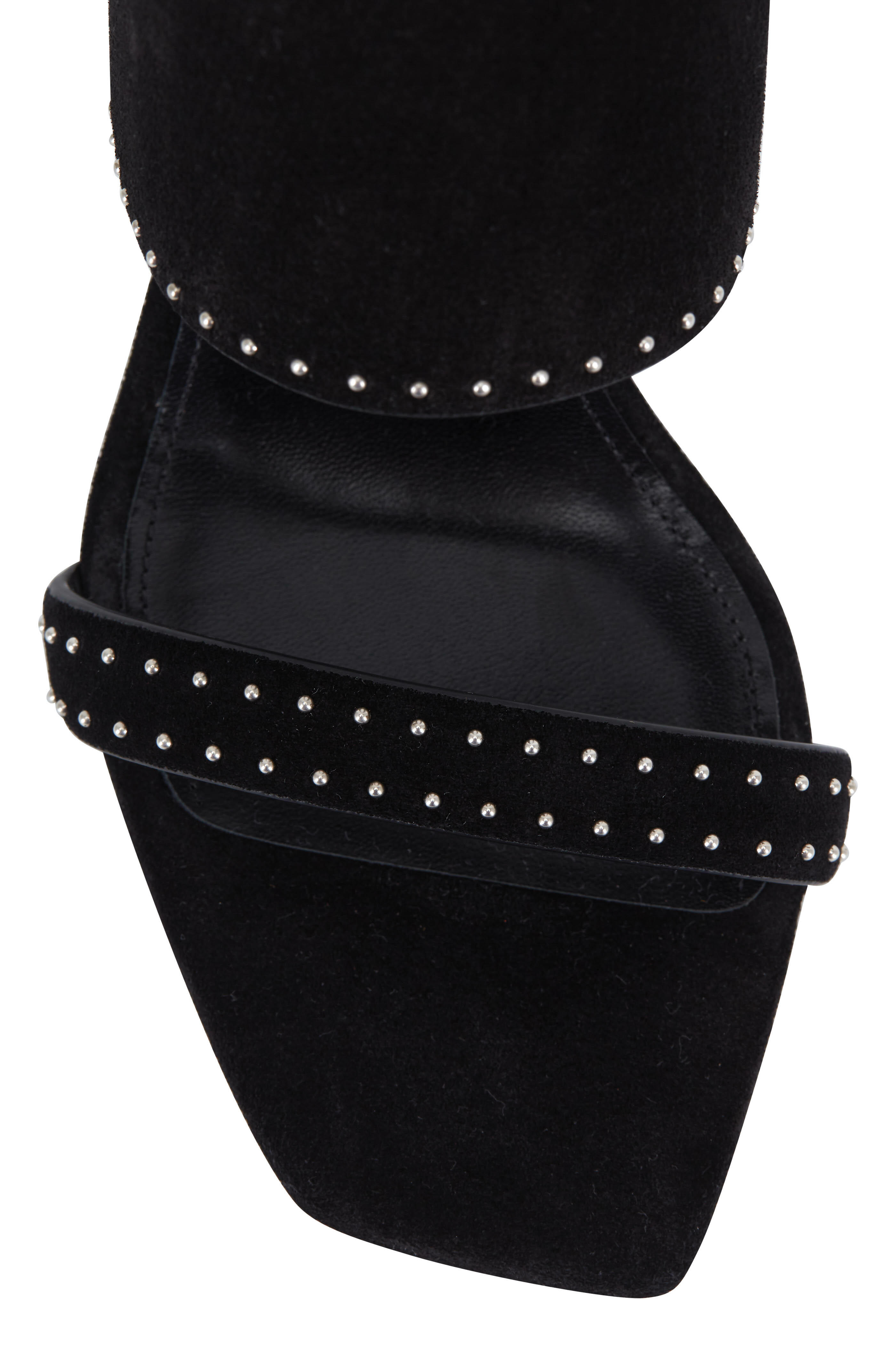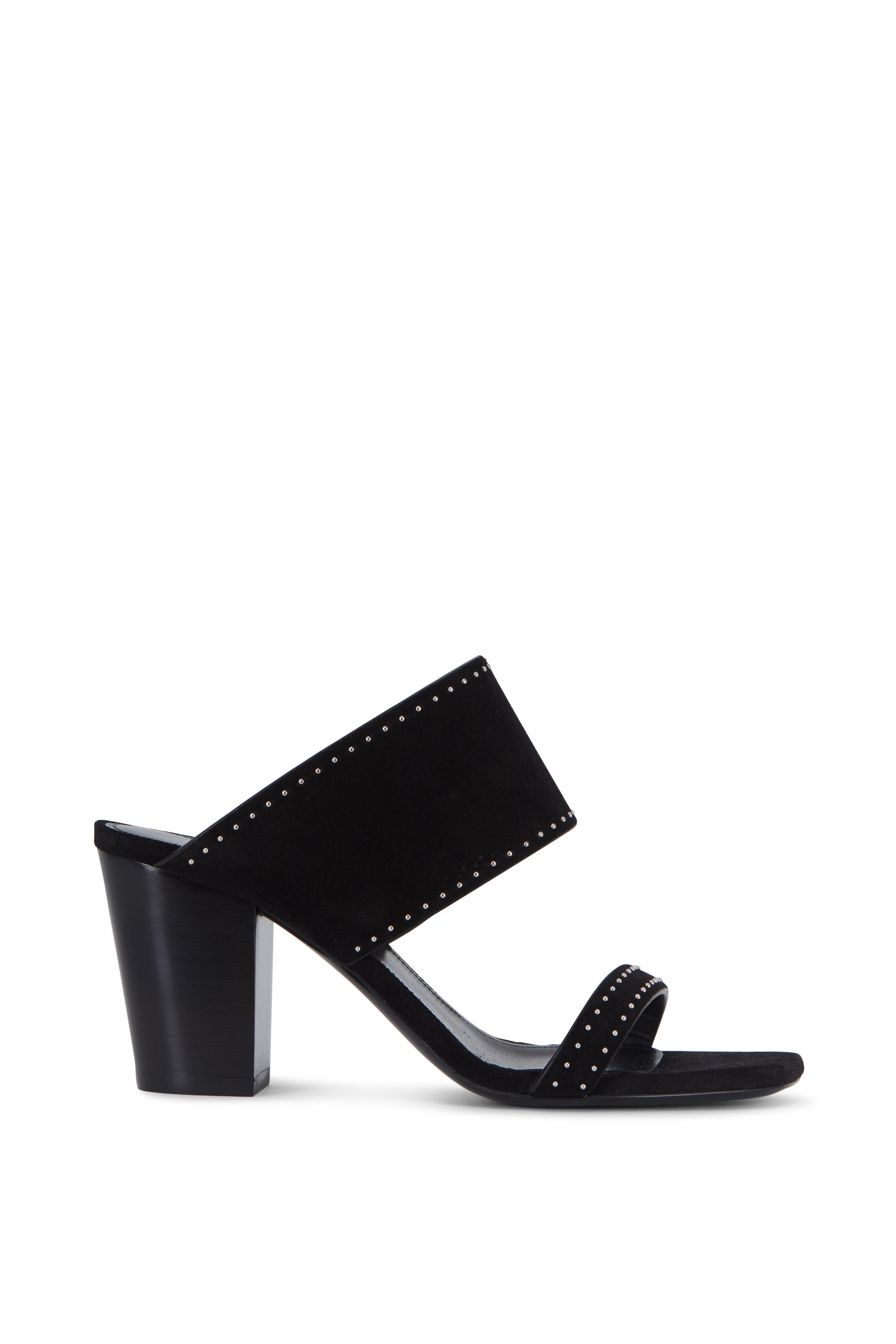 Calfskin suede upper. Square toe. Silver micro studded double bands. Leather lining and insole. Chunky block heel. Leather sole. Made in Italy. Heel measurement: 75mm (3").
