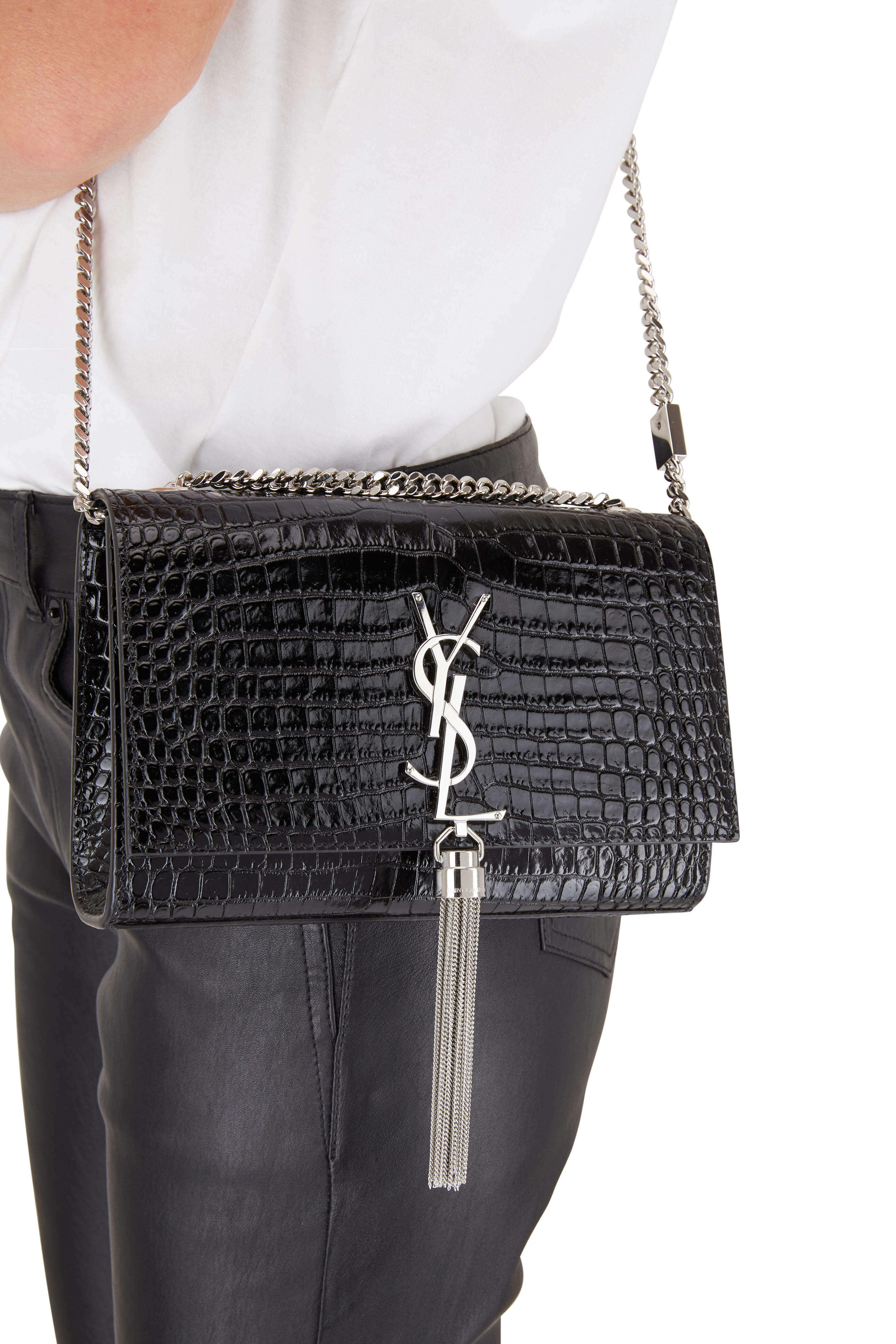 Crocodile embossed calfskin leather. Silver-toned detachable chain strap. Flap front with snap closure. Silver-toned YSL logo and chain tassel detail. One interior slip pocket. Lined in canvas. Made in Italy. Width: 8". Height: 5". Depth: 2". Strap drop: 22".