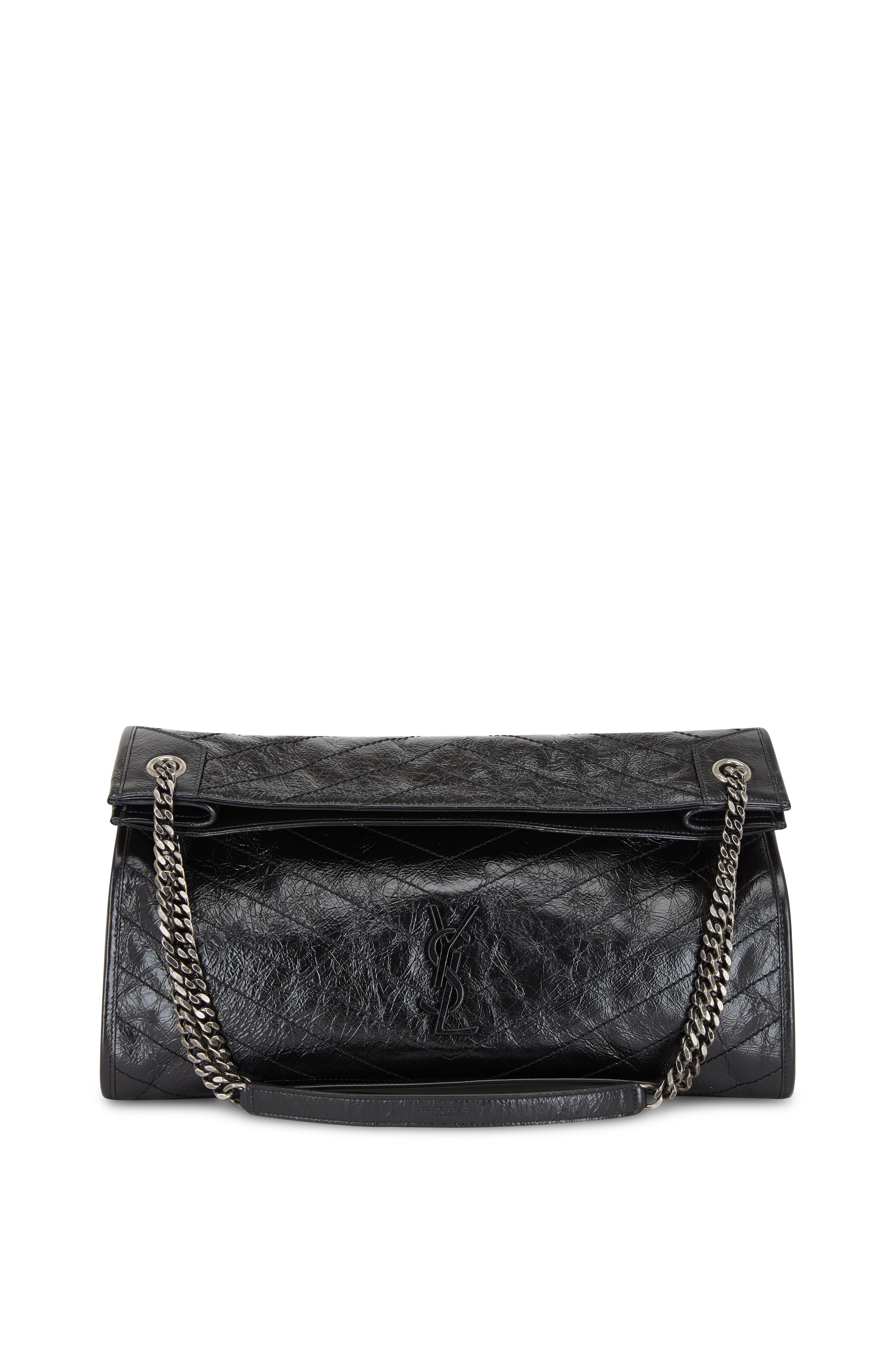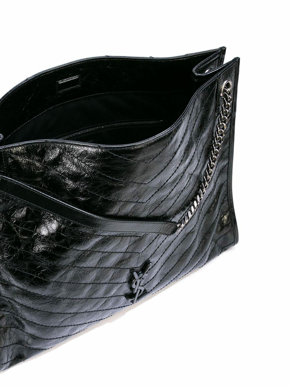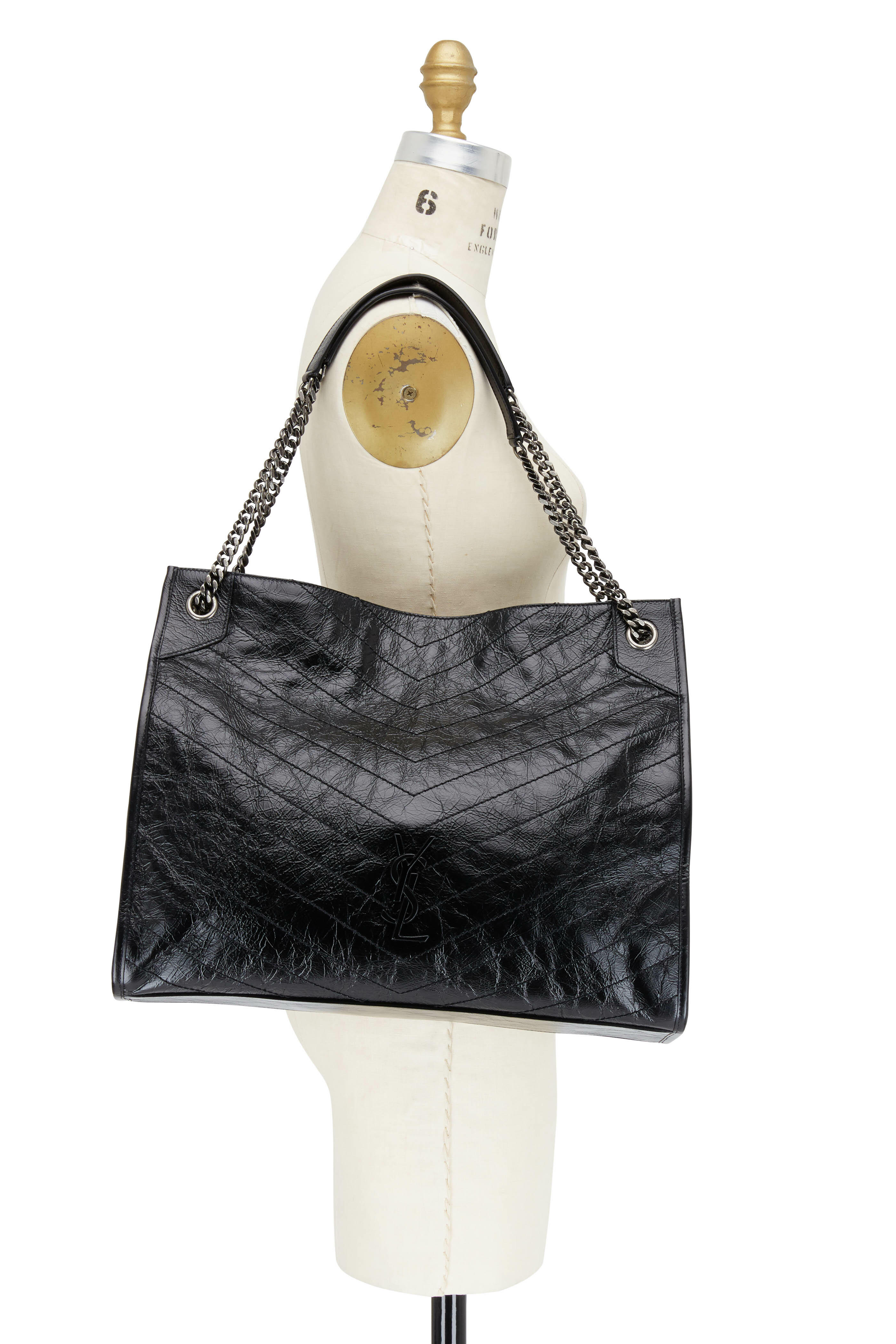 Quilted calfskin leather. Gunmetal chain with leather inset straps. Center concealed magnetic snap closure. Tonal lacquer logo detail. One interior zip pocket, one open pocket. Lined in canvas. Made in Italy. Width: 15". Height: 13". Depth: 5". Strap drop: 10".
