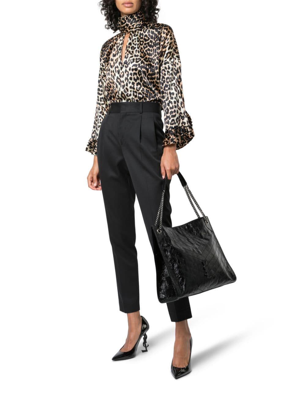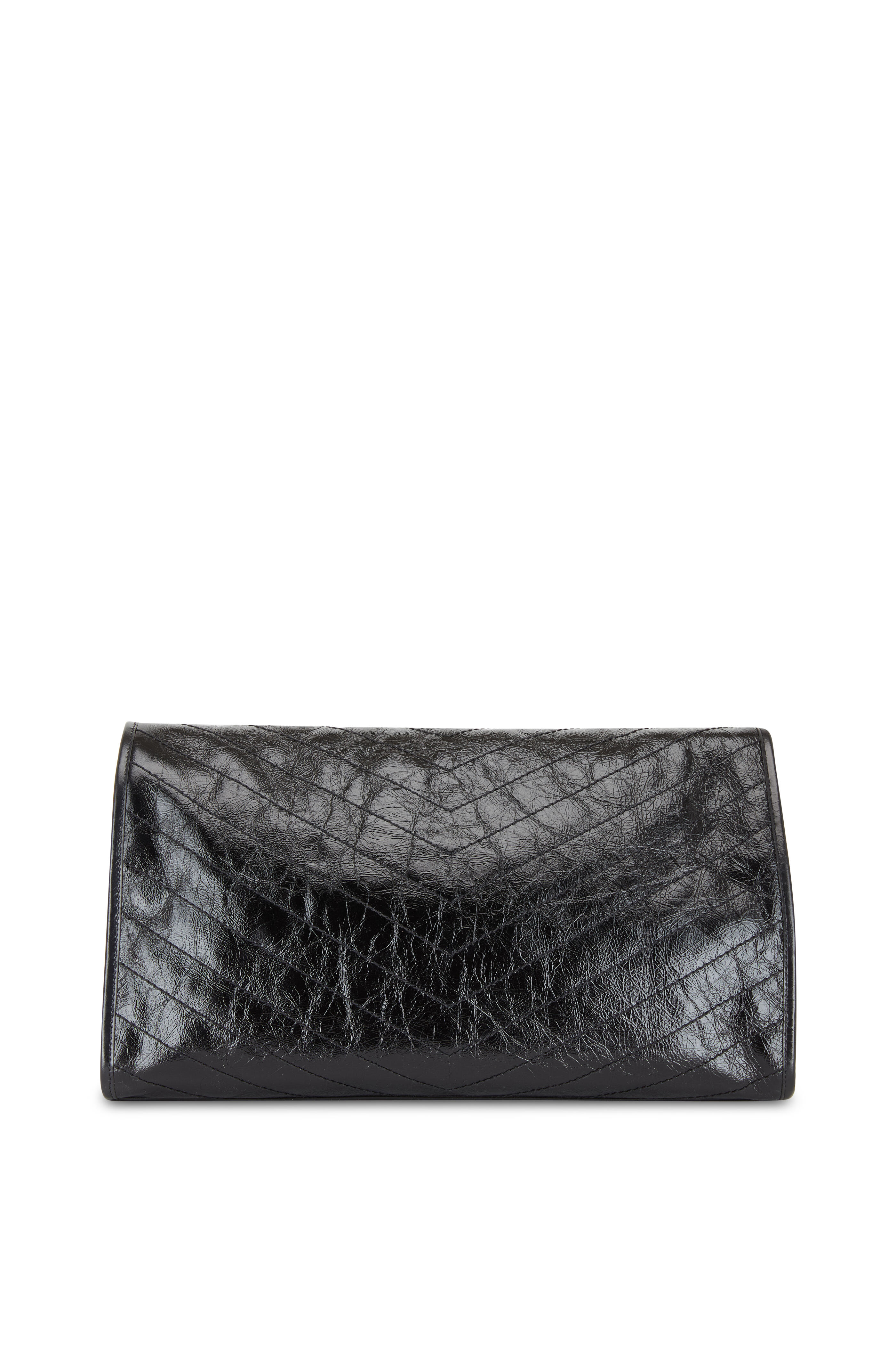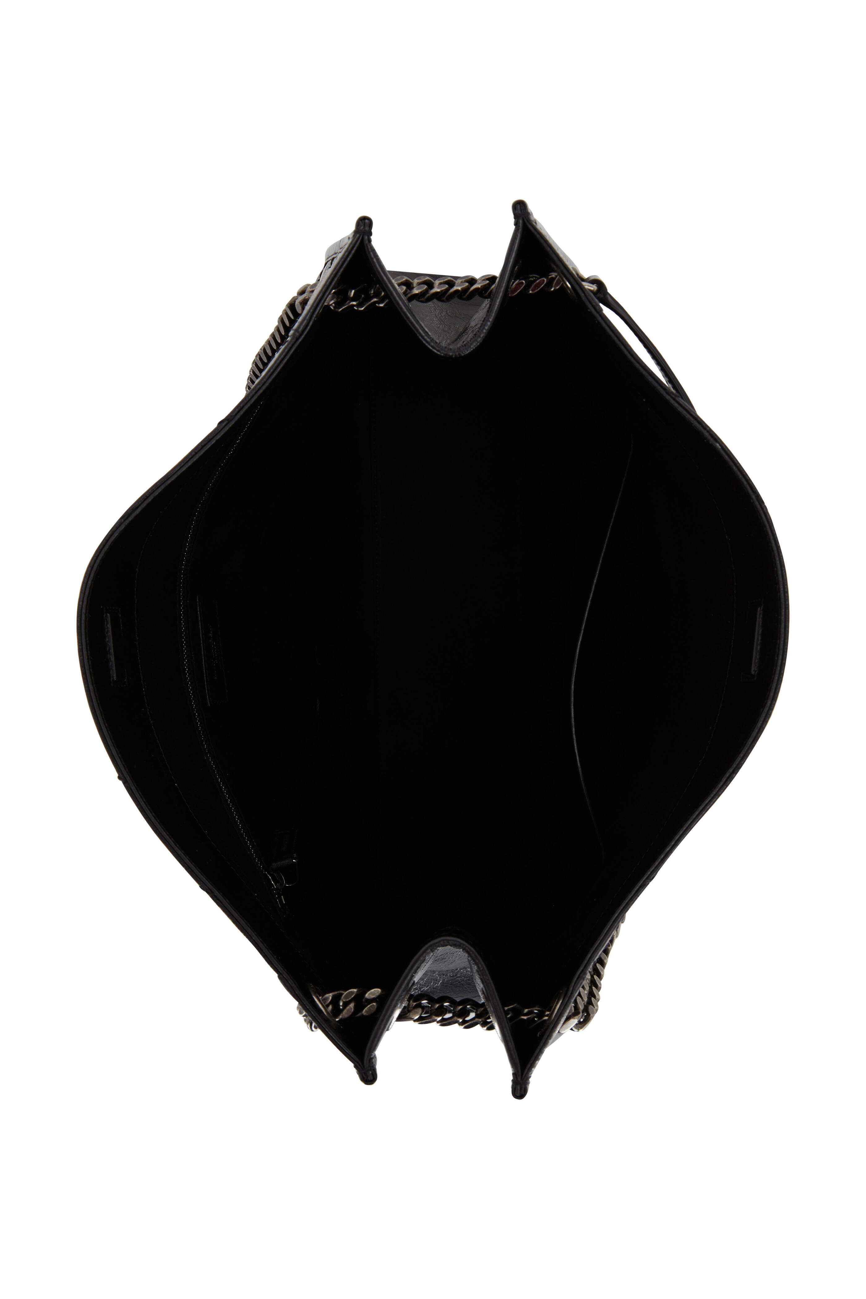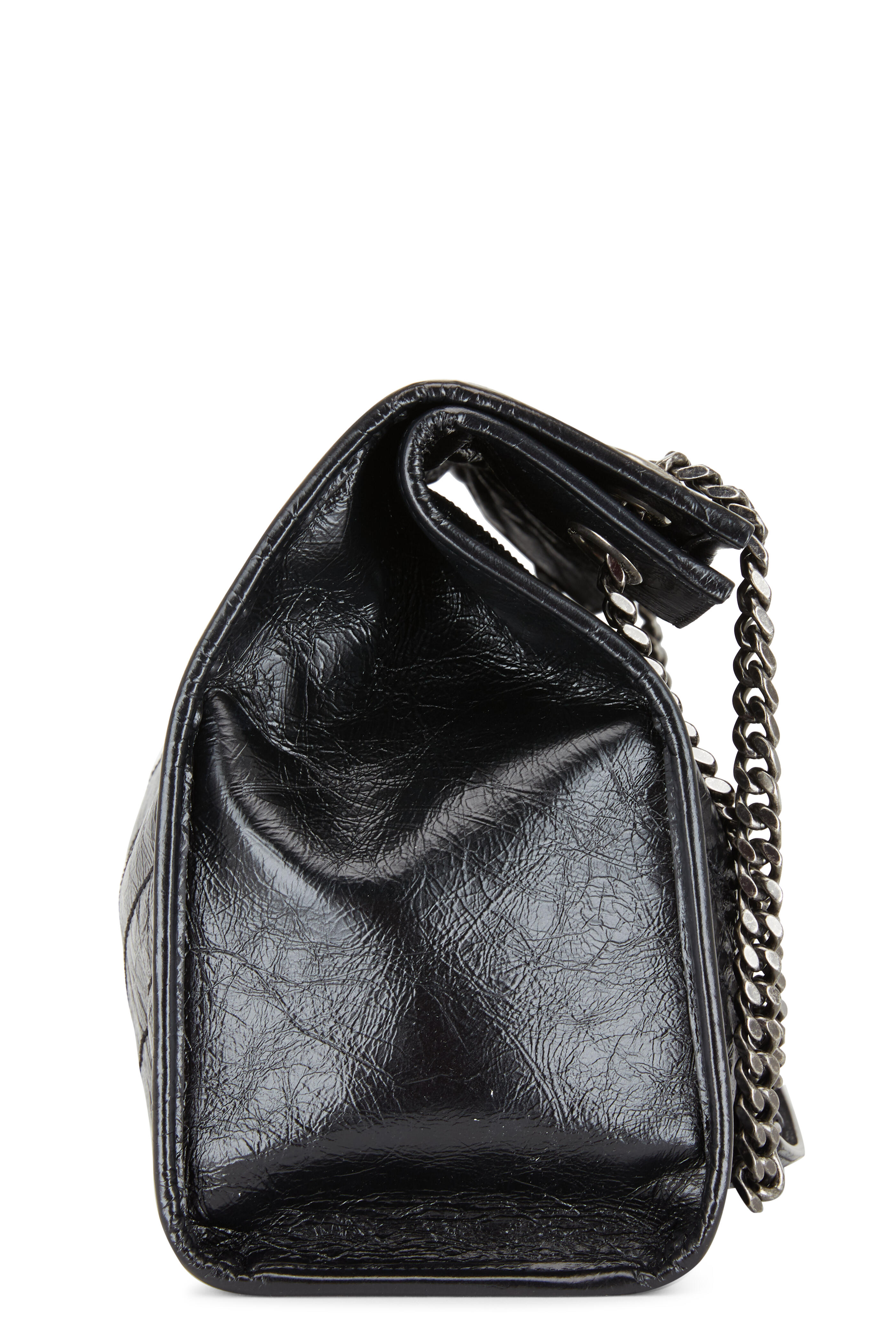 Quilted calfskin leather. Gunmetal chain with leather inset straps. Center concealed magnetic snap closure. Tonal lacquer logo detail. One interior zip pocket, one open pocket. Lined in canvas. Made in Italy. Width: 15". Height: 13". Depth: 5". Strap drop: 10".